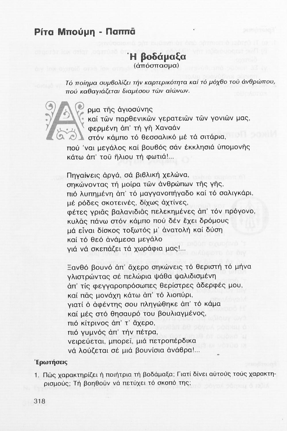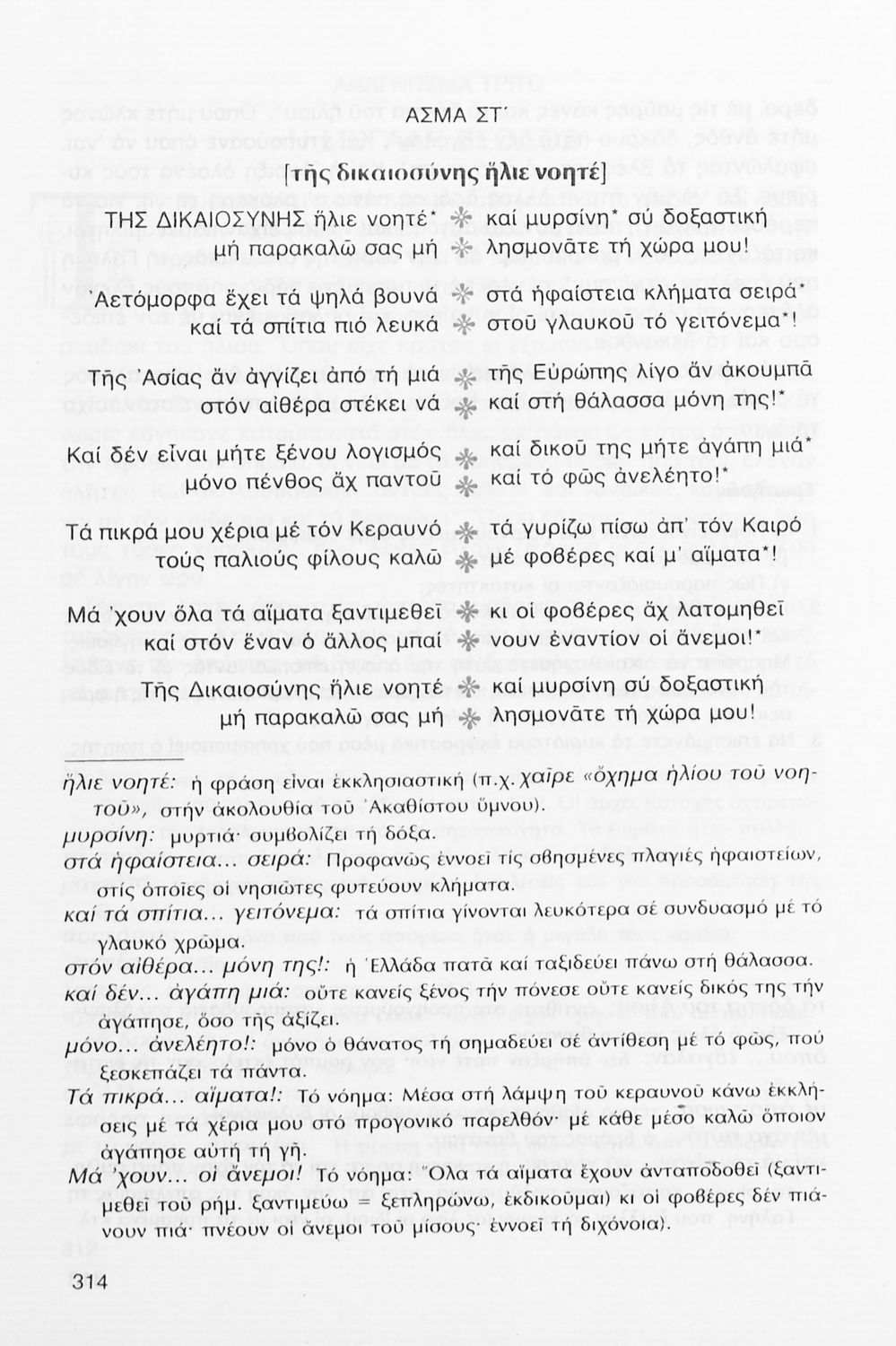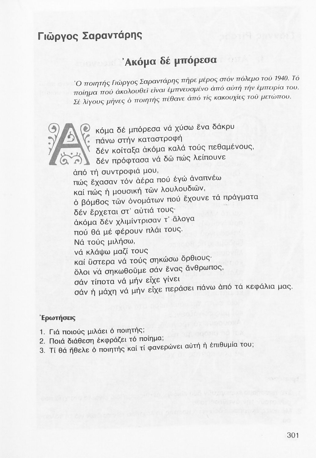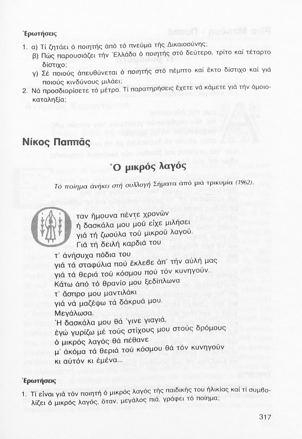 Σχολικό εγχειρίδιο Νέων Ελληνικών Γ΄ Γυμνασίου που περιλαμβάνει δημοτικά τραγούδια, και χαρακτηριστικά δείγματα της κρητικής λογοτεχνίας, της επτανησιακής και ρομαντικής σχολής, της Νέας Αθηναϊκής Σχολής και της νεότερης και μεταπολεμικής λογοτεχνίας. Περιέχει και έργα σύγχρονων ξένων συγγραφέων, βιογραφικά και εισαγωγικά σημειώματα.