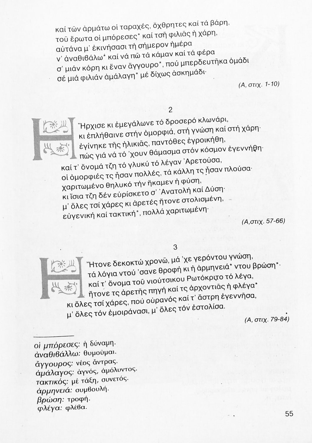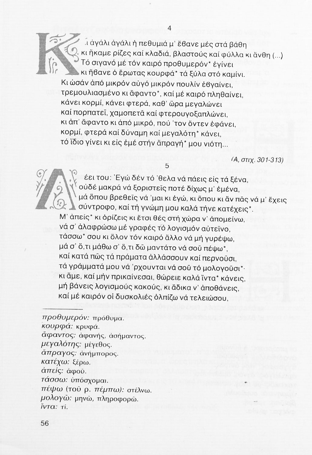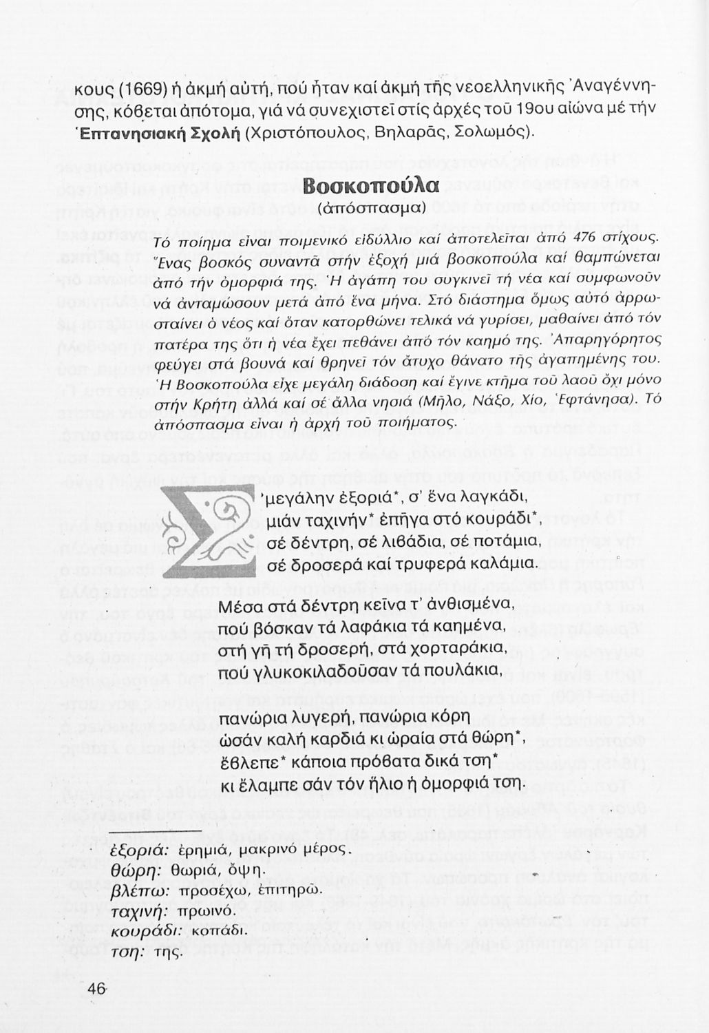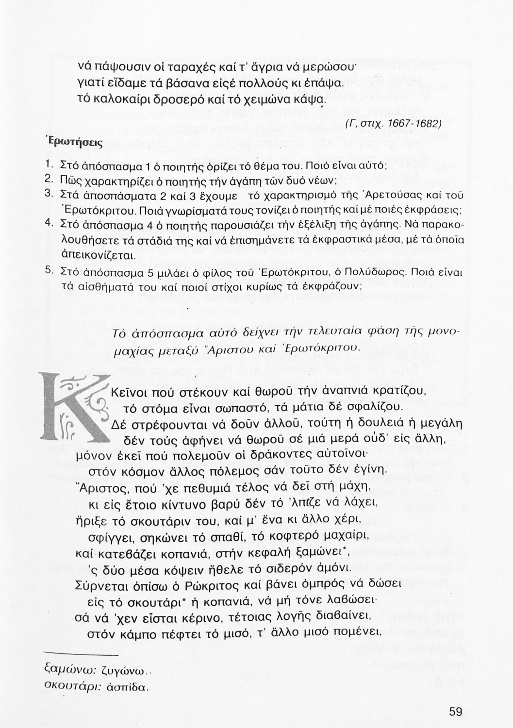 Σχολικό εγχειρίδιο Νέων Ελληνικών Γ΄ Γυμνασίου που περιλαμβάνει δημοτικά τραγούδια, και χαρακτηριστικά δείγματα της κρητικής λογοτεχνίας, της επτανησιακής και ρομαντικής σχολής, της Νέας Αθηναϊκής Σχολής και της νεότερης και μεταπολεμικής λογοτεχνίας. Περιέχει και έργα σύγχρονων ξένων συγγραφέων, βιογραφικά και εισαγωγικά σημειώματα.