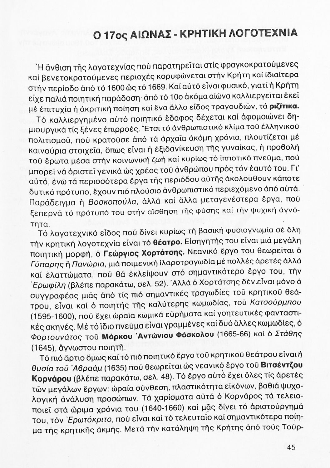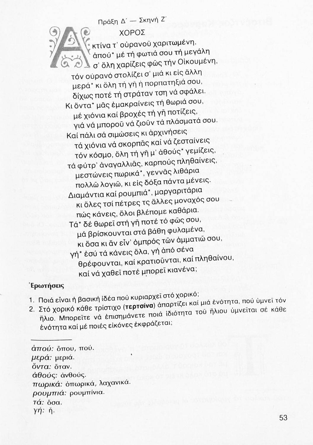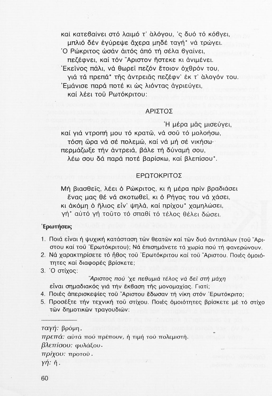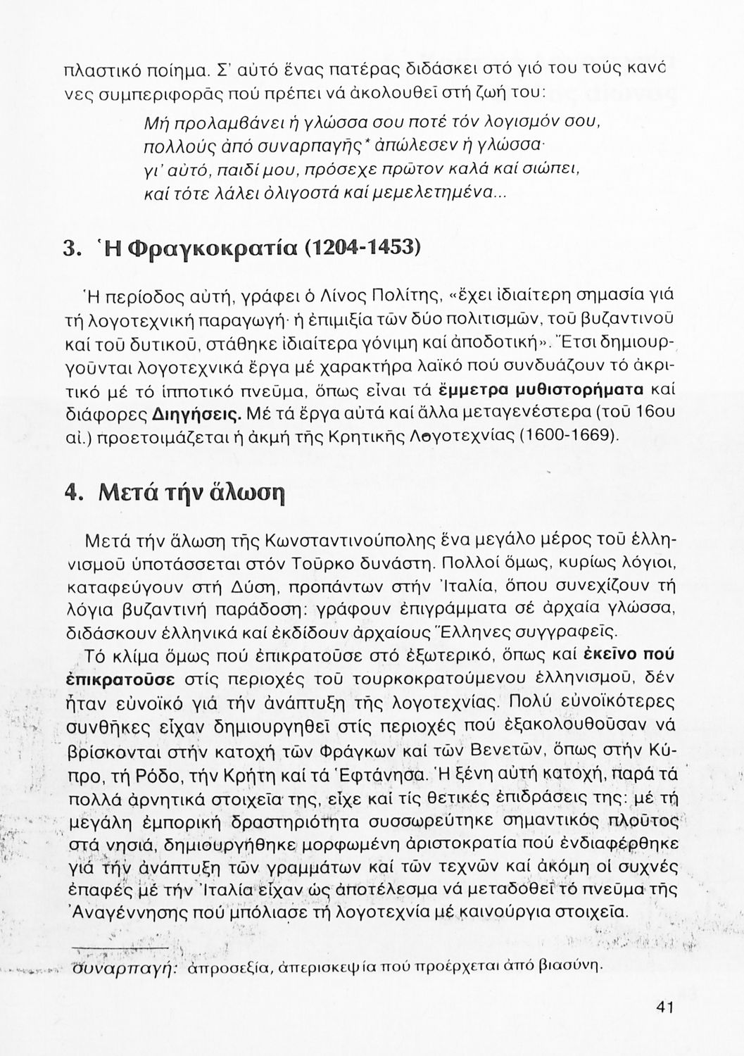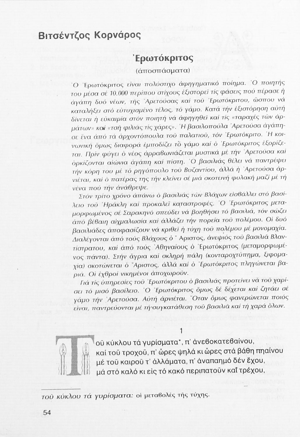 Σχολικό εγχειρίδιο Νέων Ελληνικών Γ΄ Γυμνασίου που περιλαμβάνει δημοτικά τραγούδια, και χαρακτηριστικά δείγματα της κρητικής λογοτεχνίας, της επτανησιακής και ρομαντικής σχολής, της Νέας Αθηναϊκής Σχολής και της νεότερης και μεταπολεμικής λογοτεχνίας. Περιέχει και έργα σύγχρονων ξένων συγγραφέων, βιογραφικά και εισαγωγικά σημειώματα.