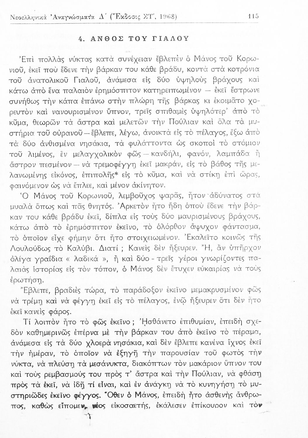 Σχολικό εγχειρίδιο Νέων Ελληνικών Δ' Γυμνασίου που περιλαμβάνει πεζά, ποιήματα και παροιμίες Ελλήνων συγγραφέων εμπνευσμένα από την θρησκευτική και κοινωνική ζωή, τη βυζαντινή ιστορία, την αρχαία και σύγχρονη ελληνική ιστορία, και την ελληνική φύση. Περιέχει παράρτημα με βιογραφίες των συγγραφέων και λεξιλόγιο. Φέρει το σύμβολο της δικτατορίας.