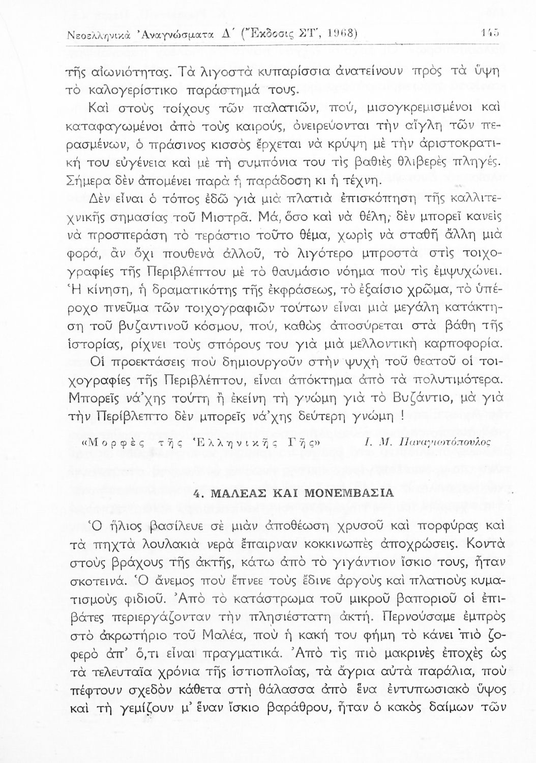 Σχολικό εγχειρίδιο Νέων Ελληνικών Δ' Γυμνασίου που περιλαμβάνει πεζά, ποιήματα και παροιμίες Ελλήνων συγγραφέων εμπνευσμένα από την θρησκευτική και κοινωνική ζωή, τη βυζαντινή ιστορία, την αρχαία και σύγχρονη ελληνική ιστορία, και την ελληνική φύση. Περιέχει παράρτημα με βιογραφίες των συγγραφέων και λεξιλόγιο. Φέρει το σύμβολο της δικτατορίας.