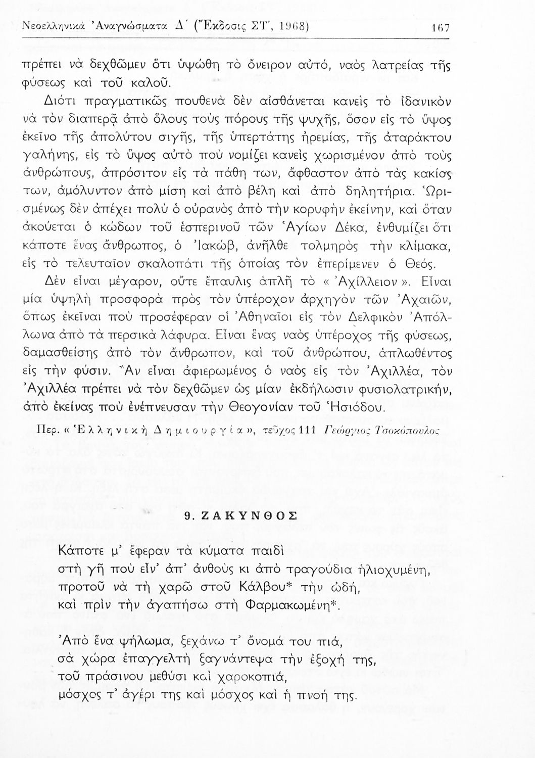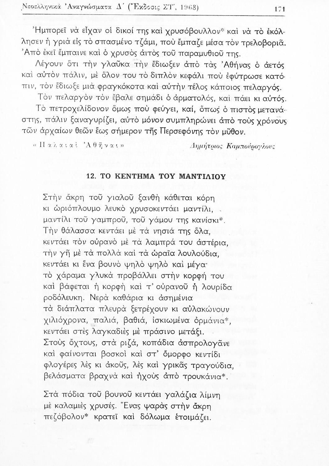 Σχολικό εγχειρίδιο Νέων Ελληνικών Δ΄ Γυμνασίου και Β΄ Αστικού Σχολείου που περιέχει πεζά και ποιήματα Ελλήνων συγγραφέων εμπνευσμένα από τη θρησκευτική και κοινωνική ζωή, την ελληνική μυθολογία, την αρχαία και