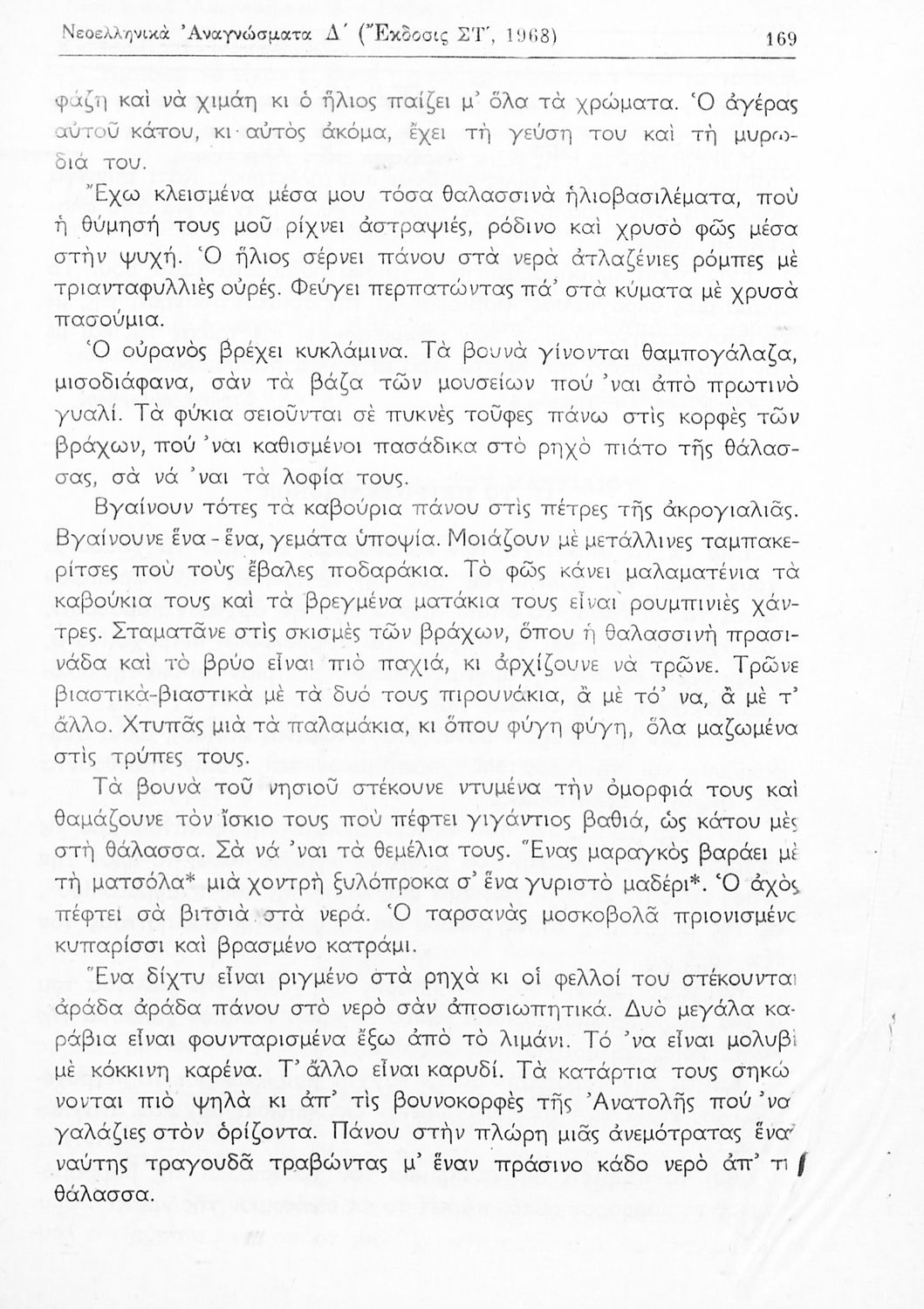 Σχολικό εγχειρίδιο Νέων Ελληνικών Δ' Γυμνασίου που περιλαμβάνει πεζά, ποιήματα και παροιμίες Ελλήνων συγγραφέων εμπνευσμένα από την θρησκευτική και κοινωνική ζωή, τη βυζαντινή ιστορία, την αρχαία και σύγχρονη ελληνική ιστορία, και την ελληνική φύση. Περιέχει παράρτημα με βιογραφίες των συγγραφέων και λεξιλόγιο. Φέρει το σύμβολο της δικτατορίας.