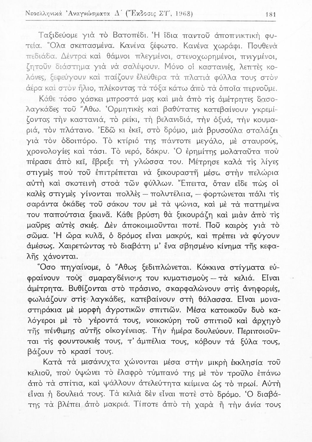 Σχολικό εγχειρίδιο Νέων Ελληνικών Δ' Γυμνασίου που περιλαμβάνει πεζά, ποιήματα και παροιμίες Ελλήνων συγγραφέων εμπνευσμένα από την θρησκευτική και κοινωνική ζωή, τη βυζαντινή ιστορία, την αρχαία και σύγχρονη ελληνική ιστορία, και την ελληνική φύση. Περιέχει παράρτημα με βιογραφίες των συγγραφέων και λεξιλόγιο. Φέρει το σύμβολο της δικτατορίας.