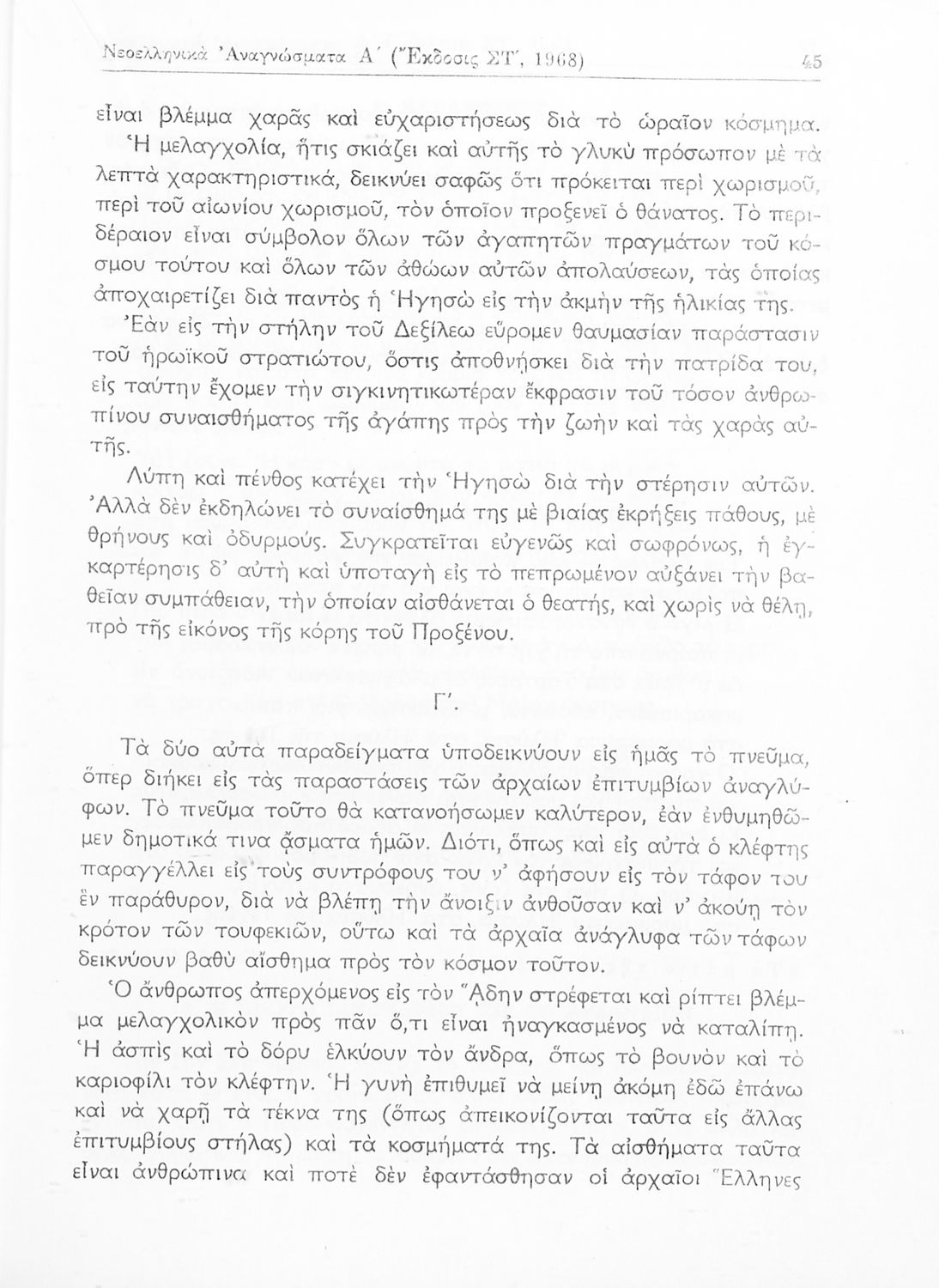 Σχολικό εγχειρίδιο Νέων Ελληνικών Δ΄ Γυμνασίου και Β΄ Αστικού Σχολείου που περιέχει πεζά και ποιήματα Ελλήνων συγγραφέων εμπνευσμένα από τη θρησκευτική και κοινωνική ζωή, την ελληνική μυθολογία, την αρχαία και