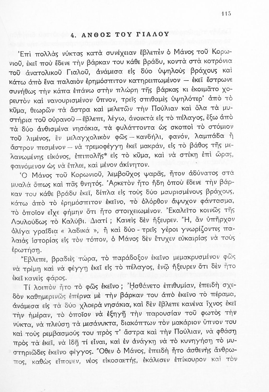 Σχολικό εγχειρίδιο Νέων Ελληνικών Δ' Γυμνασίου που περιλαμβάνει πεζά, ποιήματα και παροιμίες Ελλήνων συγγραφέων εμπνευσμένα από την θρησκευτική και κοινωνική ζωή, τη βυζαντινή ιστορία, την αρχαία και σύγχρονη ελληνική ιστορία, και την ελληνική φύση. Περιέχει παράρτημα με βιογραφίες των συγγραφέων και λεξιλόγιο. Φέρει το σύμβολο της δικτατορίας.
