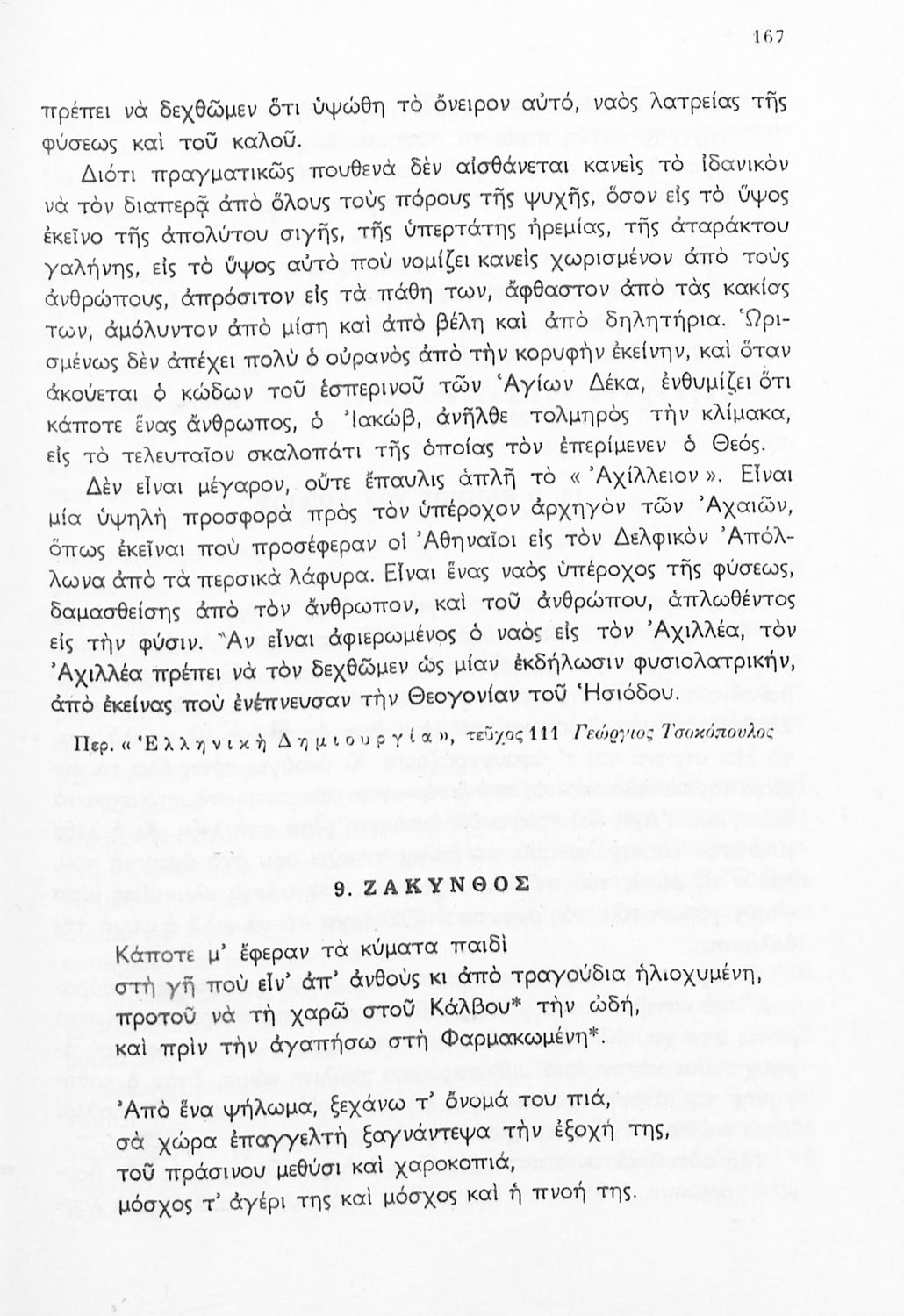 Σχολικό εγχειρίδιο Νέων Ελληνικών Δ' Γυμνασίου που περιλαμβάνει πεζά, ποιήματα και παροιμίες Ελλήνων συγγραφέων εμπνευσμένα από την θρησκευτική και κοινωνική ζωή, τη βυζαντινή ιστορία, την αρχαία και σύγχρονη ελληνική ιστορία, και την ελληνική φύση. Περιέχει παράρτημα με βιογραφίες των συγγραφέων και λεξιλόγιο. Φέρει το σύμβολο της δικτατορίας.