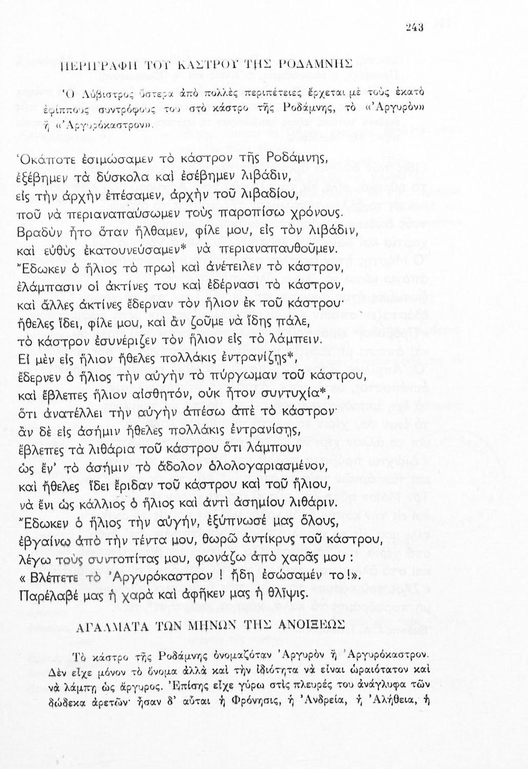 Σχολικό εγχειρίδιο Νέων Ελληνικών Δ' Γυμνασίου που περιλαμβάνει πεζά, ποιήματα και παροιμίες Ελλήνων συγγραφέων εμπνευσμένα από την θρησκευτική και κοινωνική ζωή, τη βυζαντινή ιστορία, την αρχαία και σύγχρονη ελληνική ιστορία, και την ελληνική φύση. Περιέχει παράρτημα με βιογραφίες των συγγραφέων και λεξιλόγιο. Φέρει το σύμβολο της δικτατορίας.