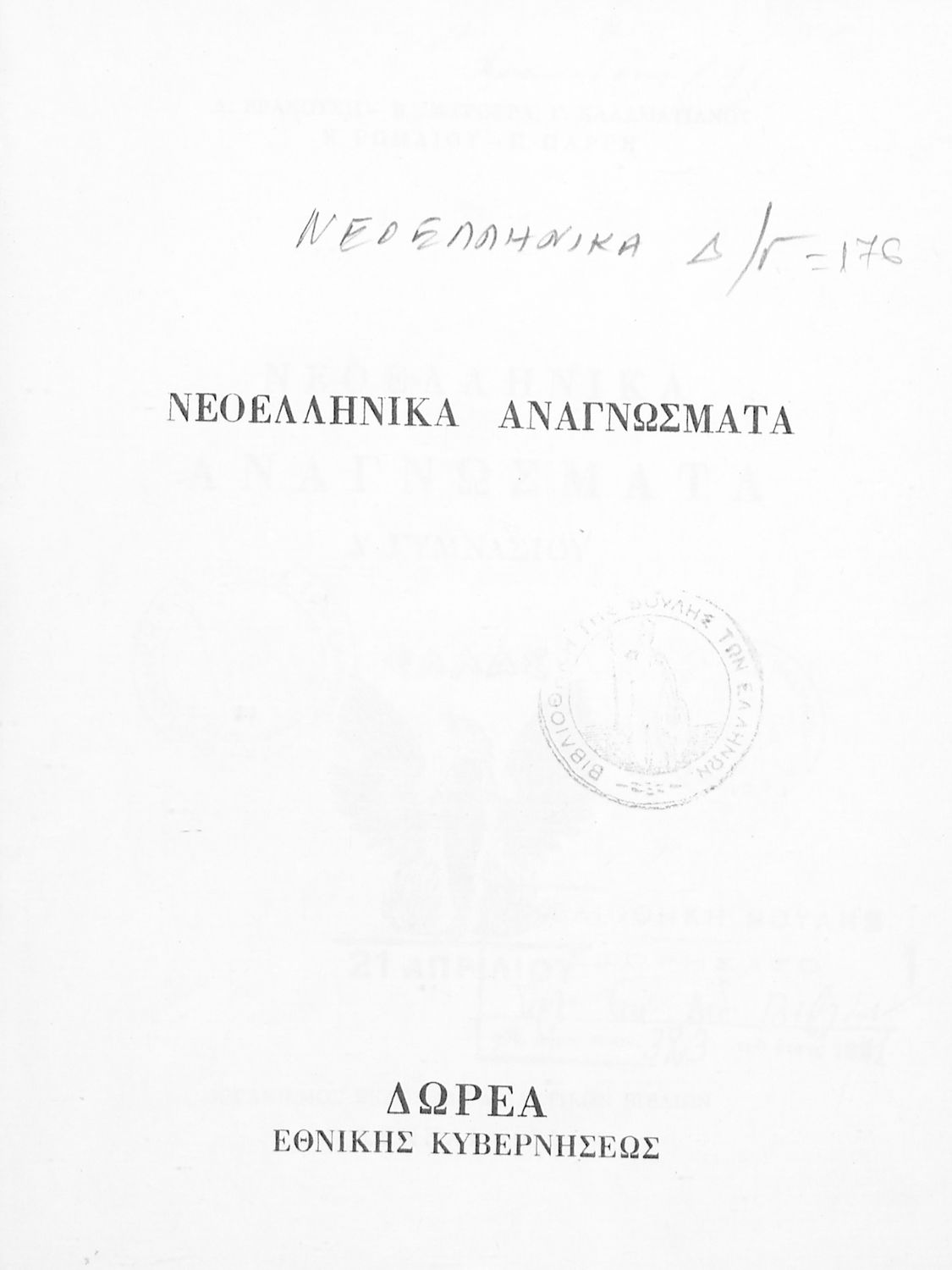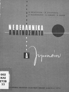 Βαθμίδα εκπαίδευσης: Δευτεροβάθμια Τάξη: Δ' Γυμνασίου Μάθημα: Νέα Ελληνικά Γλώσσα: Καθαρεύουσα / Απλή καθαρεύουσα / Δημοτική Παρουσίαση περιεχομένου: Σχολικό εγχειρίδιο Νέων Ελληνικών Δ' Γυμνασίου που περιλαμβάνει πεζά, ποιήματα και παροιμίες Ελλήνων συγγραφέων εμπνευσμένα από την θρησκευτική και κοινωνική ζωή, τη βυζαντινή ιστορία, την αρχαία και σύγχρονη ελληνική ιστορία, και την ελληνική φύση. Περιέχει παράρτημα με βιογραφίες των συγγραφέων και λεξιλόγιο. Φέρει το σύμβολο της δικτατορίας. |