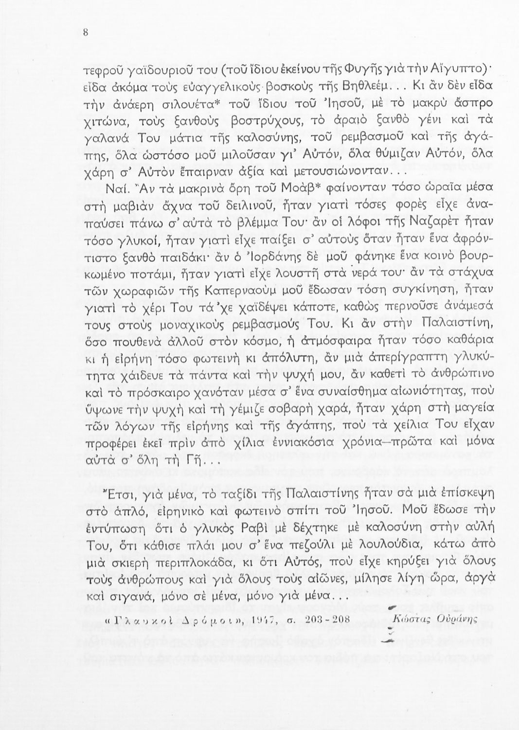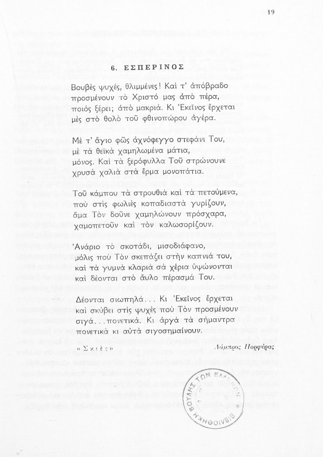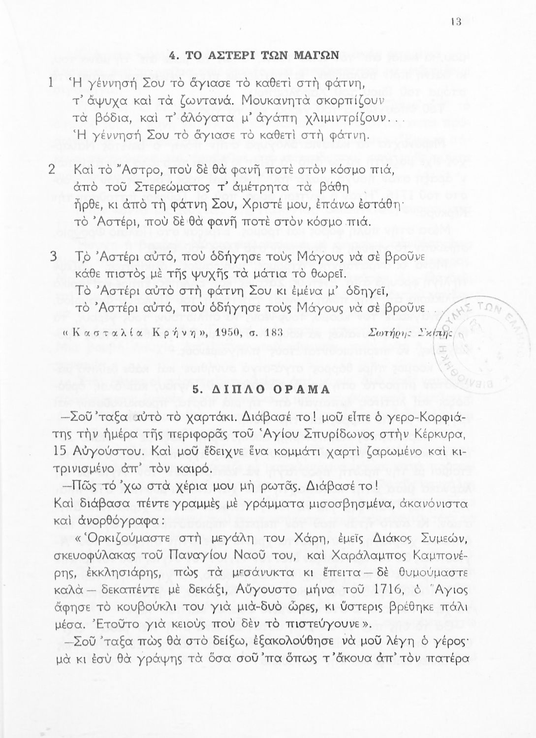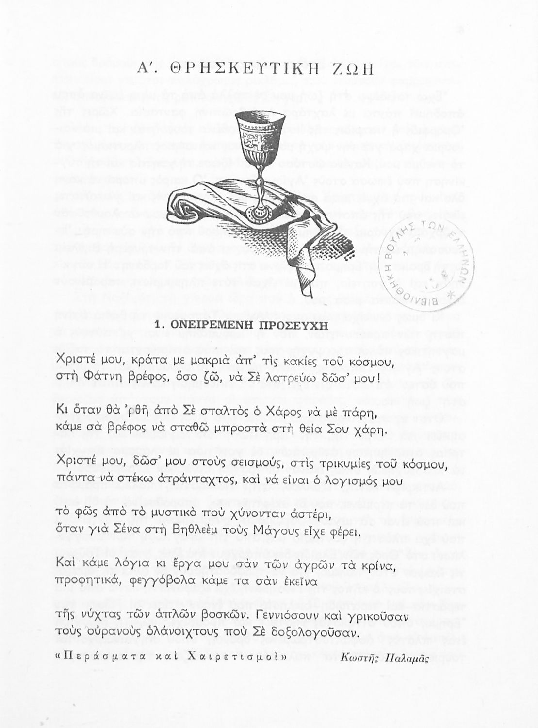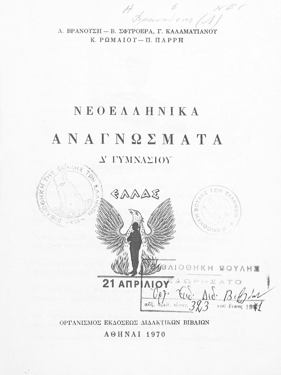 Σχολικό εγχειρίδιο Νέων Ελληνικών Δ' Γυμνασίου που περιλαμβάνει πεζά, ποιήματα και παροιμίες Ελλήνων συγγραφέων εμπνευσμένα από την θρησκευτική και κοινωνική ζωή, τη βυζαντινή ιστορία, την αρχαία και σύγχρονη ελληνική ιστορία, και την ελληνική φύση. Περιέχει παράρτημα με βιογραφίες των συγγραφέων και λεξιλόγιο. Φέρει το σύμβολο της δικτατορίας.