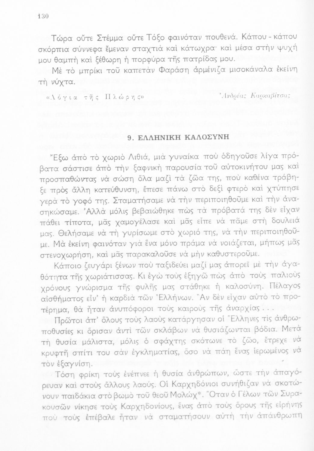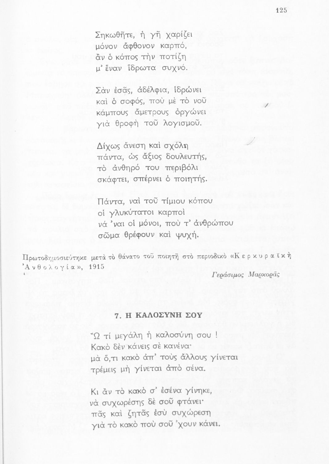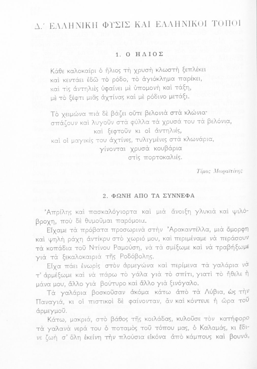 Σχολικό εγχειρίδιο Νέων Ελληνικών Δ' Γυμνασίου που περιλαμβάνει πεζά, ποιήματα και παροιμίες Ελλήνων συγγραφέων εμπνευσμένα από την θρησκευτική και κοινωνική ζωή, τη βυζαντινή ιστορία, την αρχαία και σύγχρονη ελληνική ιστορία, και την ελληνική φύση. Περιέχει παράρτημα με βιογραφίες των συγγραφέων και λεξιλόγιο. Φέρει το σύμβολο της δικτατορίας.