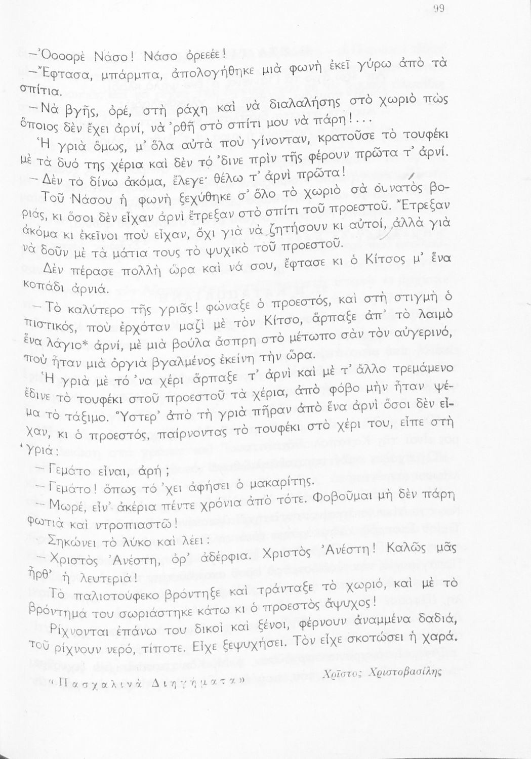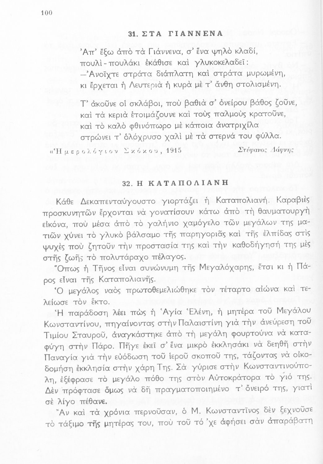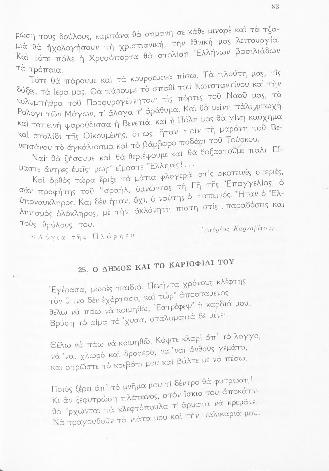 Σχολικό εγχειρίδιο Νέων Ελληνικών Δ΄ Γυμνασίου Θηλέων που περιλαμβάνει πεζά, ποιήματα και δημοτικά τραγούδια εμπνευσμένα από την σύγχρονη ελληνική ιστορία και την οικογενειακή και θρησκευτική ζωή. Περιέχει και