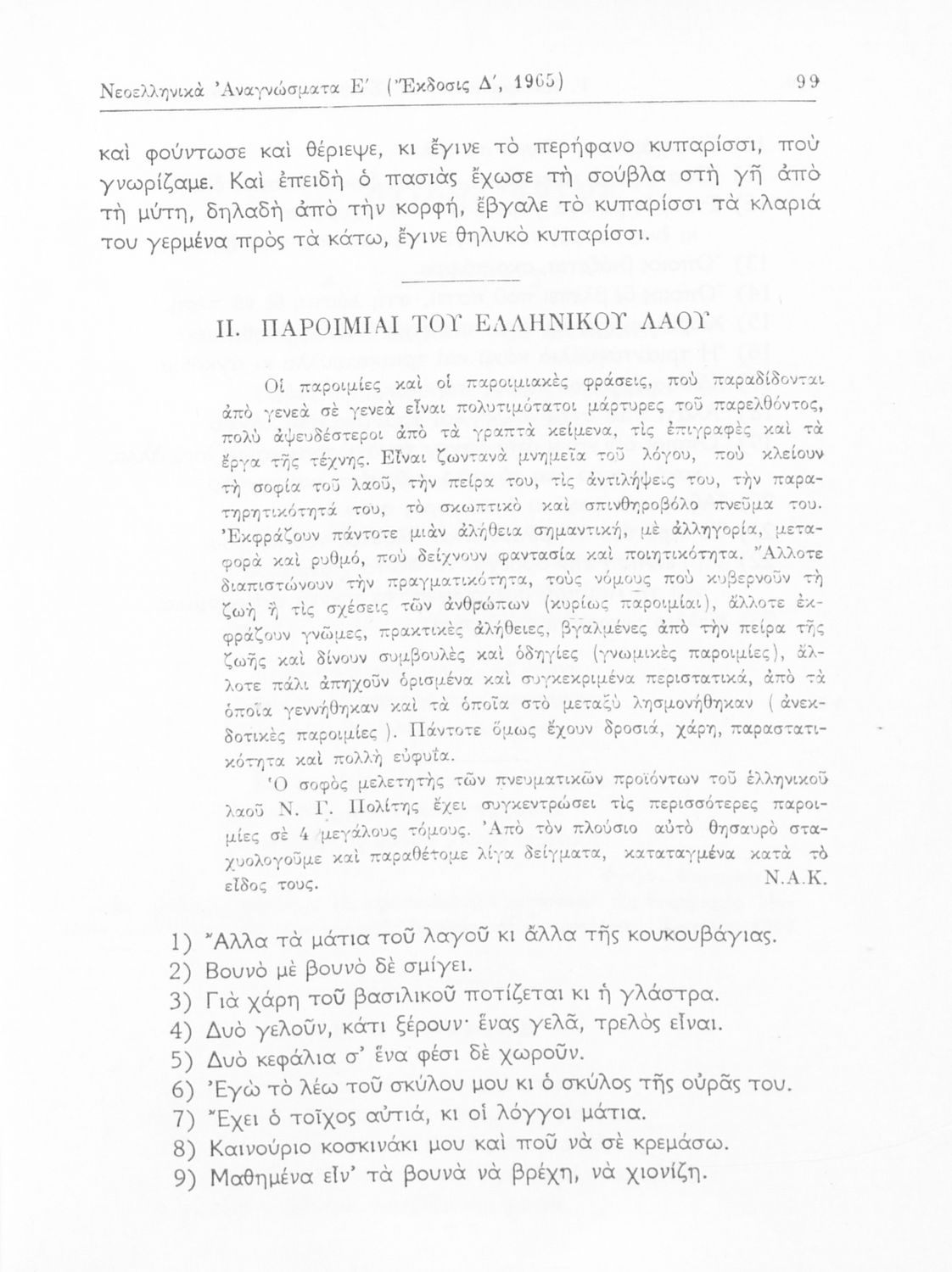 Σχολικό εγχειρίδιο Νέων Ελληνικών Ε΄ Γυμνασίου που περιλαμβάνει κείμενα Ελλήνων συγγραφέων και δημοτικά τραγούδια με θέματα από την σύγχρονη ελληνική ιστορία, τη θρησκευτική παράδοση, την οικογενειακή ζωή, και