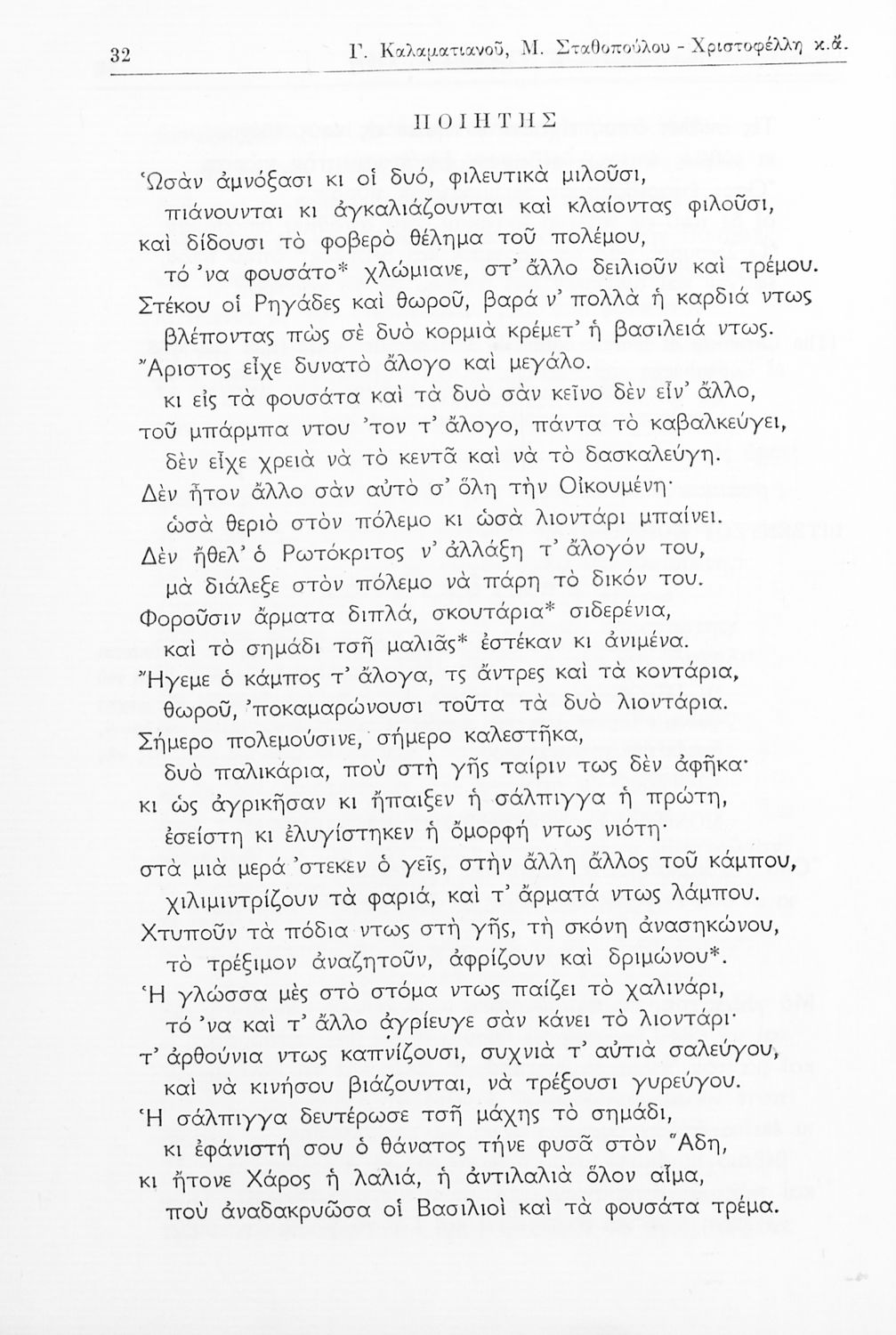 Βαθμίδα εκπαίδευσης: Δευτεροβάθμια Τάξη: Ε' Γυμνασίου Μάθημα: Νέα Ελληνικά Γλώσσα: Απλή καθαρεύουσα Παρουσίαση περιεχομένου: Σχολικό εγχειρίδιο της Ε΄ Γυμνασίου για το μάθημα των Νέων Ελληνικών. Περιέχει πεζά και ποιήματα από Ελλήνων και ξένων λογοτεχνών από τις συλλογές των συγγραφέων. Διαθέτει λεξικό και σύντομα βιογραφικά στοιχεία των Λογοτεχνών. |