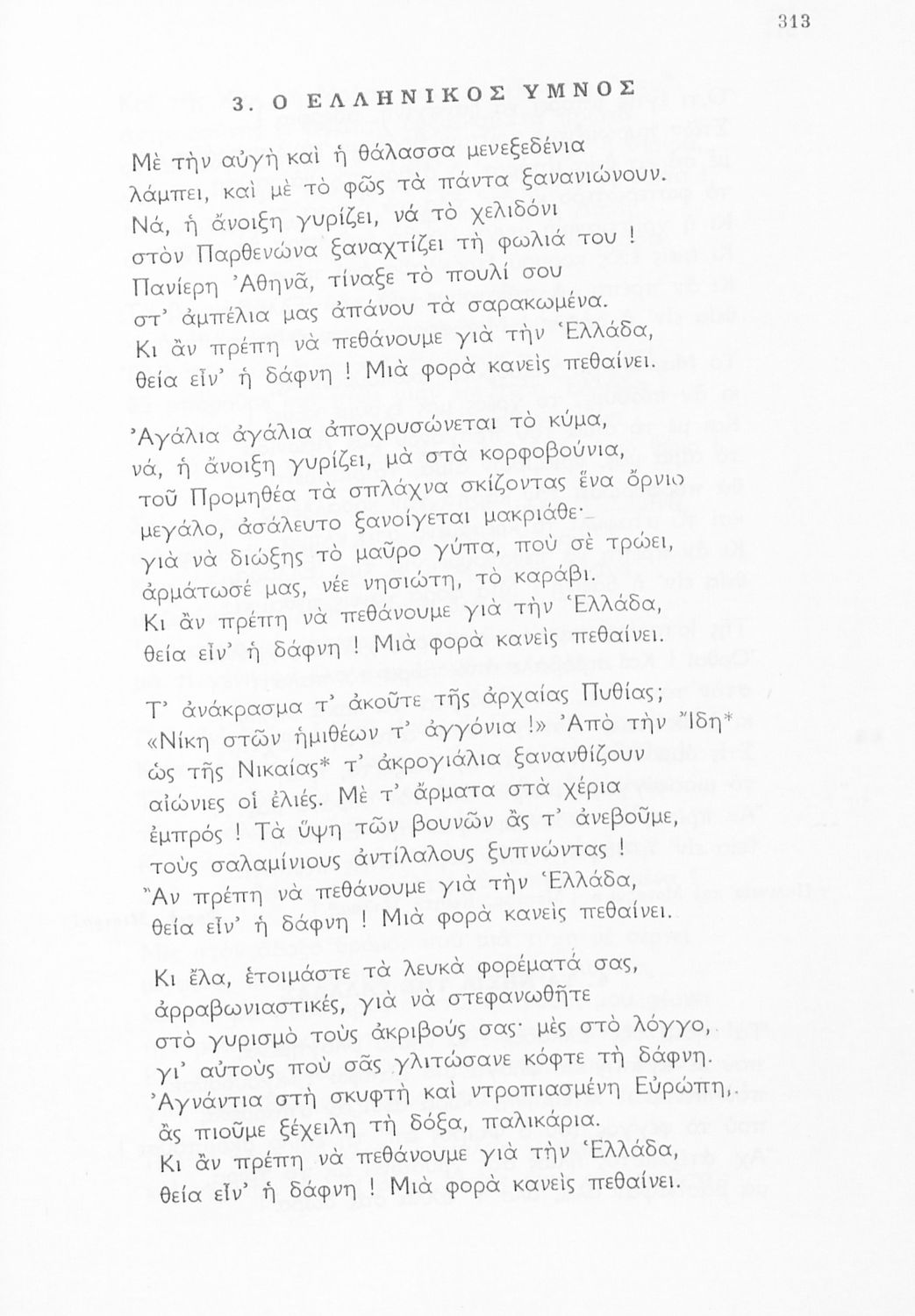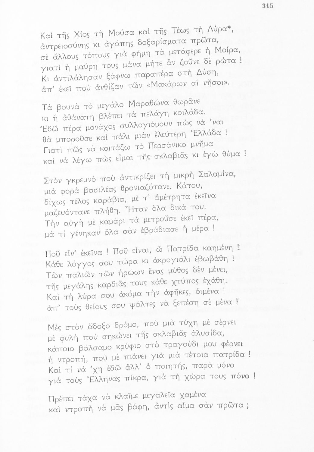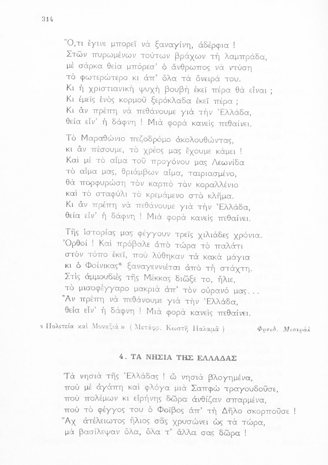 Σχολικό εγχειρίδιο Νέων Ελληνικών Ε΄ Γυμνασίου που περιέχει πεζά και ποιήματα συγγραφέων της βυζαντινής και μεταβυζαντινής περιόδου πατριωτικού και θρησκευτικού περιεχομένου. Περιλαμβάνει και πεζά και ποιήματα Ελλήνων και δημοτικά τραγούδια πατριωτικού περιεχομένου και παράρτημα με βιογραφίες των συγγραφέων και λεξιλόγιο. Φέρει το σύμβολο της δικτατορίας.