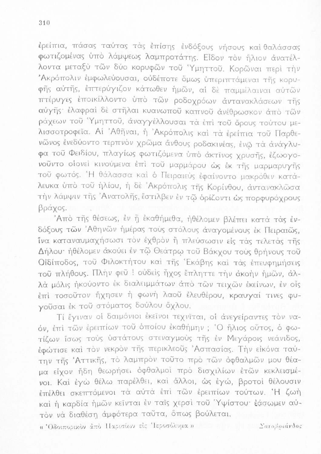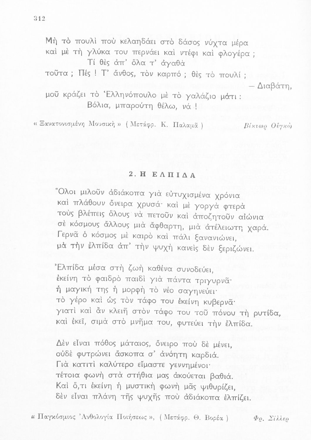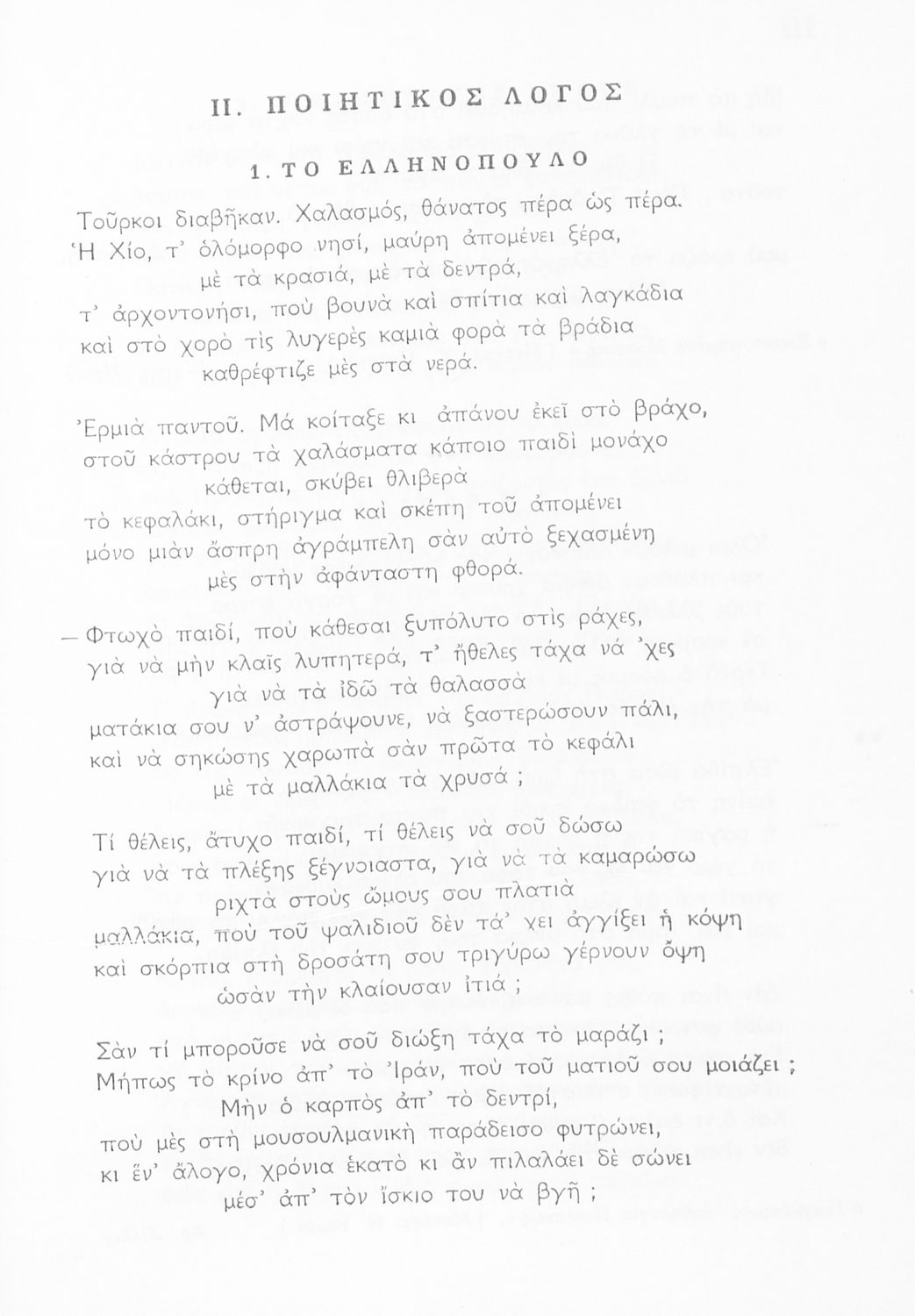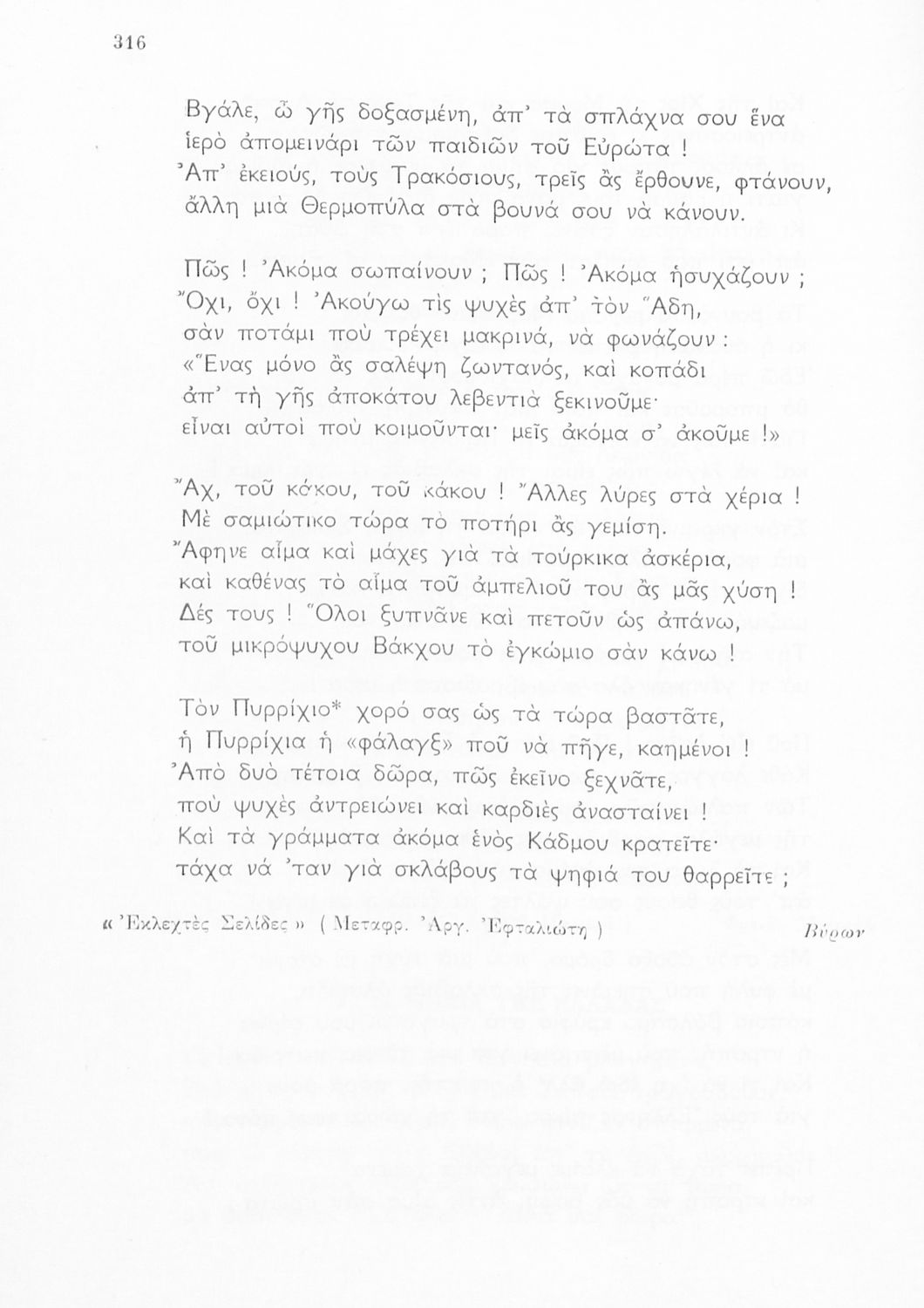 Σχολικό εγχειρίδιο Νέων Ελληνικών Ε΄ Γυμνασίου που περιέχει πεζά και ποιήματα συγγραφέων της βυζαντινής και μεταβυζαντινής περιόδου πατριωτικού και θρησκευτικού περιεχομένου. Περιλαμβάνει και πεζά και ποιήματα Ελλήνων και δημοτικά τραγούδια πατριωτικού περιεχομένου και παράρτημα με βιογραφίες των συγγραφέων και λεξιλόγιο. Φέρει το σύμβολο της δικτατορίας.