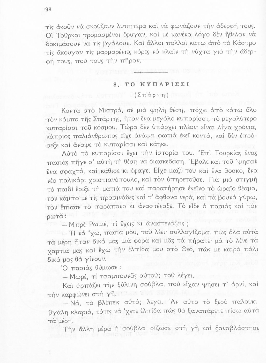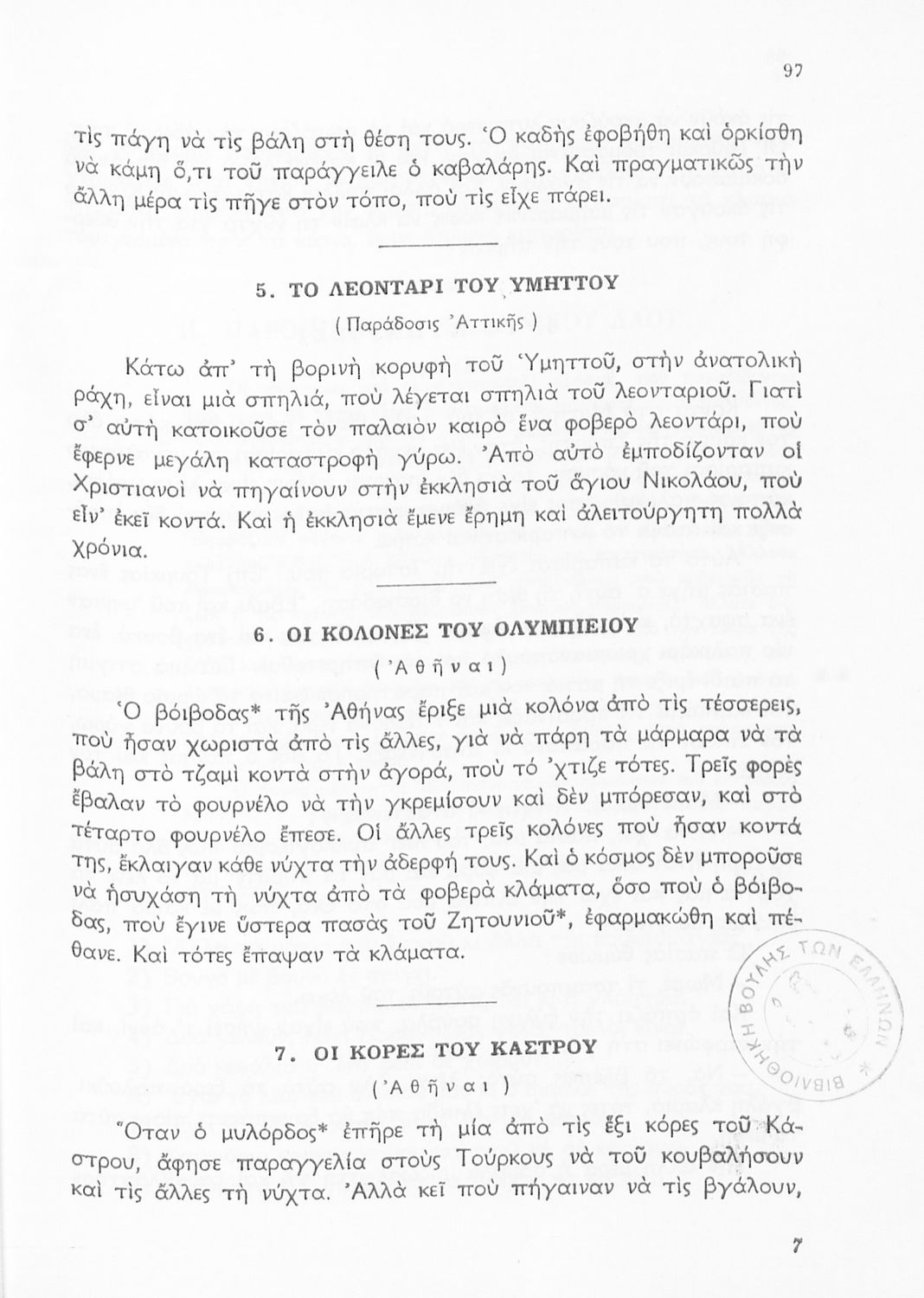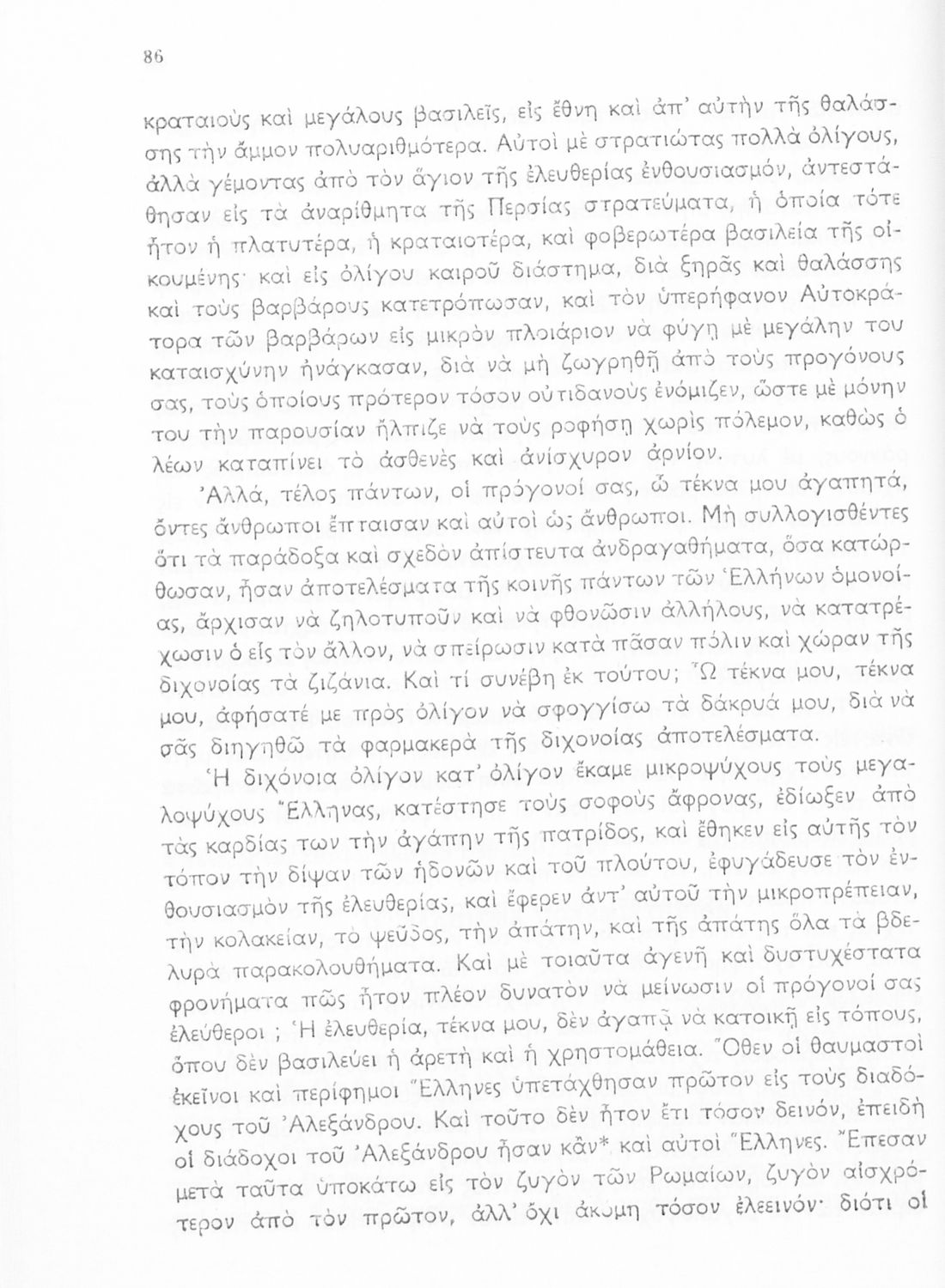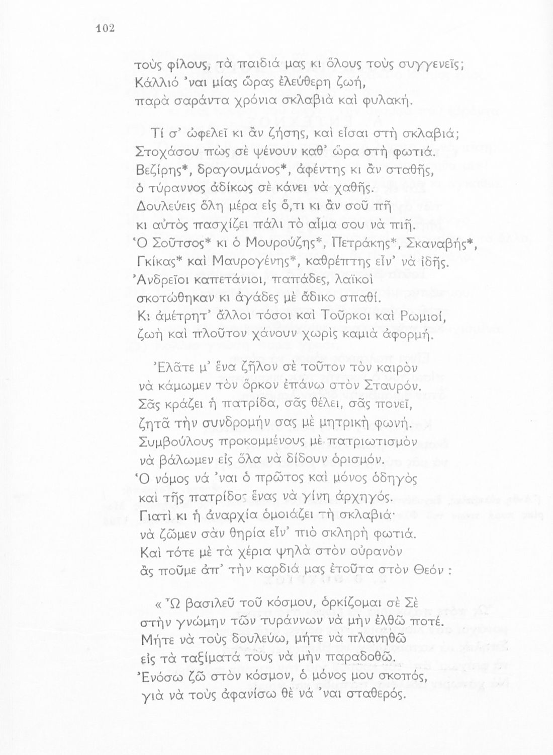Σχολικό εγχειρίδιο Νέων Ελληνικών Ε΄ Γυμνασίου που περιέχει πεζά και ποιήματα συγγραφέων της βυζαντινής και μεταβυζαντινής περιόδου πατριωτικού και θρησκευτικού περιεχομένου. Περιλαμβάνει και πεζά και ποιήματα Ελλήνων και δημοτικά τραγούδια πατριωτικού περιεχομένου και παράρτημα με βιογραφίες των συγγραφέων και λεξιλόγιο. Φέρει το σύμβολο της δικτατορίας.
