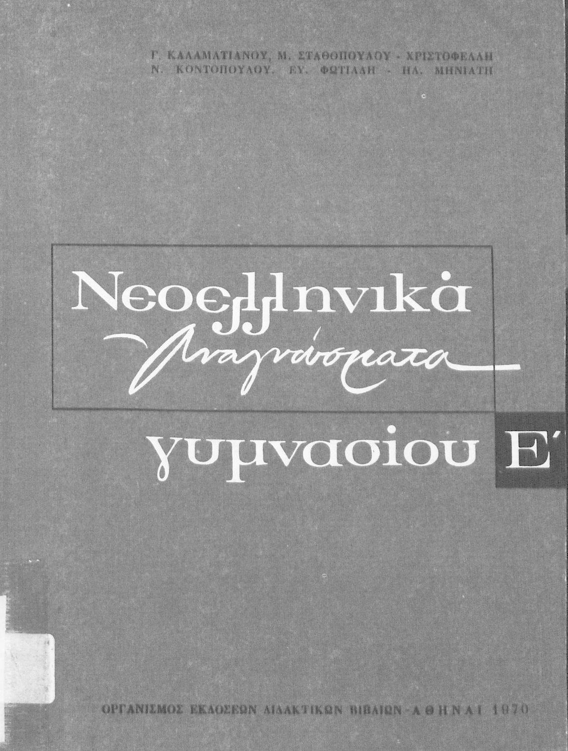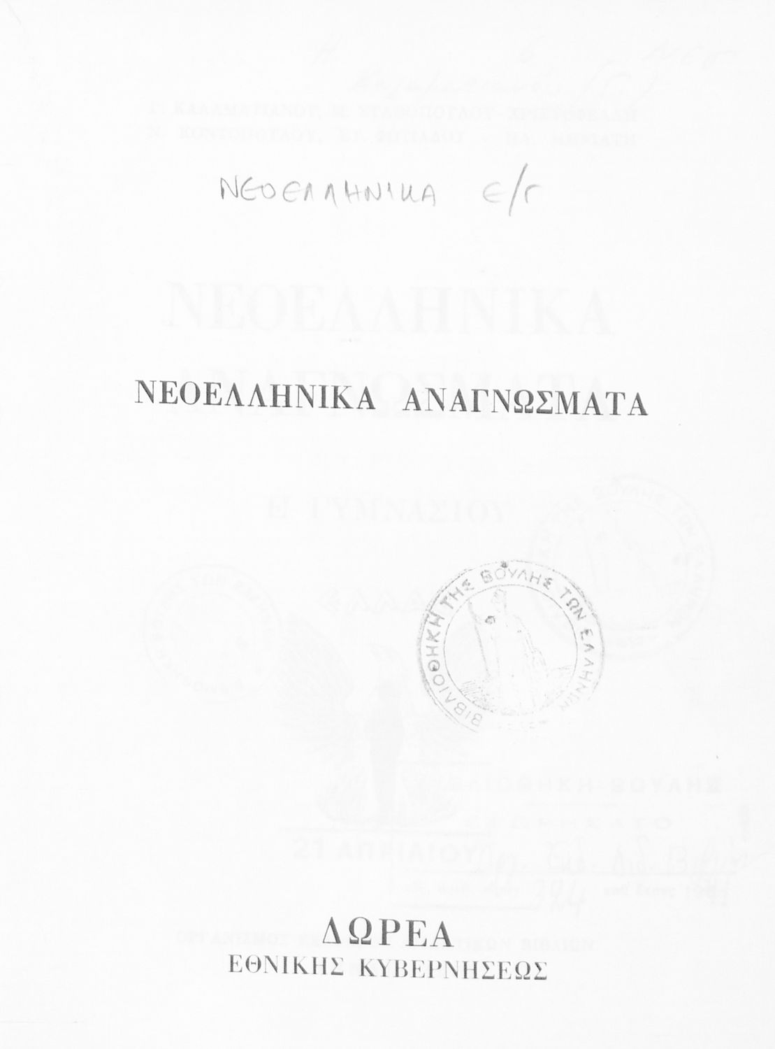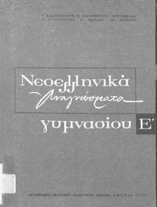 Βαθμίδα εκπαίδευσης: Δευτεροβάθμια Τάξη: Ε' Γυμνασίου Μάθημα: Νέα Ελληνικά Γλώσσα: Δημοτική, Καθαρεύουσα Παρουσίαση περιεχομένου: Σχολικό εγχειρίδιο Νέων Ελληνικών Ε΄ Γυμνασίου που περιέχει πεζά και ποιήματα συγγραφέων της βυζαντινής και μεταβυζαντινής περιόδου πατριωτικού και θρησκευτικού περιεχομένου. Περιλαμβάνει και πεζά και ποιήματα Ελλήνων και δημοτικά τραγούδια πατριωτικού περιεχομένου και παράρτημα με βιογραφίες των συγγραφέων και λεξιλόγιο. Φέρει το σύμβολο της δικτατορίας. |