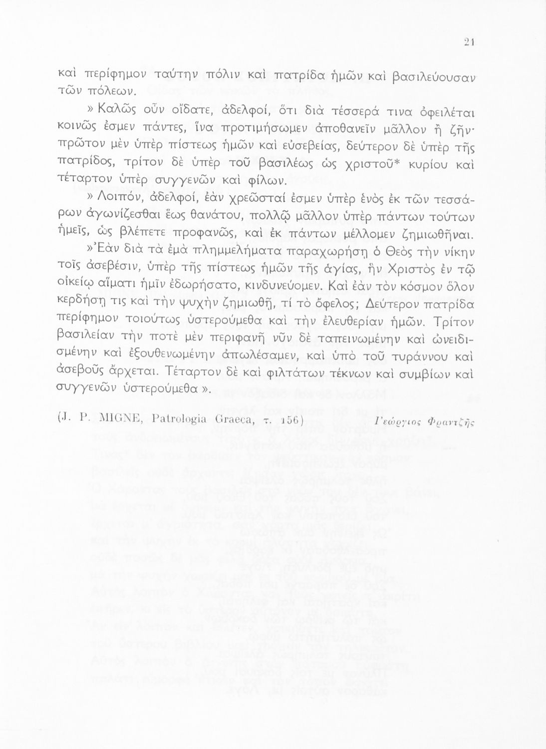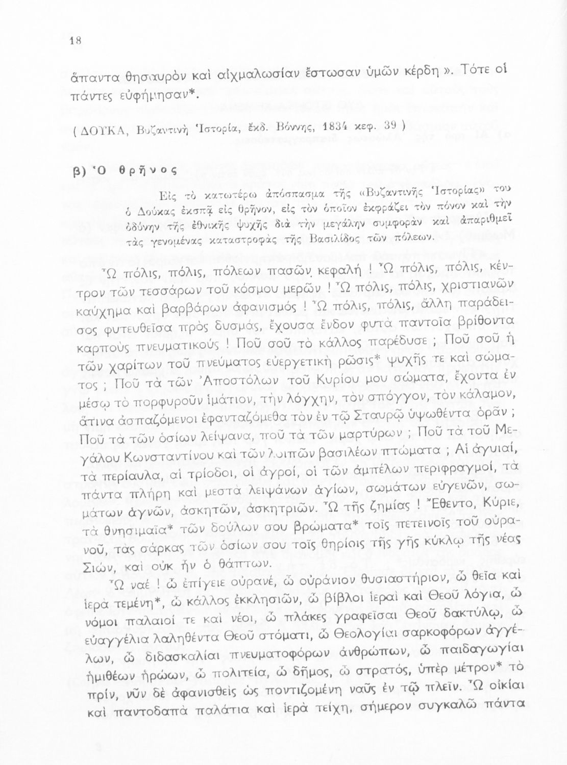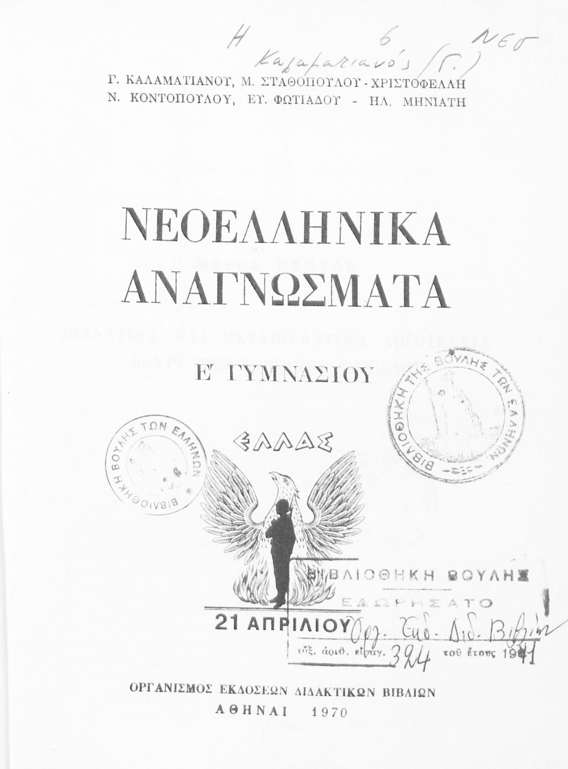 Σχολικό εγχειρίδιο Νέων Ελληνικών Ε΄ Γυμνασίου που περιέχει πεζά και ποιήματα συγγραφέων της βυζαντινής και μεταβυζαντινής περιόδου πατριωτικού και θρησκευτικού περιεχομένου. Περιλαμβάνει και πεζά και ποιήματα Ελλήνων και δημοτικά τραγούδια πατριωτικού περιεχομένου και παράρτημα με βιογραφίες των συγγραφέων και λεξιλόγιο. Φέρει το σύμβολο της δικτατορίας.