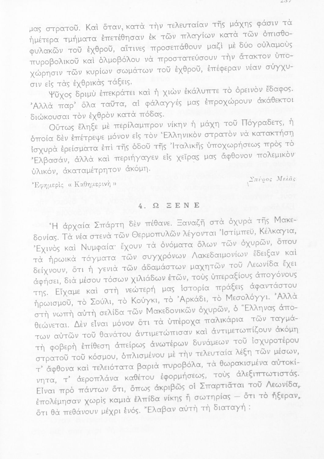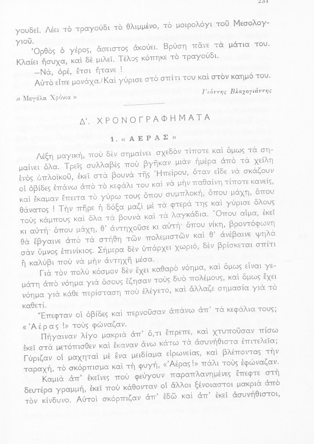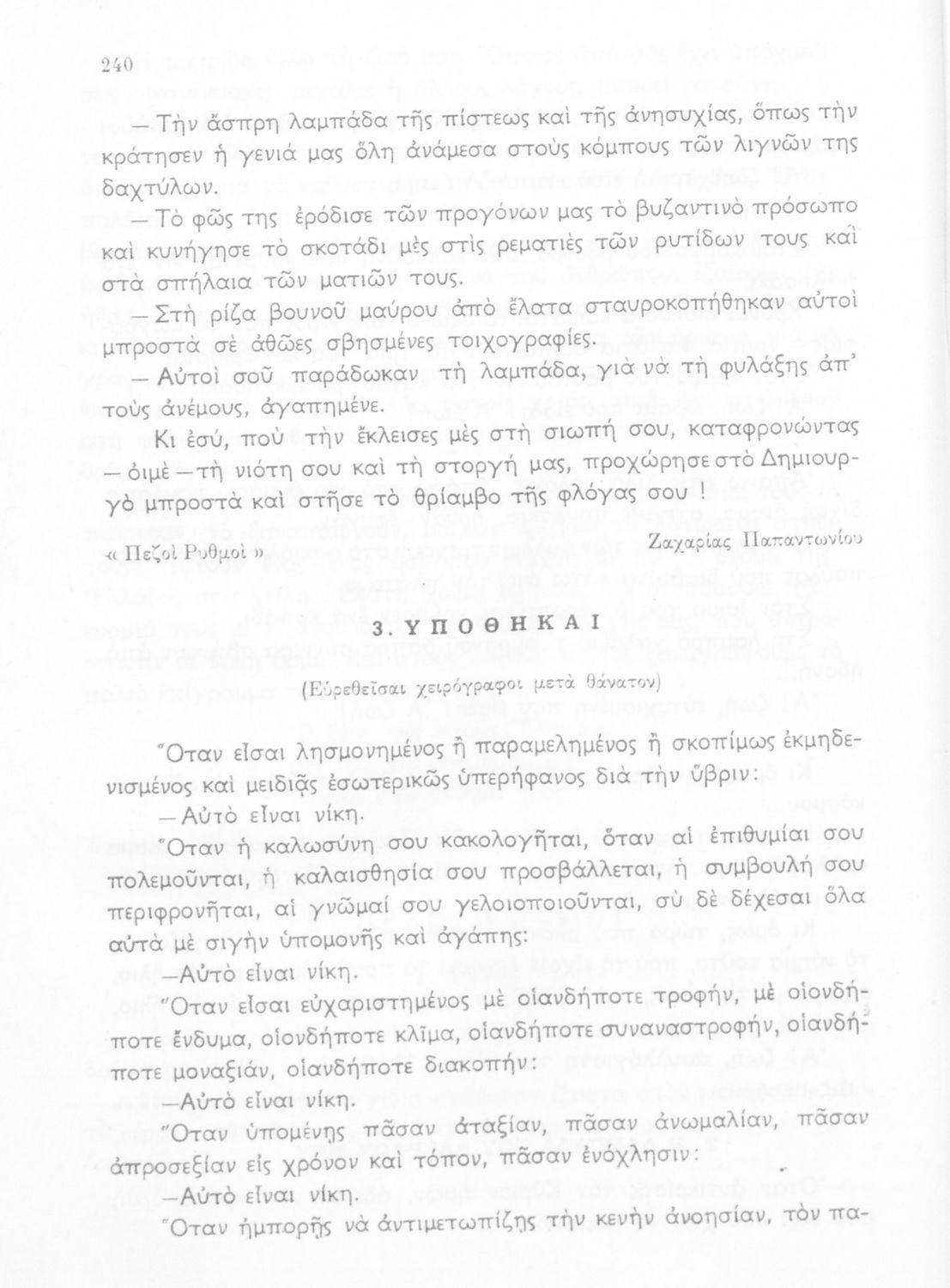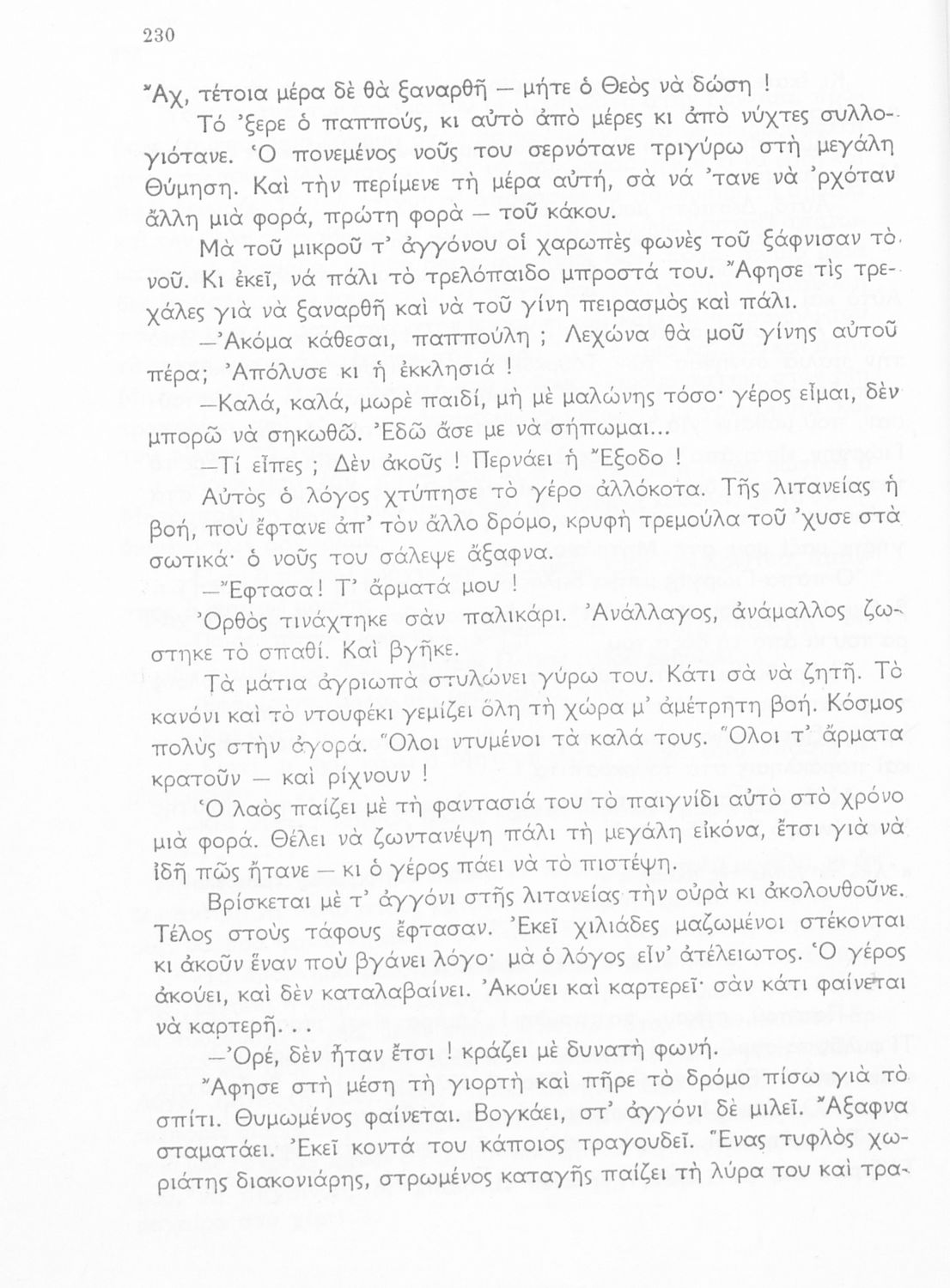 Σχολικό εγχειρίδιο Νέων Ελληνικών Ε΄ Γυμνασίου που περιέχει πεζά και ποιήματα συγγραφέων της βυζαντινής και μεταβυζαντινής περιόδου πατριωτικού και θρησκευτικού περιεχομένου. Περιλαμβάνει και πεζά και ποιήματα Ελλήνων και δημοτικά τραγούδια πατριωτικού περιεχομένου και παράρτημα με βιογραφίες των συγγραφέων και λεξιλόγιο. Φέρει το σύμβολο της δικτατορίας.