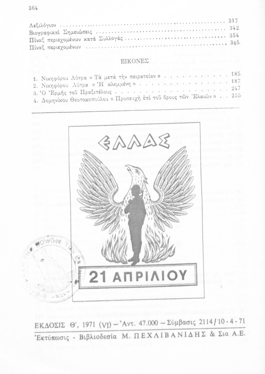 Σχολικό εγχειρίδιο Νέων Ελληνικών Ε΄ Γυμνασίου που περιέχει πεζά και ποιήματα συγγραφέων της βυζαντινής και μεταβυζαντινής περιόδου πατριωτικού και θρησκευτικού περιεχομένου. Περιλαμβάνει και πεζά και ποιήματα Ελλήνων και δημοτικά τραγούδια πατριωτικού περιεχομένου και παράρτημα με βιογραφίες των συγγραφέων και λεξιλόγιο. Φέρει το σύμβολο της δικτατορίας.