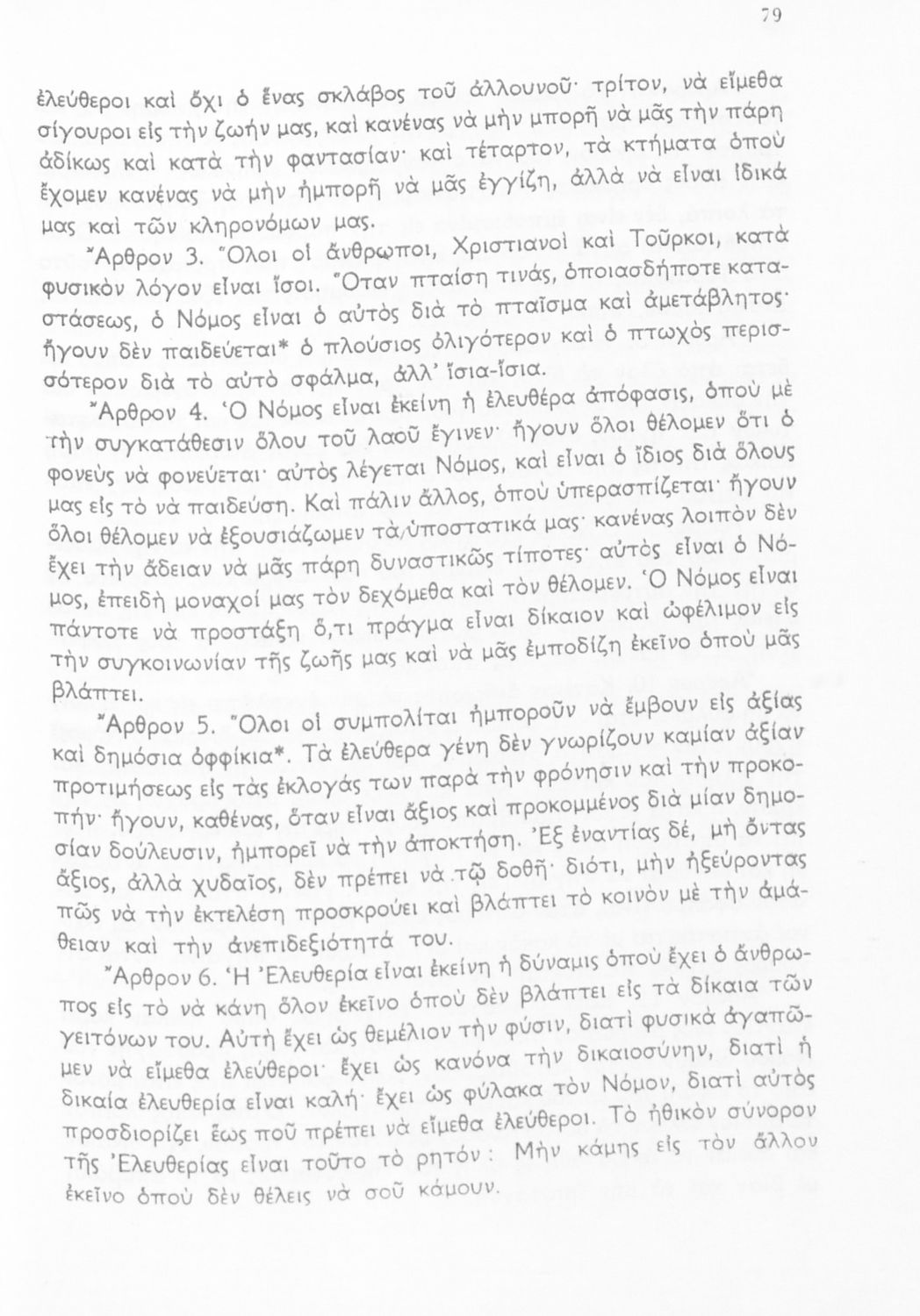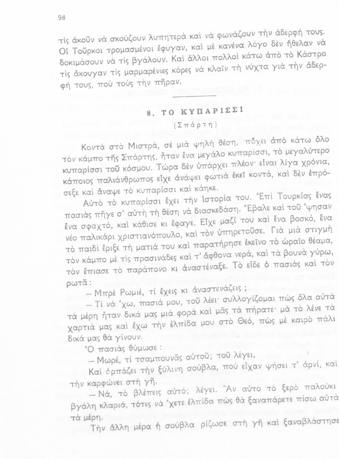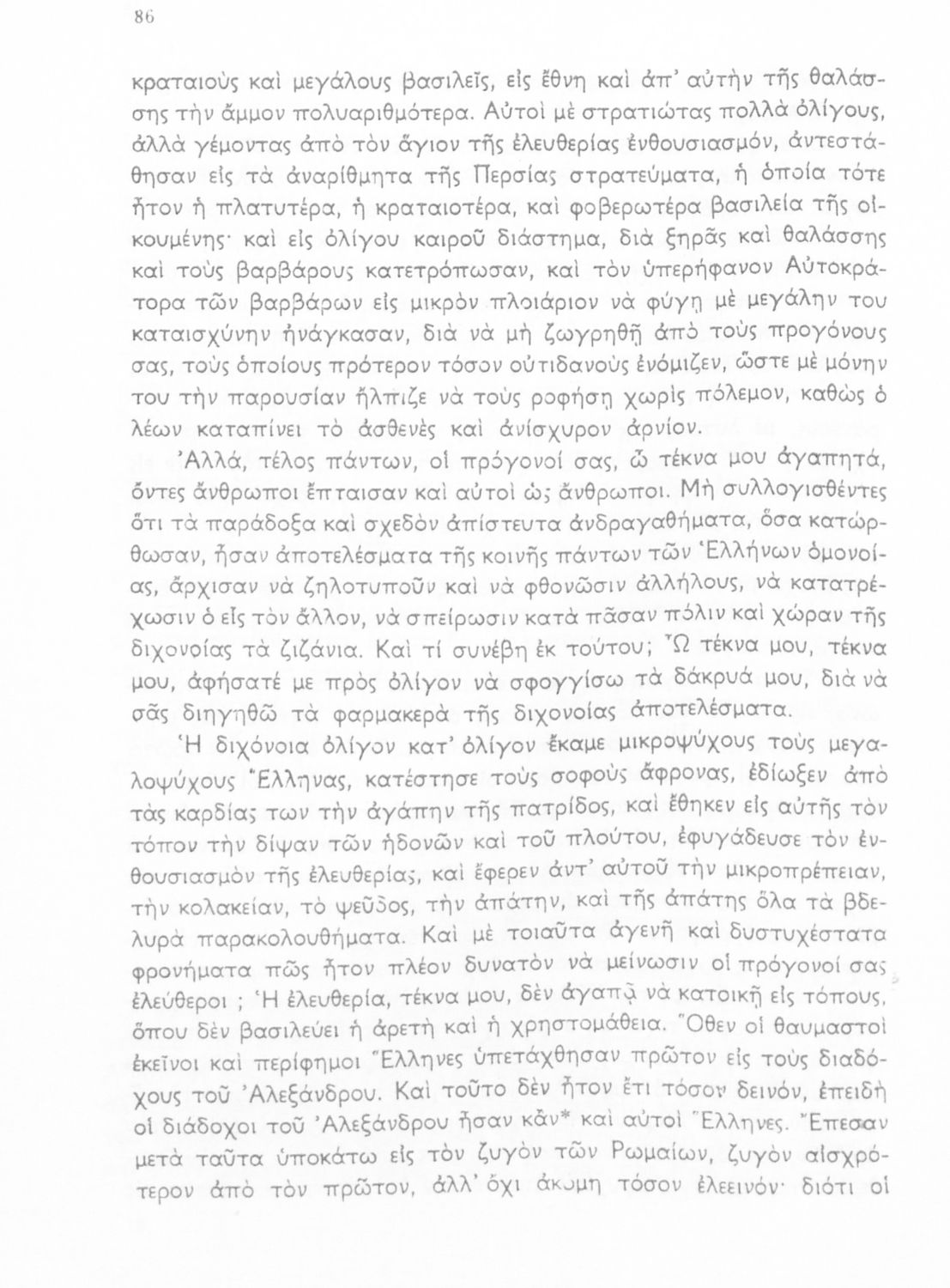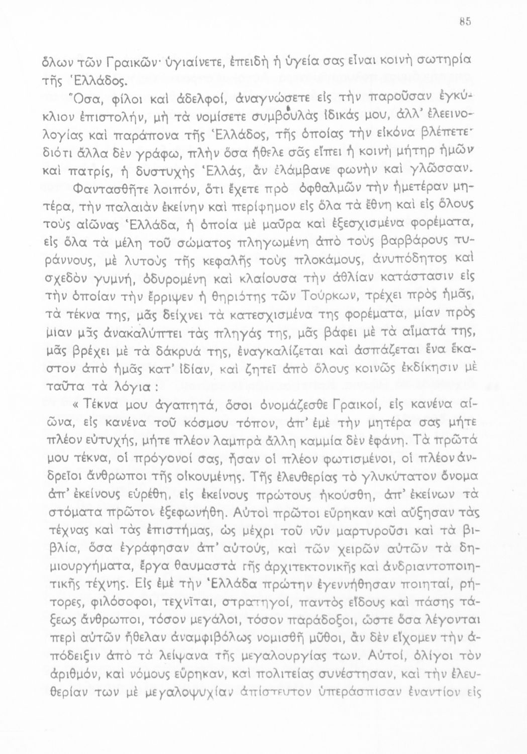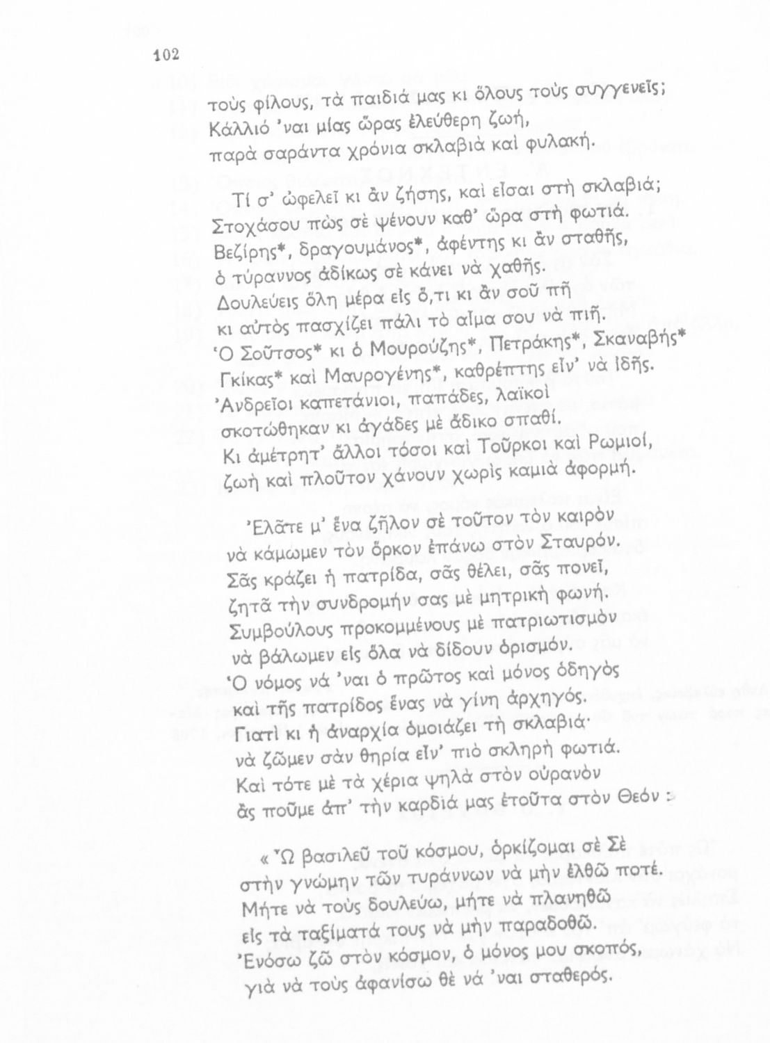 Σχολικό εγχειρίδιο Νέων Ελληνικών Ε΄ Γυμνασίου που περιέχει πεζά και ποιήματα συγγραφέων της βυζαντινής και μεταβυζαντινής περιόδου πατριωτικού και θρησκευτικού περιεχομένου. Περιλαμβάνει και πεζά και ποιήματα Ελλήνων και δημοτικά τραγούδια πατριωτικού περιεχομένου και παράρτημα με βιογραφίες των συγγραφέων και λεξιλόγιο. Φέρει το σύμβολο της δικτατορίας.