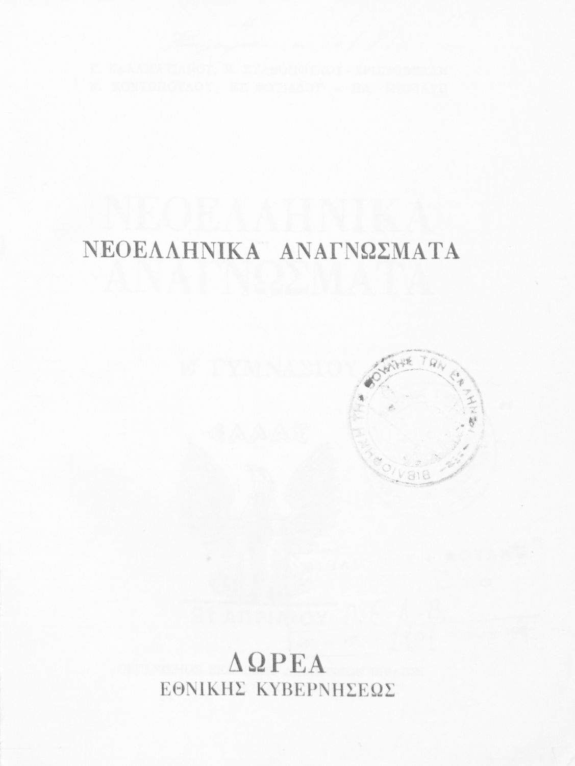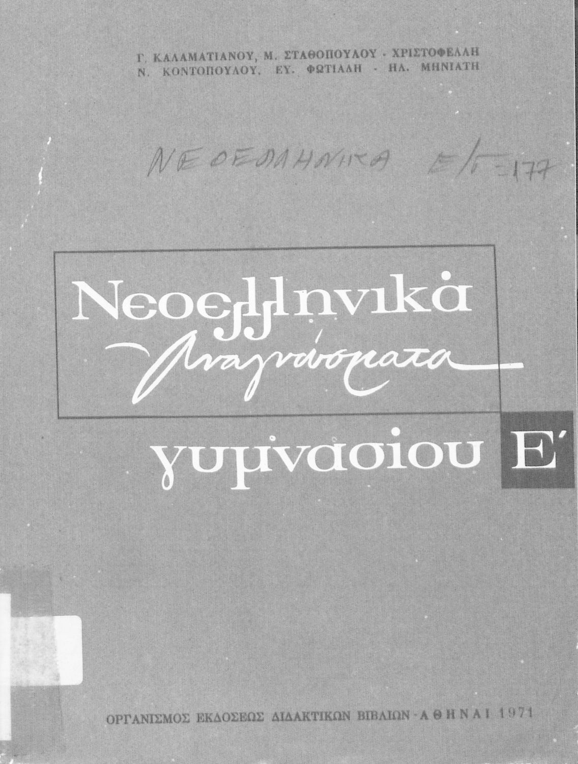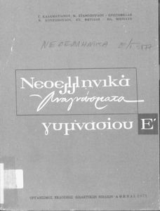 Βαθμίδα εκπαίδευσης: Δευτεροβάθμια Τάξη: Ε' Γυμνασίου Μάθημα: Νέα Ελληνικά Γλώσσα: Δημοτική, Καθαρεύουσα Παρουσίαση περιεχομένου: Σχολικό εγχειρίδιο Νέων Ελληνικών Ε΄ Γυμνασίου που περιέχει πεζά και ποιήματα συγγραφέων της βυζαντινής και μεταβυζαντινής περιόδου πατριωτικού και θρησκευτικού περιεχομένου. Περιλαμβάνει και πεζά και ποιήματα Ελλήνων και δημοτικά τραγούδια πατριωτικού περιεχομένου και παράρτημα με βιογραφίες των συγγραφέων και λεξιλόγιο. Φέρει το σύμβολο της δικτατορίας. |