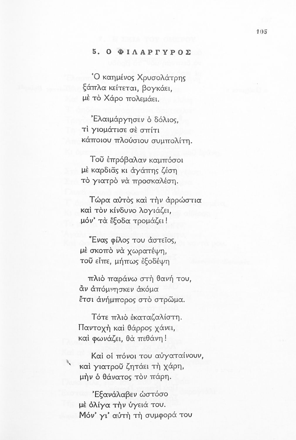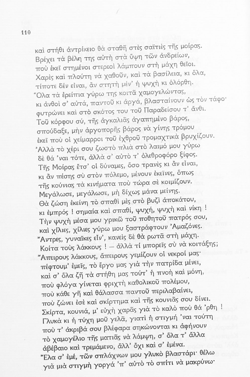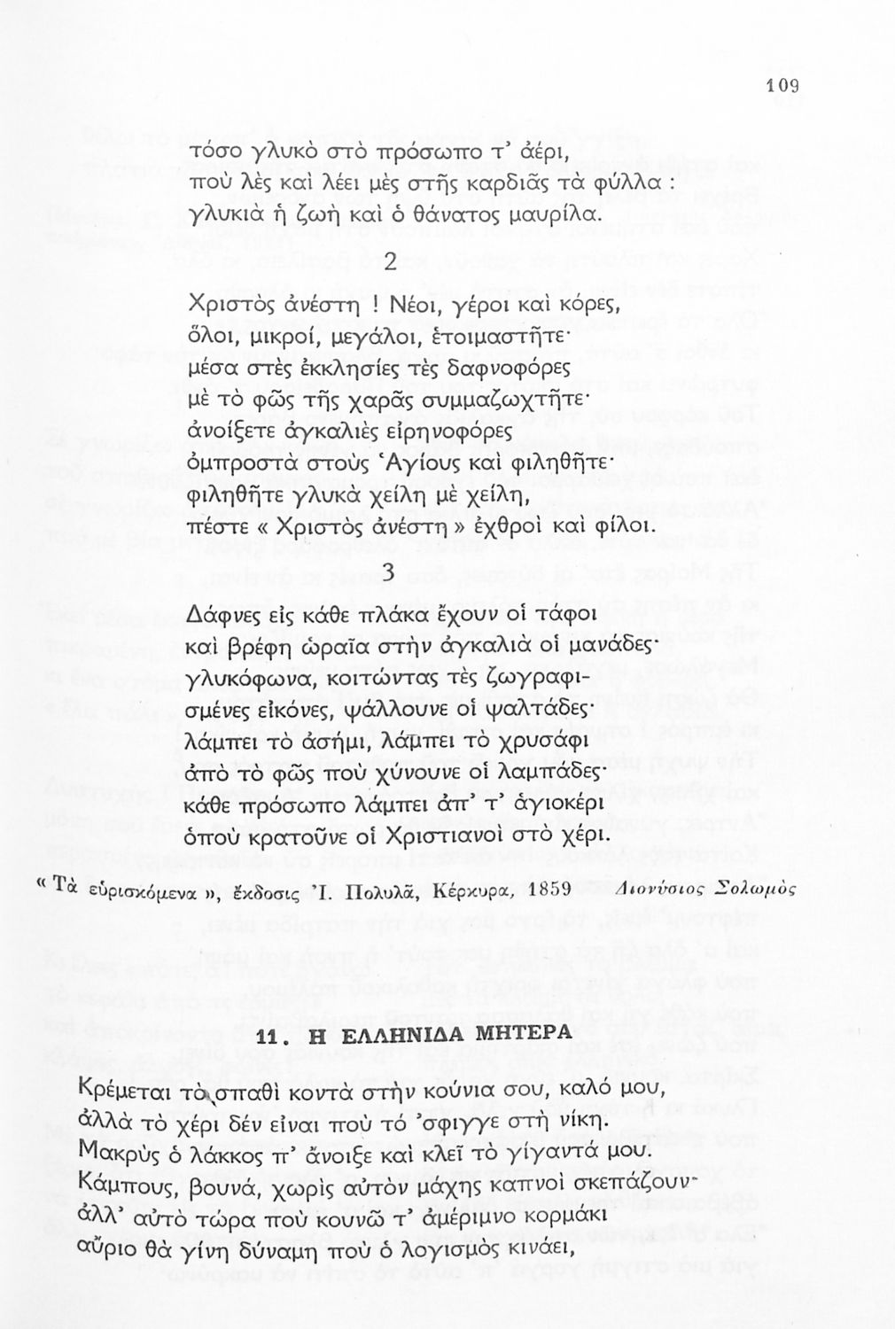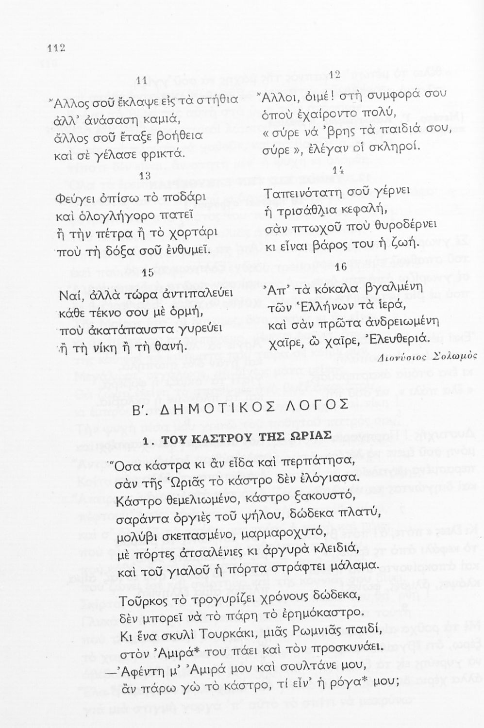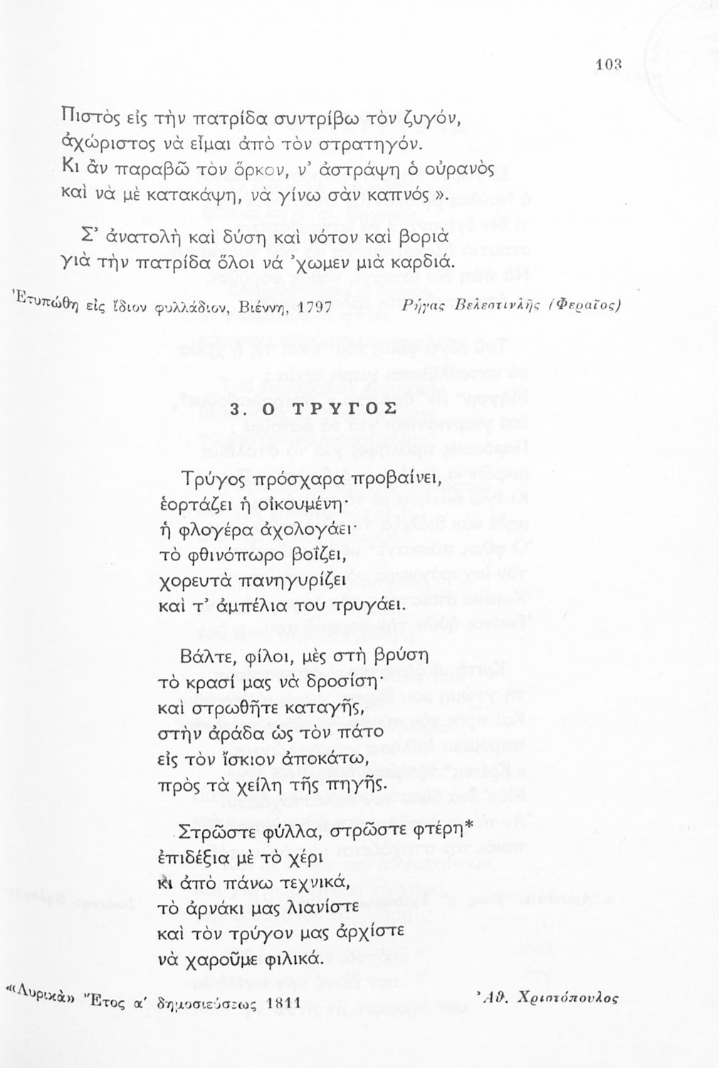 Σχολικό εγχειρίδιο Νέων Ελληνικών Ε΄ Γυμνασίου που περιέχει πεζά και ποιήματα συγγραφέων της βυζαντινής και μεταβυζαντινής περιόδου πατριωτικού και θρησκευτικού περιεχομένου. Περιλαμβάνει και πεζά και ποιήματα Ελλήνων και ξένων συγγραφέων και δημοτικά τραγούδια πατριωτικού περιεχομένου και παράρτημα με βιογραφίες των συγγραφέων και λεξιλόγιο. Φέρει το σύμβολο της δικτατορίας.