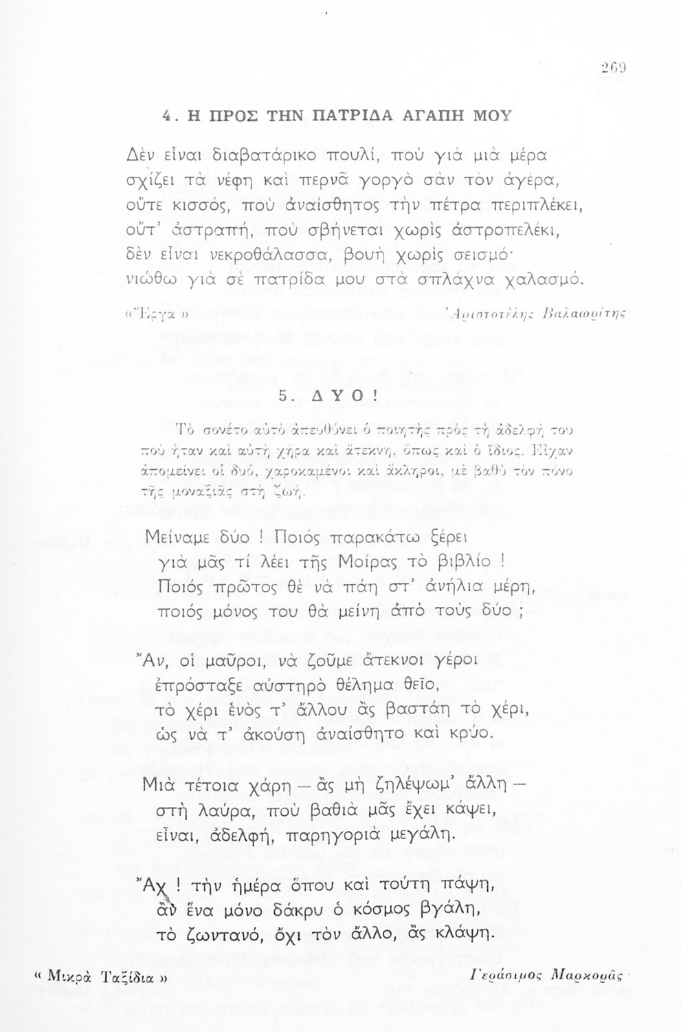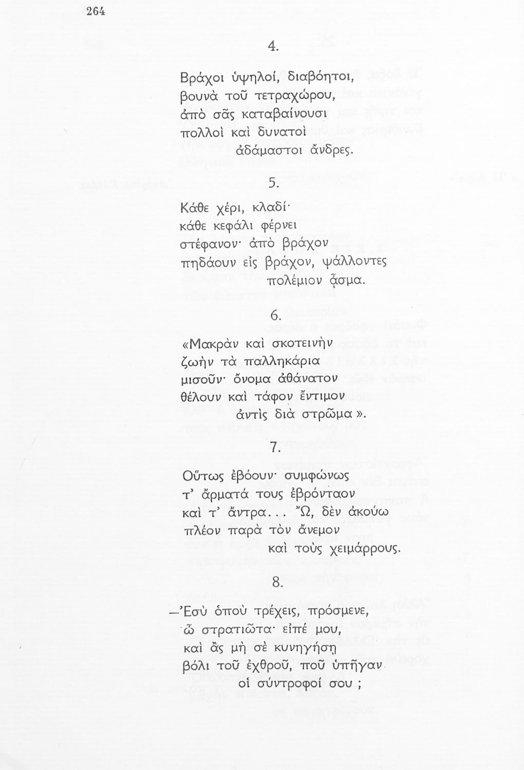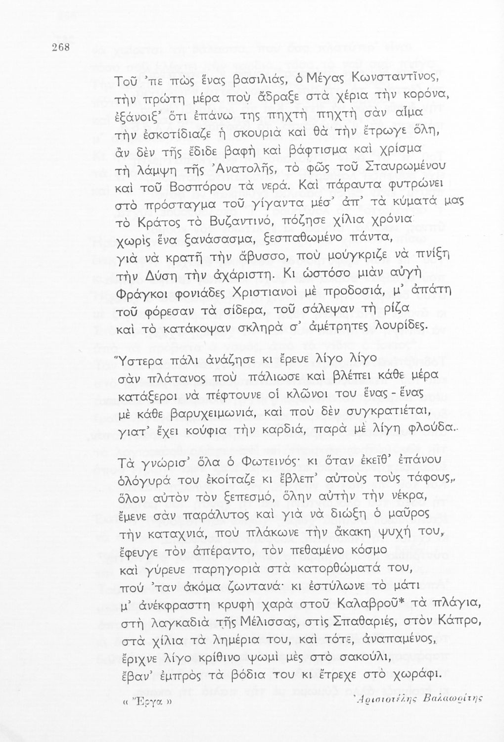 Σχολικό εγχειρίδιο Νέων Ελληνικών Ε΄ Γυμνασίου που περιέχει πεζά και ποιήματα συγγραφέων της βυζαντινής και μεταβυζαντινής περιόδου πατριωτικού και θρησκευτικού περιεχομένου. Περιλαμβάνει και πεζά και ποιήματα Ελλήνων και ξένων συγγραφέων και δημοτικά τραγούδια πατριωτικού περιεχομένου και παράρτημα με βιογραφίες των συγγραφέων και λεξιλόγιο. Φέρει το σύμβολο της δικτατορίας.