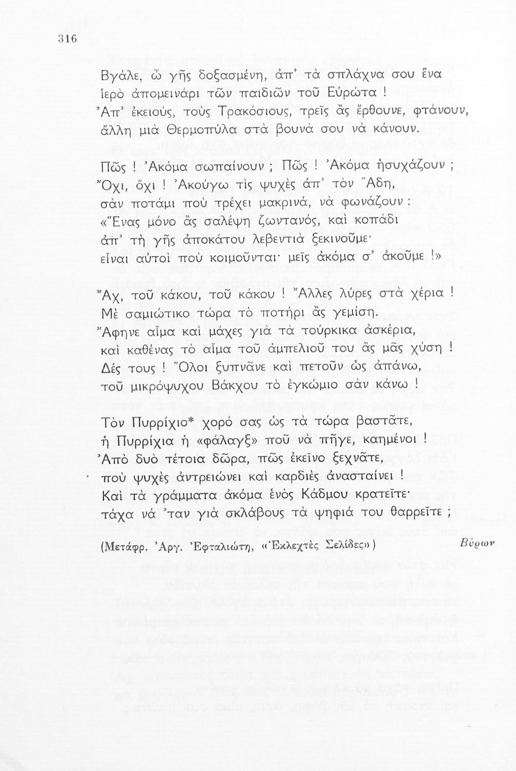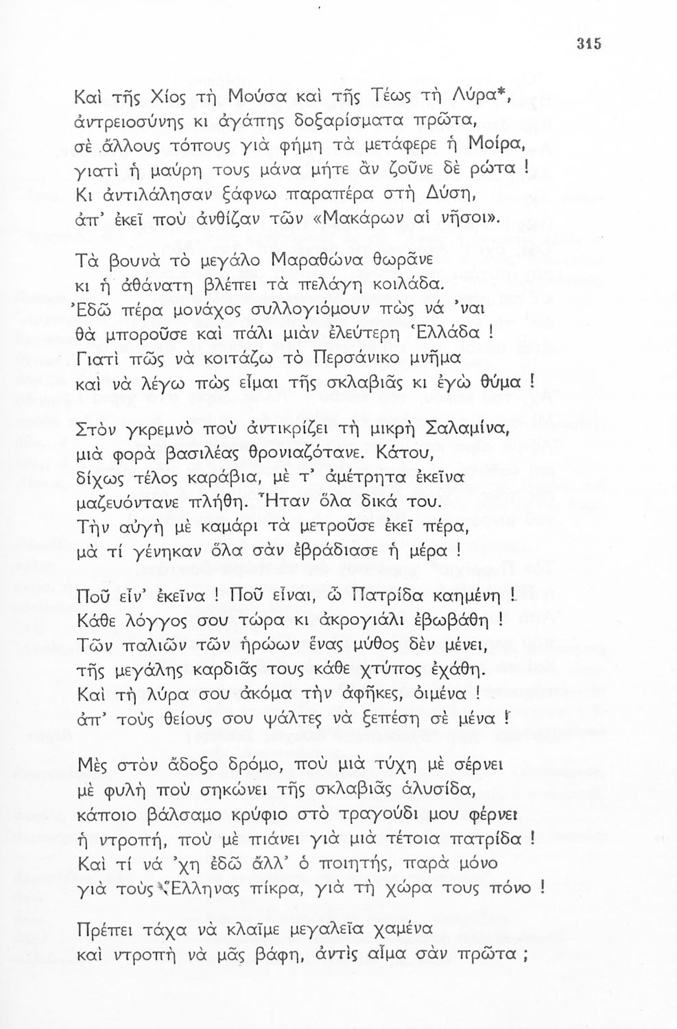 Σχολικό εγχειρίδιο Νέων Ελληνικών Ε΄ Γυμνασίου που περιέχει πεζά και ποιήματα συγγραφέων της βυζαντινής και μεταβυζαντινής περιόδου πατριωτικού και θρησκευτικού περιεχομένου. Περιλαμβάνει και πεζά και ποιήματα Ελλήνων και ξένων συγγραφέων και δημοτικά τραγούδια πατριωτικού περιεχομένου και παράρτημα με βιογραφίες των συγγραφέων και λεξιλόγιο. Φέρει το σύμβολο της δικτατορίας.