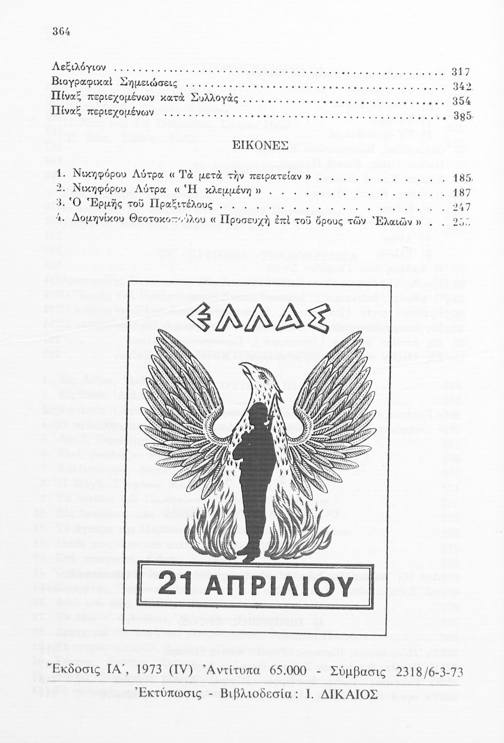 Σχολικό εγχειρίδιο Νέων Ελληνικών Ε΄ Γυμνασίου που περιέχει πεζά και ποιήματα συγγραφέων της βυζαντινής και μεταβυζαντινής περιόδου πατριωτικού και θρησκευτικού περιεχομένου. Περιλαμβάνει και πεζά και ποιήματα Ελλήνων και ξένων συγγραφέων και δημοτικά τραγούδια πατριωτικού περιεχομένου και παράρτημα με βιογραφίες των συγγραφέων και λεξιλόγιο. Φέρει το σύμβολο της δικτατορίας.