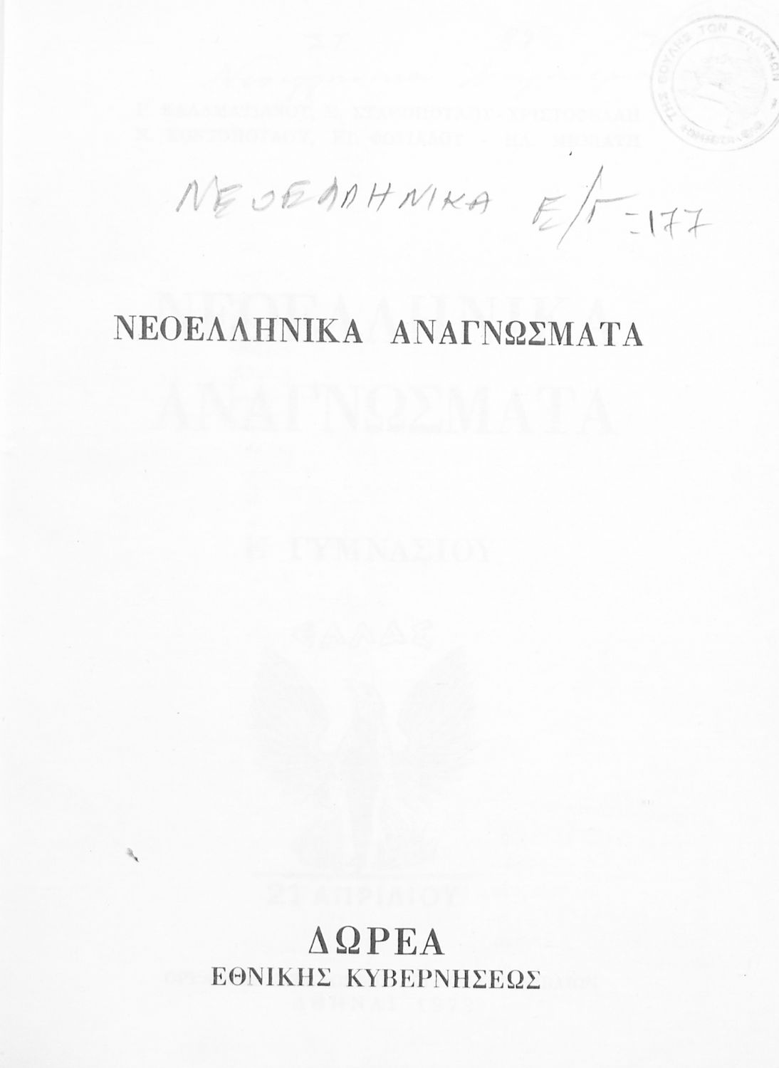 Σχολικό εγχειρίδιο Νέων Ελληνικών Ε΄ Γυμνασίου που περιέχει πεζά και ποιήματα συγγραφέων της βυζαντινής και μεταβυζαντινής περιόδου πατριωτικού και θρησκευτικού περιεχομένου. Περιλαμβάνει και πεζά και ποιήματα Ελλήνων και ξένων συγγραφέων και δημοτικά τραγούδια πατριωτικού περιεχομένου και παράρτημα με βιογραφίες των συγγραφέων και λεξιλόγιο. Φέρει το σύμβολο της δικτατορίας.