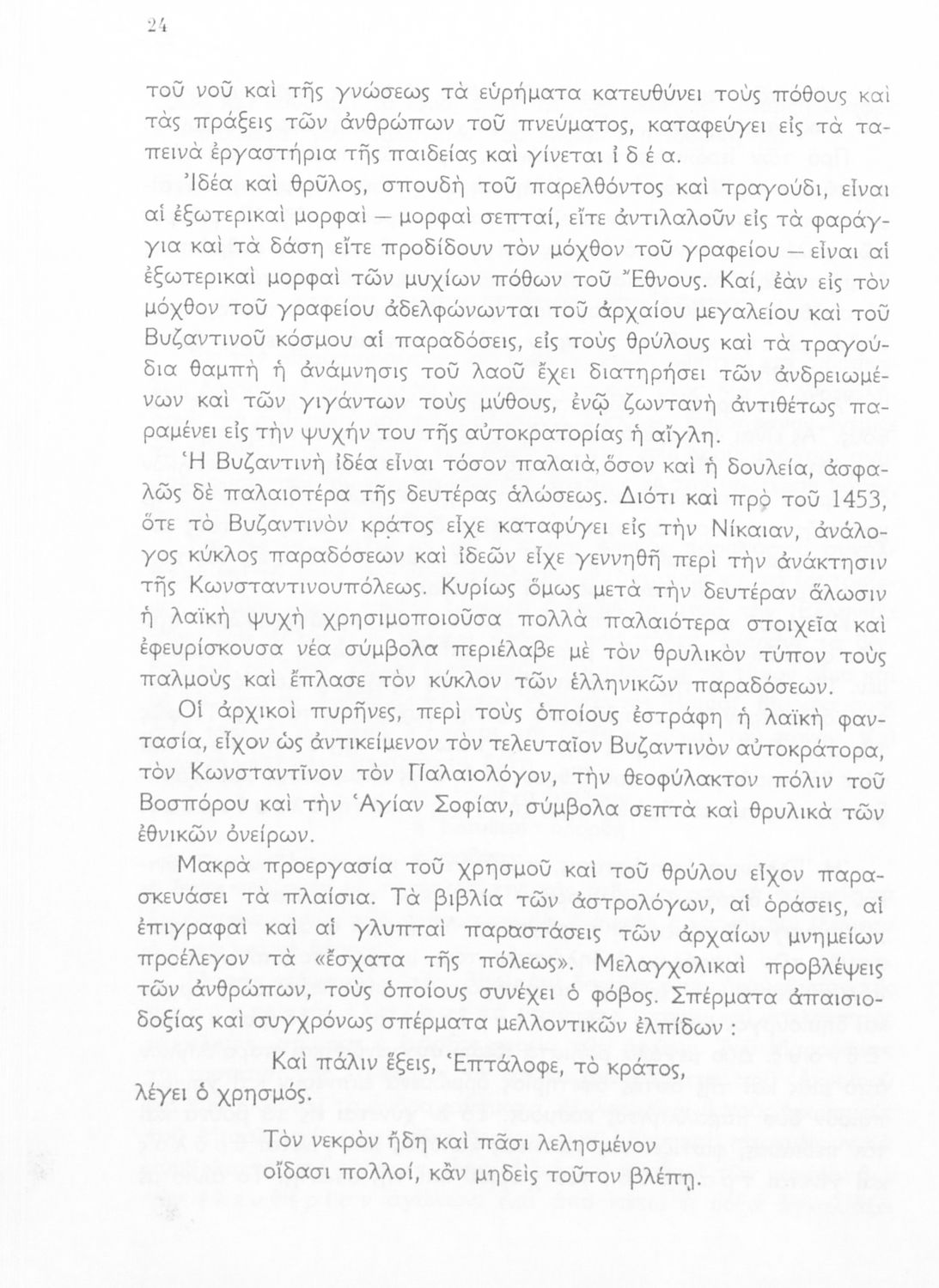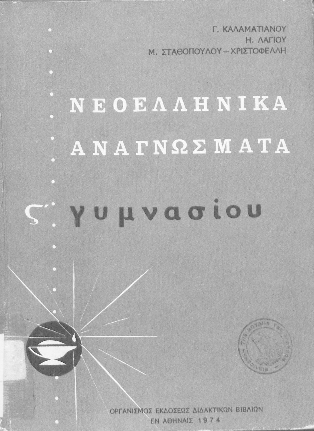 Σχολικό εγχειρίδιο για την ΣΤ΄ Γυμνασίου για το μάθημα των Νέων Ελληνικών. Το εγχειρίδιο περιλαμβάνει κείμενα πεζού λόγου και ποιήματα γραμμένα σε δημοτική και καθαρεύουσα γλώσσα από την βυζαντινή και μεταβυζαντινή λογοτεχνία, την κρητική περίοδο, δημοτικά και θεατρικά ποιήματα, κείμενα που σχετίζονται με την Ελληνική Επανάσταση, από την απελευθερωμένη Ελλάδα και μεταφράσεις ξένων ποιητικών και λογοτεχνικών κειμένων.