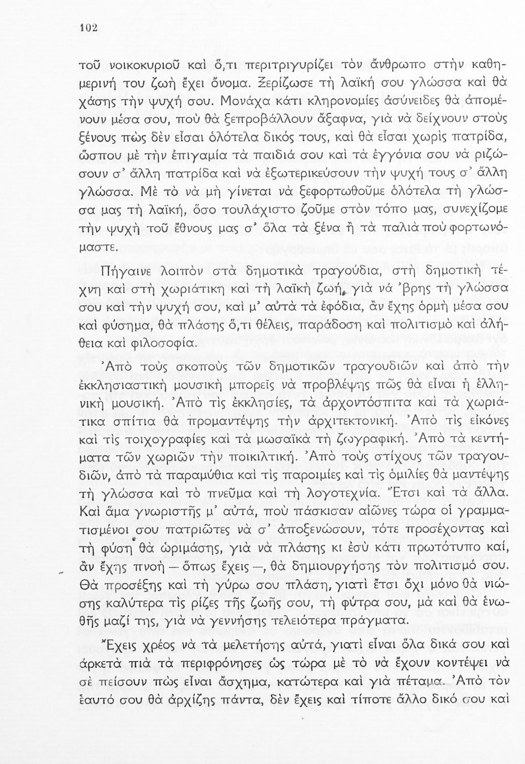 Σχολικό Εγχειρίδιο Λογοτεχνίας της ΣΤ΄ Γυμνασίου. Το βιβλίο περιέχει κείμενα και λογοτεχνικά αποσπάσματα Ελλήνων πεζογράφων μέσα από τα οποία παρουσιάζονται ήθη και έθιμα της Ελλάδας καθώς και ιστορικά πολεμικά γεγονότα τα οποία και συνθέτουν την εθνική ταυτότητα. Στο πρώτο μέρος υπάρχουν πεζά κείμενα όπως απομνημονεύματα, μελέτες, διατριβές, επιστολές, επιστημονικά και φιλοσοφικά κείμενα. Το δεύτερο μέρος αναφέρεται στην ποίηση και περιέχει ιστορικά, λυρικά και σατυρικά ποιήματα. Το βιβλίο τελειώνει με αναφορά στην ξένη λογοτεχνία όπως την Ιταλική, Γαλλική και την Γερμανική.
