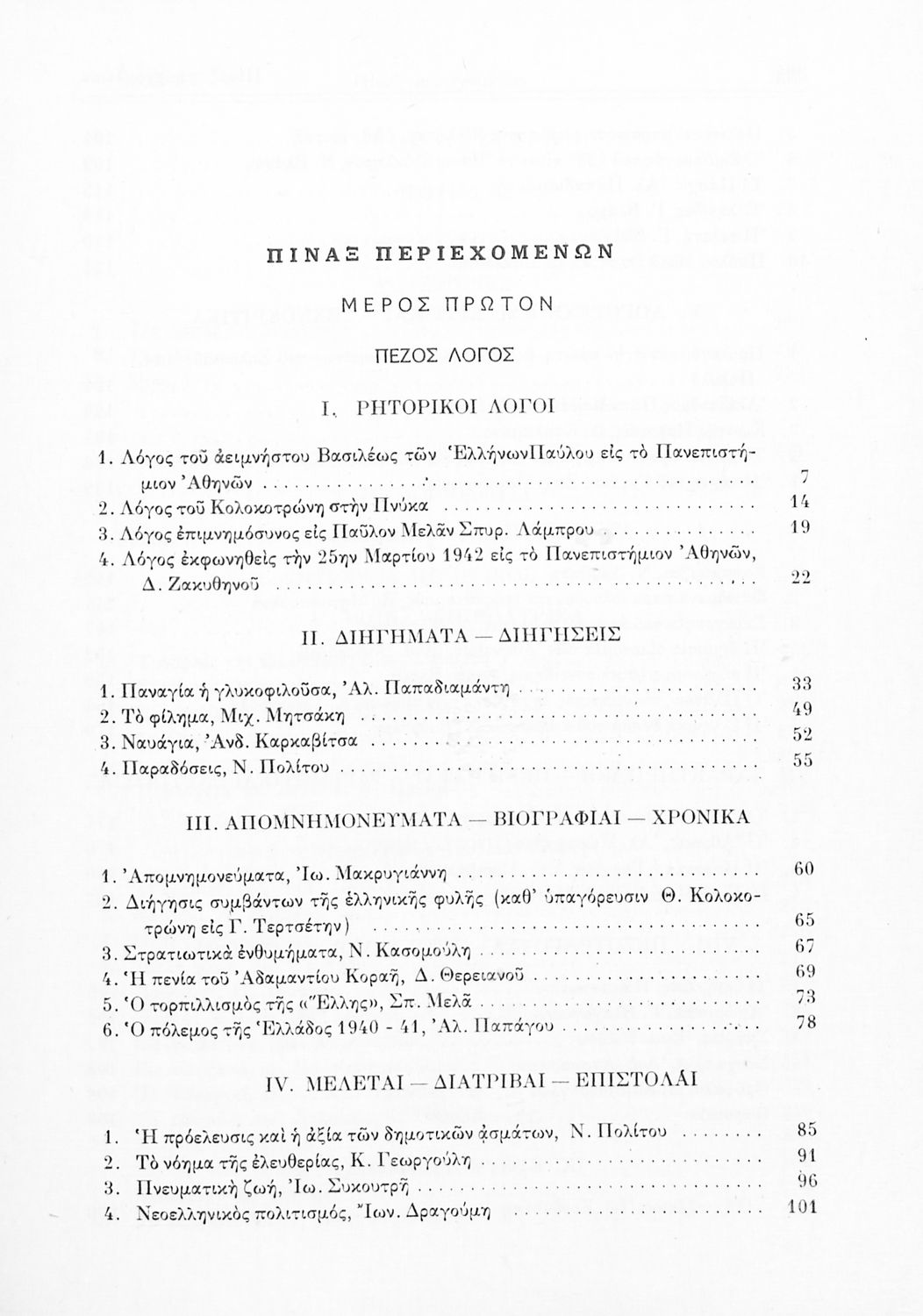 Παρουσίαση περιεχομένου: Το σύγγραμμα ήταν σχολικό εγχειρίδιο για το μάθημα της Γλώσσας. Πρόκειται για νεοελληνικά αναγνώσματα, το περιεχόμενο των οποίων αντλείται από τους ρητορικούς λόγους, τα θρησκευτικά διηγήματα, επιστημονικές μελέτες, την κρητική λογοτεχνία, τη φιλοσοφία, τις ταξιδιωτικές περιγραφές, τα δημοτικά τραγούδια, τις παραλογές και τα λυρικά ποιήματα. Επίσης, περιέχονται ποιήματα και πεζά της ξένης λογοτεχνίας.