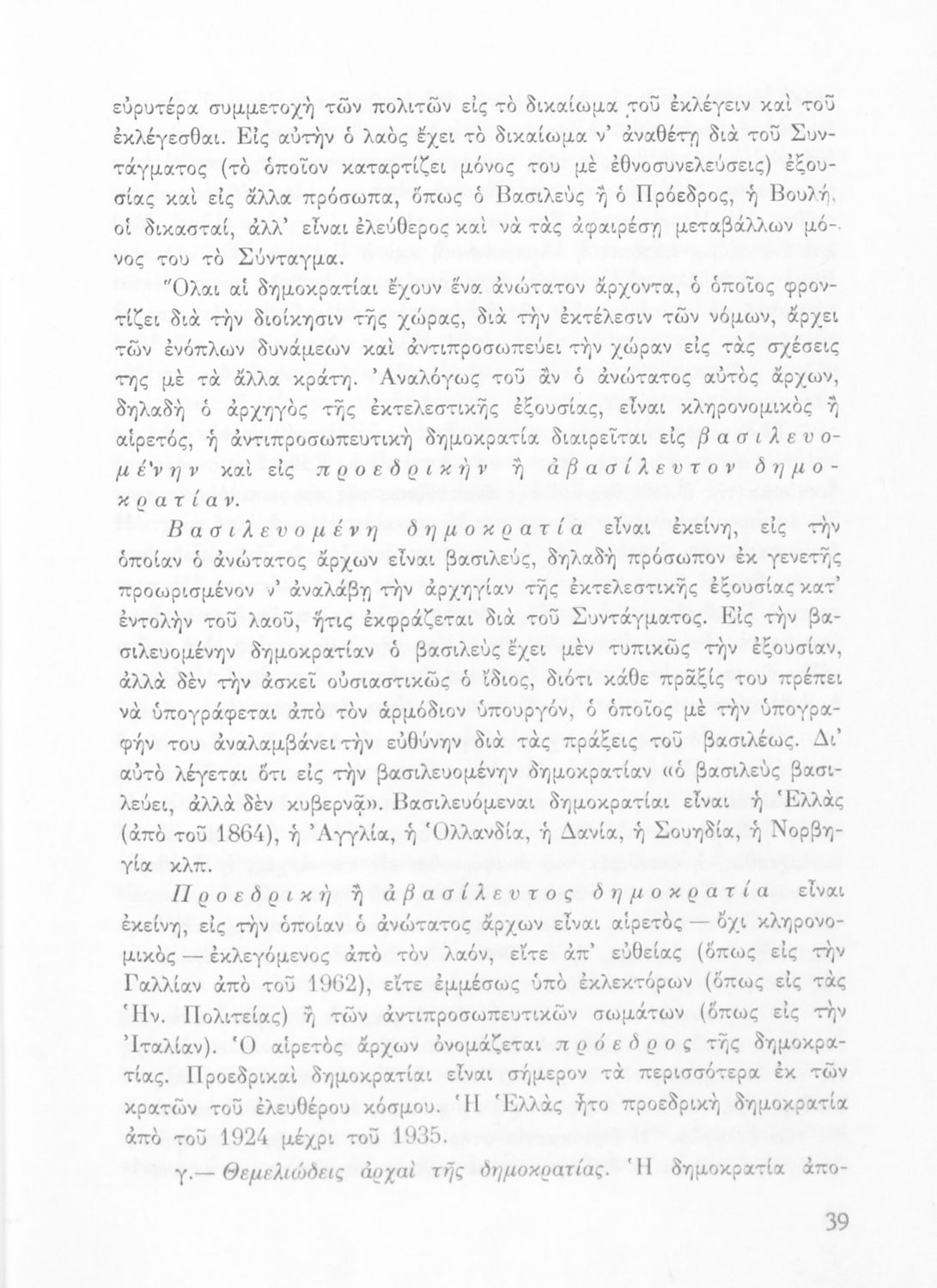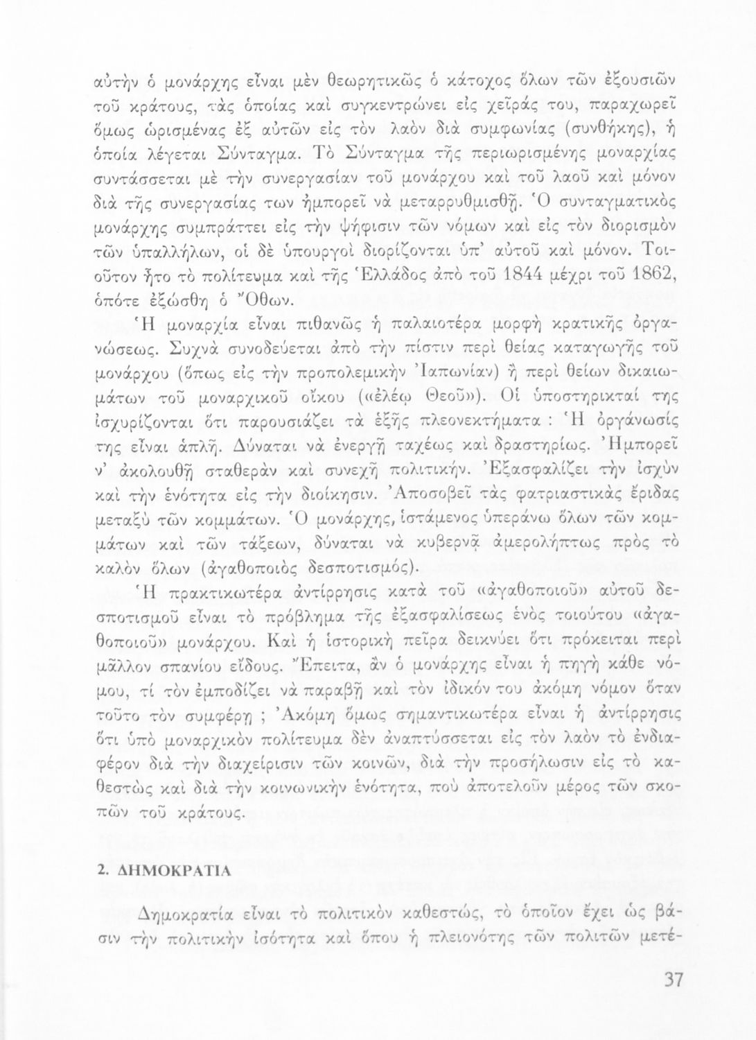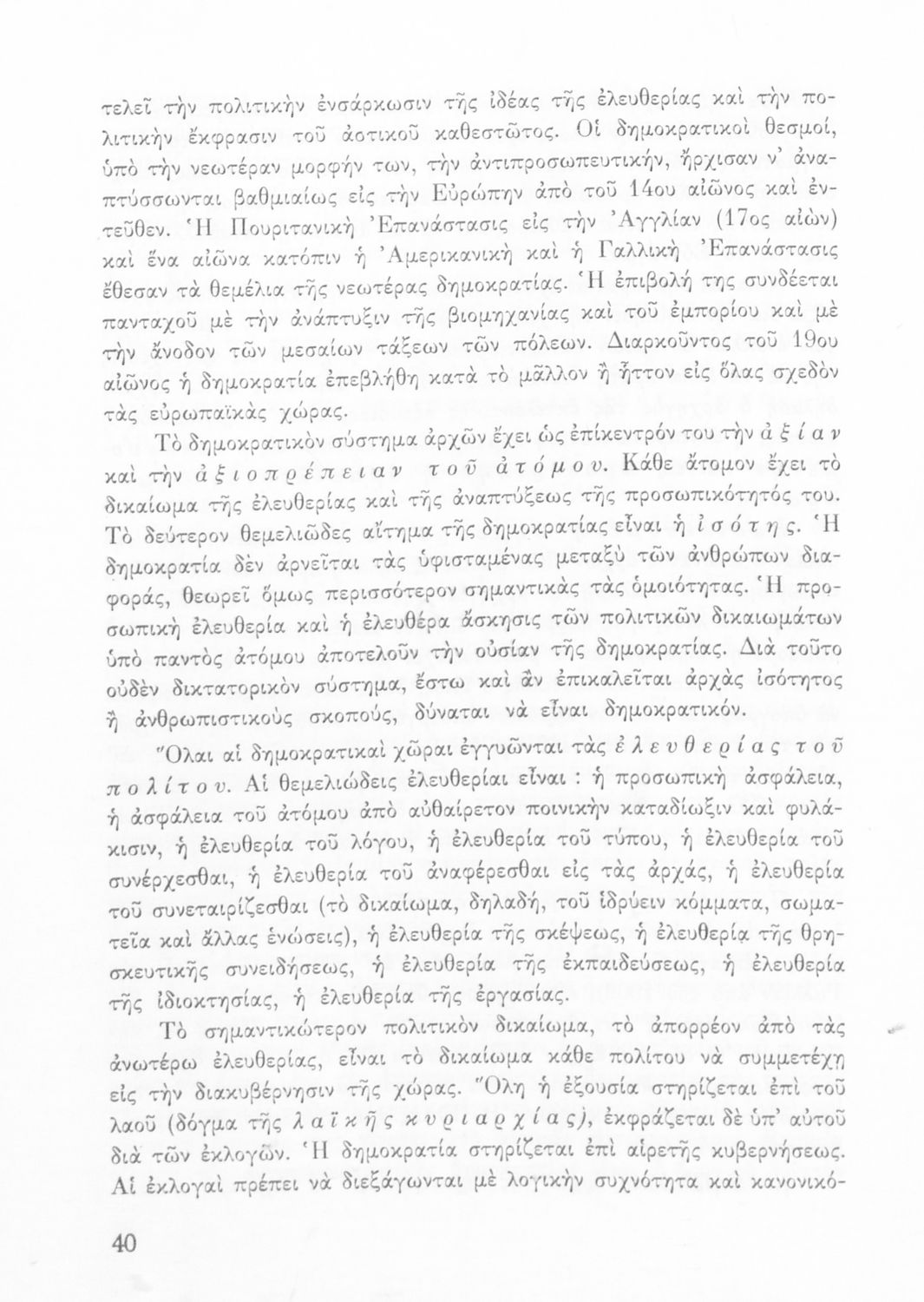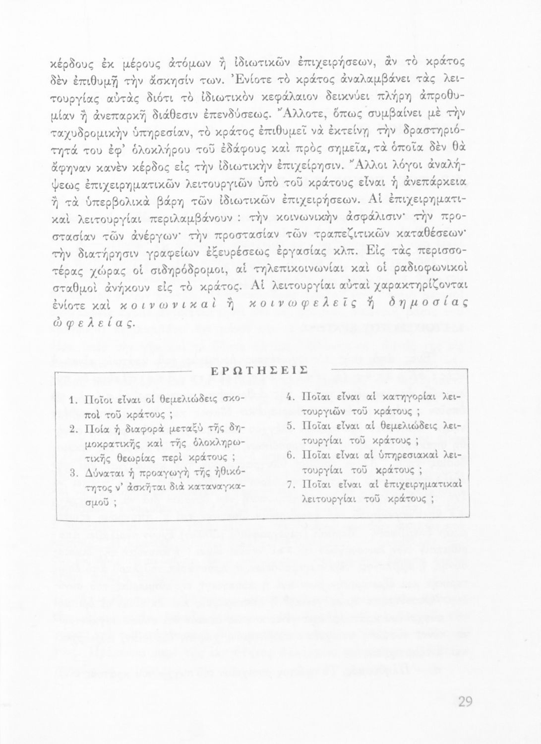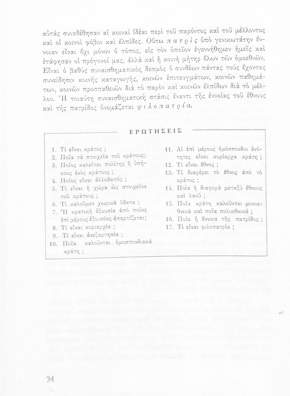 Βαθμίδα εκπαίδευσης: Δευτεροβάθμια Τάξη: Γ' Γυμνασίου / ΣΤ΄ Γυμνασίου Μάθημα: Αγωγή Του Πολίτη Γλώσσα: Απλή καθαρεύουσα Παρουσίαση περιεχομένου: Σχολικό εγχειρίδιο για το μάθημα της πολιτικής Αγωγής στο Γυμνάσιο. Αρχικά αναφέρεται γενικά στις λειτουργίες της κοινωνίας, μετά στη διοίκηση, και τα διοικητικά συστήματα. Στο τέλος παρουσιάζει τη λειτουργία και τον ρόλο των Διεθνών Οργανισμών. |