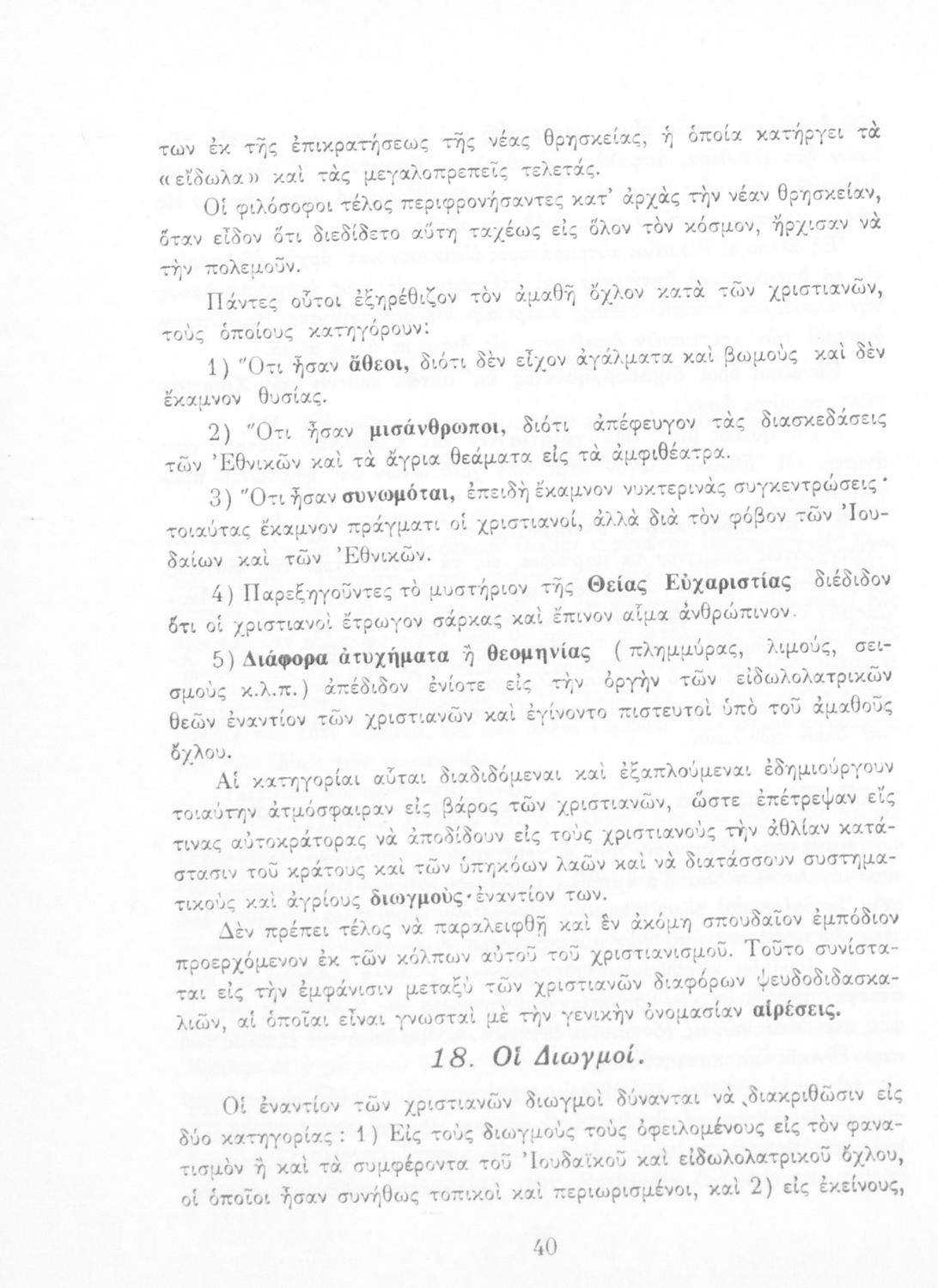 Βαθμίδα εκπαίδευσης: Δευτεροβάθμια Τάξη: Δ' Γυμνασίου Μάθημα: Θρησκευτικά Γλώσσα: Καθαρεύουσα Παρουσίαση περιεχομένου: Σχολικό εγχειρίδιο Θρησκευτικών Δ' Γυμνασίου που αποτελεί μια σύντομη εξιστόρηση της γέννησης και της εξέλιξης του Χριστιανισμού από την εμφάνισή του μέχρι τον 19ο αιώνα. Σχολιάζει και τη σχέση ελληνισμού και χριστιανισμού. |