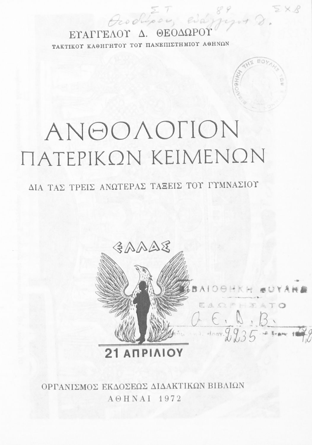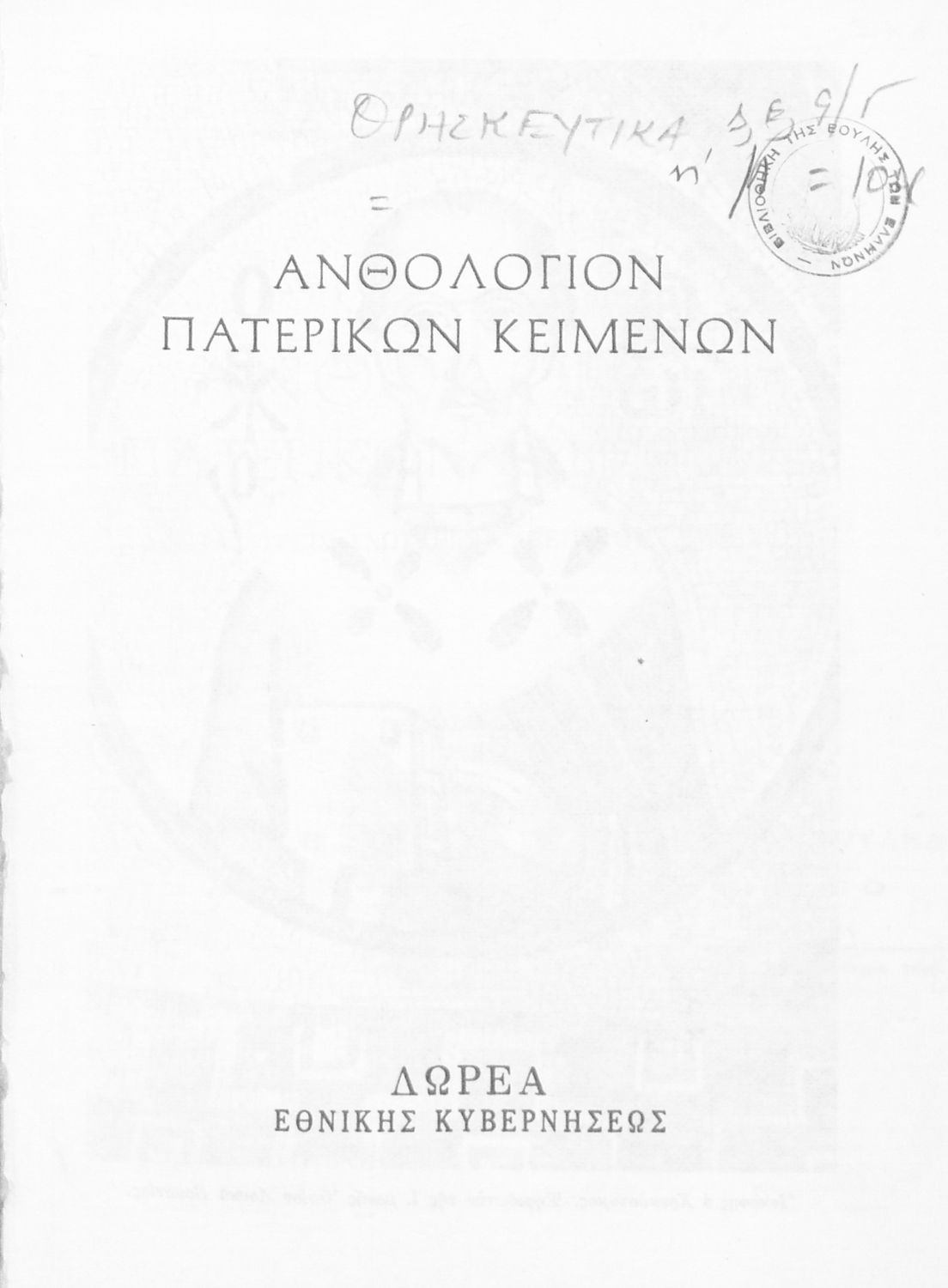 Τίτλος: Ανθολόγιο Πατερικών Κειμένων δια τας τρεις ανωτέρας τάξεις του Γυμνασίου