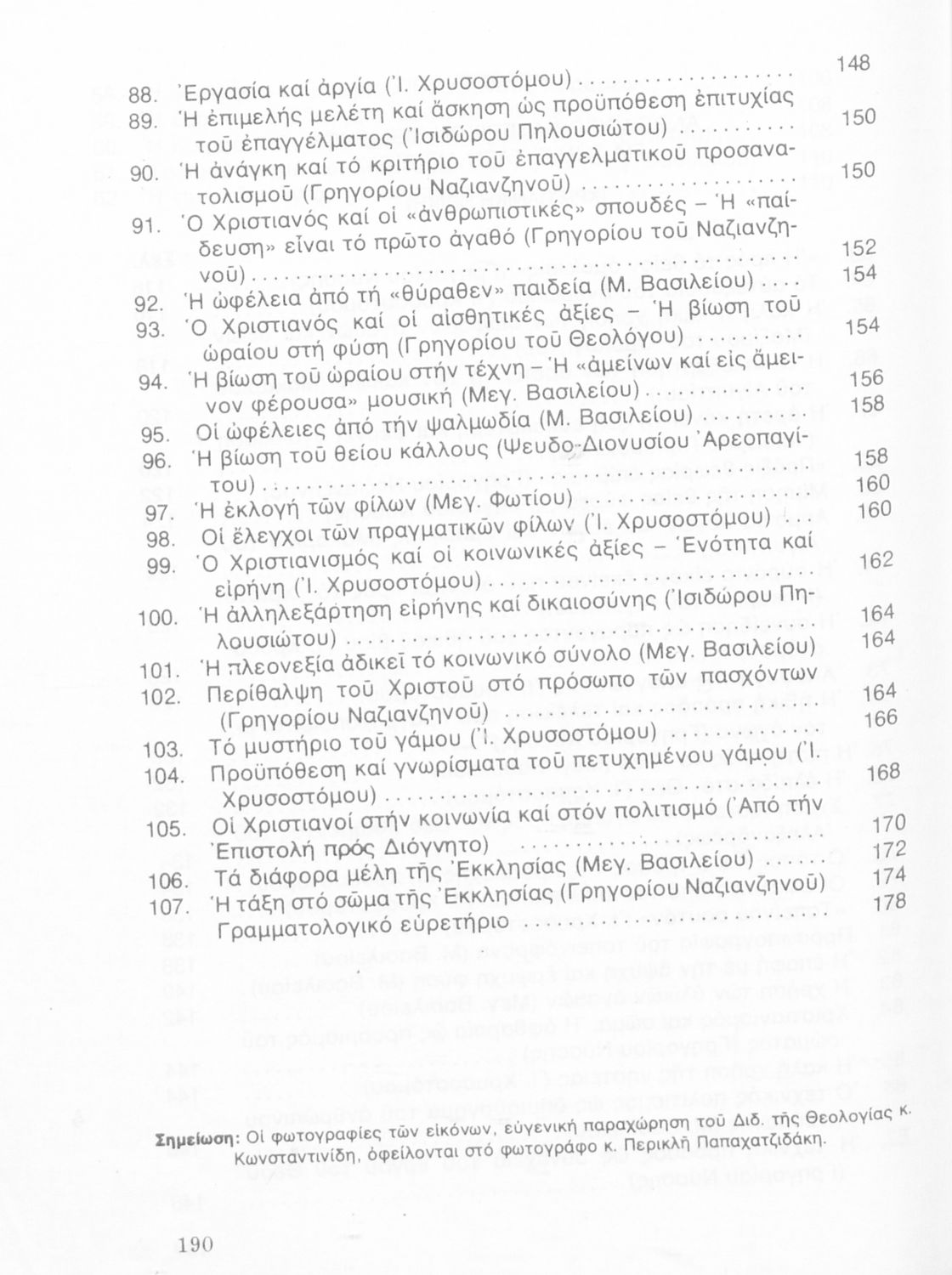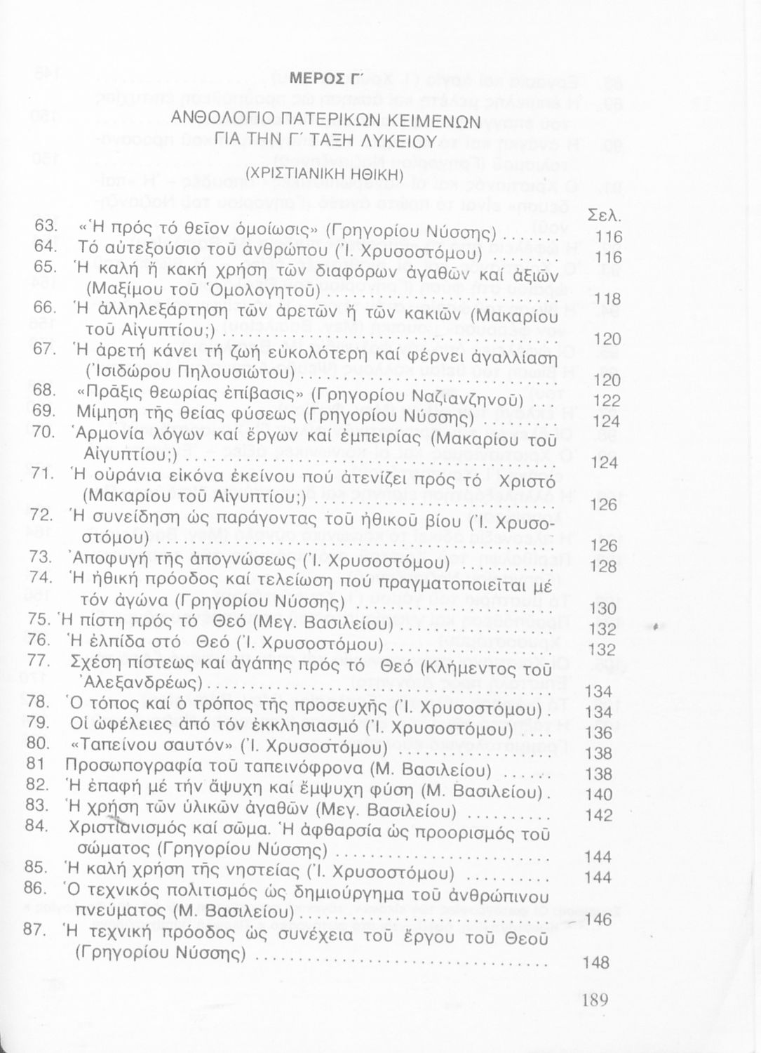 Σχολικό εγχειρίδιο Θρησκευτικών Α΄, Β΄ και Γ΄ Λυκείου που, μέσα από τα κείμενα των Πατέρων της Εκκλησίας, πραγματεύεται ζητήματα αρετής, ηθικής αμαρτίας, λύτρωσης, δικαιοσύνης και αγάπης. Επίσης αναφέρεται στις σχέσεις των ανθρώπων και στις σχέσεις τους με το Θεό.