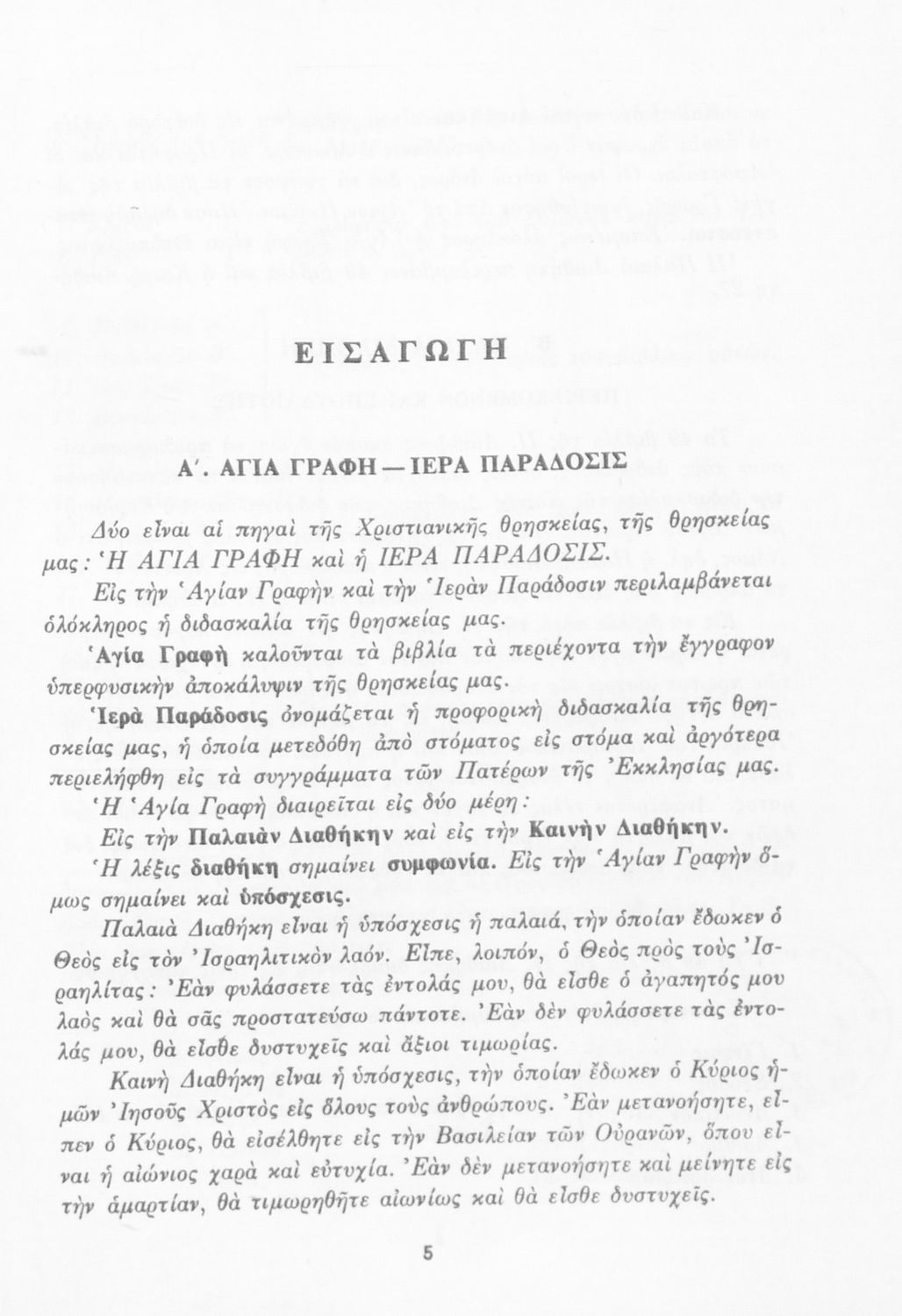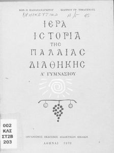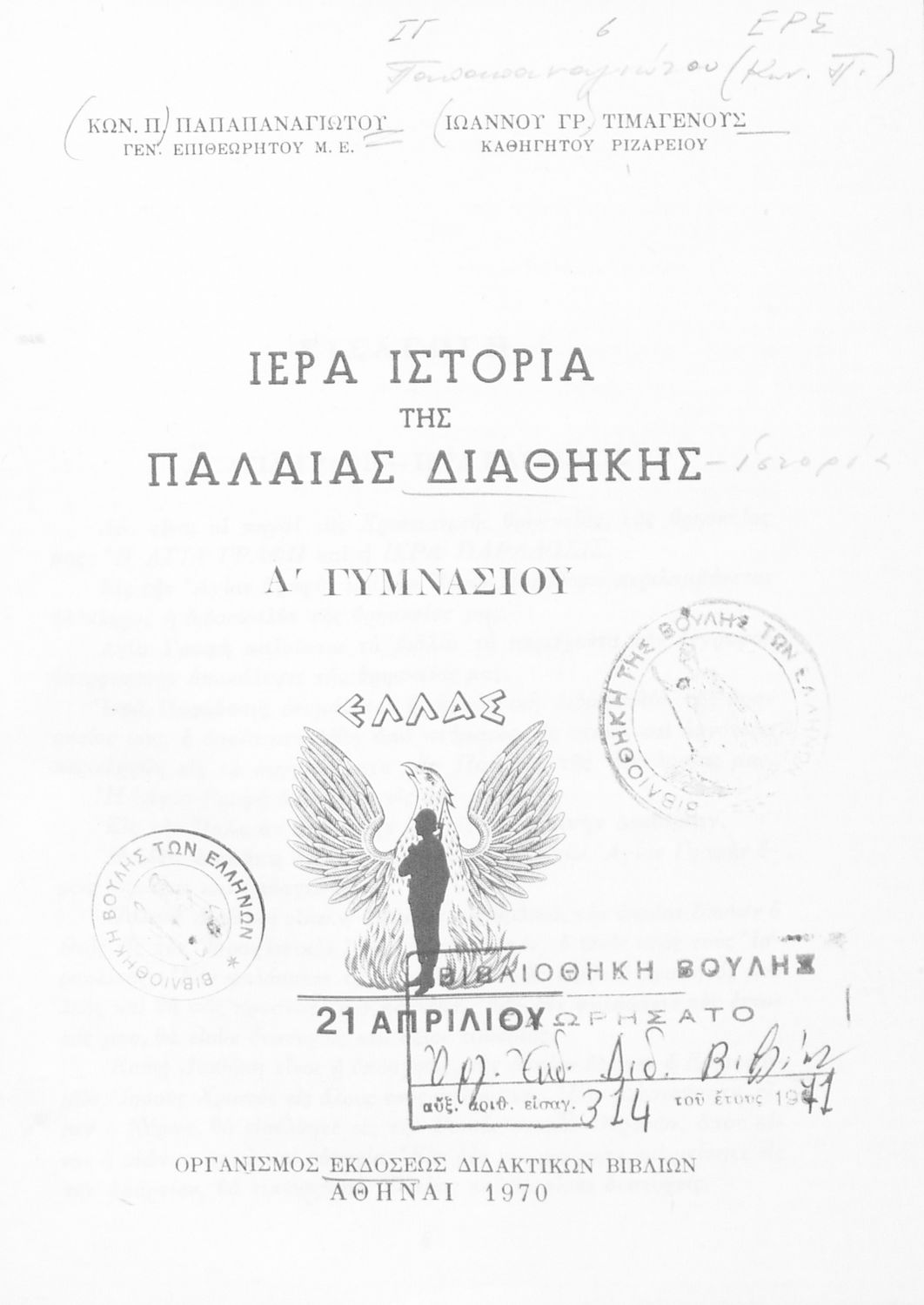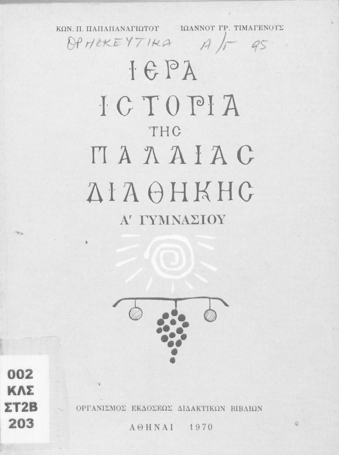 Βαθμίδα εκπαίδευσης: Δευτεροβάθμια Τάξη: Α' Γυμνασίου Μάθημα: Θρησκευτικά Γλώσσα: Απλή καθαρεύουσα Παρουσίαση περιεχομένου: Σχολικό εγχειρίδιο Θρησκευτικών Α΄ Γυμνασίου που περιλαμβάνει εισαγωγή στην Αγία Γραφή, και συνιστά μία εξιστόρηση της Παλαιάς Διαθήκης από τη δημιουργία του κόσμου ως τους Προφήτες. Φέρει το σύμβολο της δικτατορίας. |
