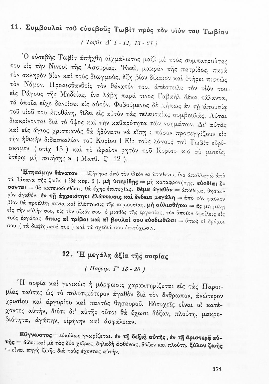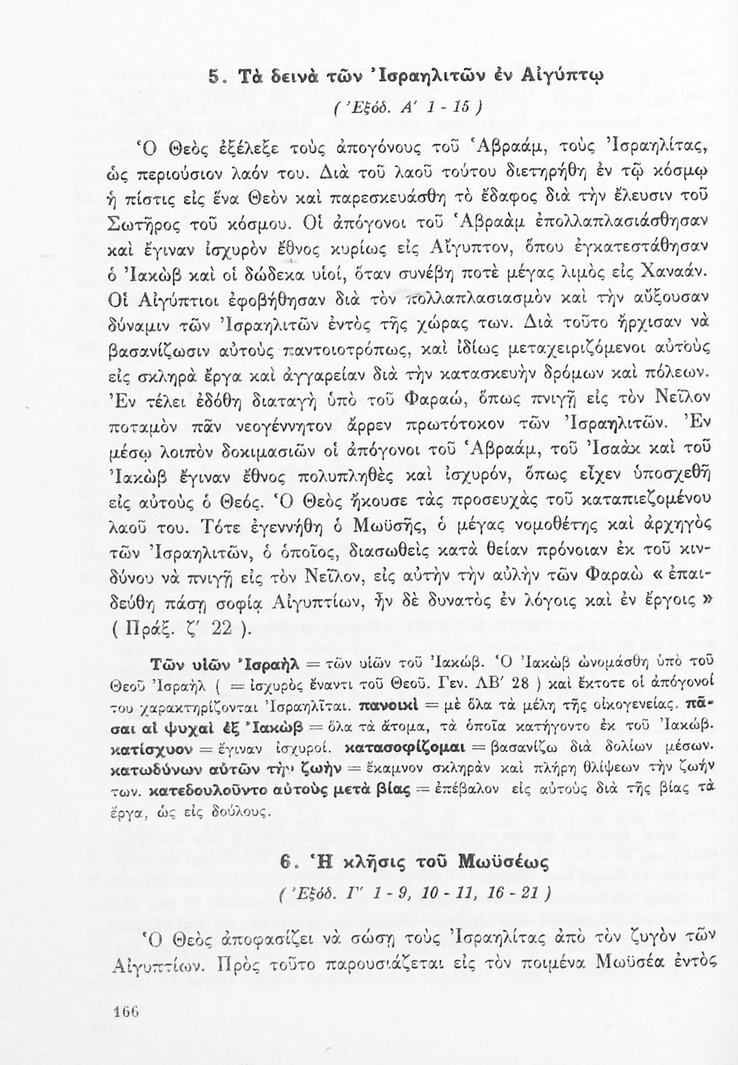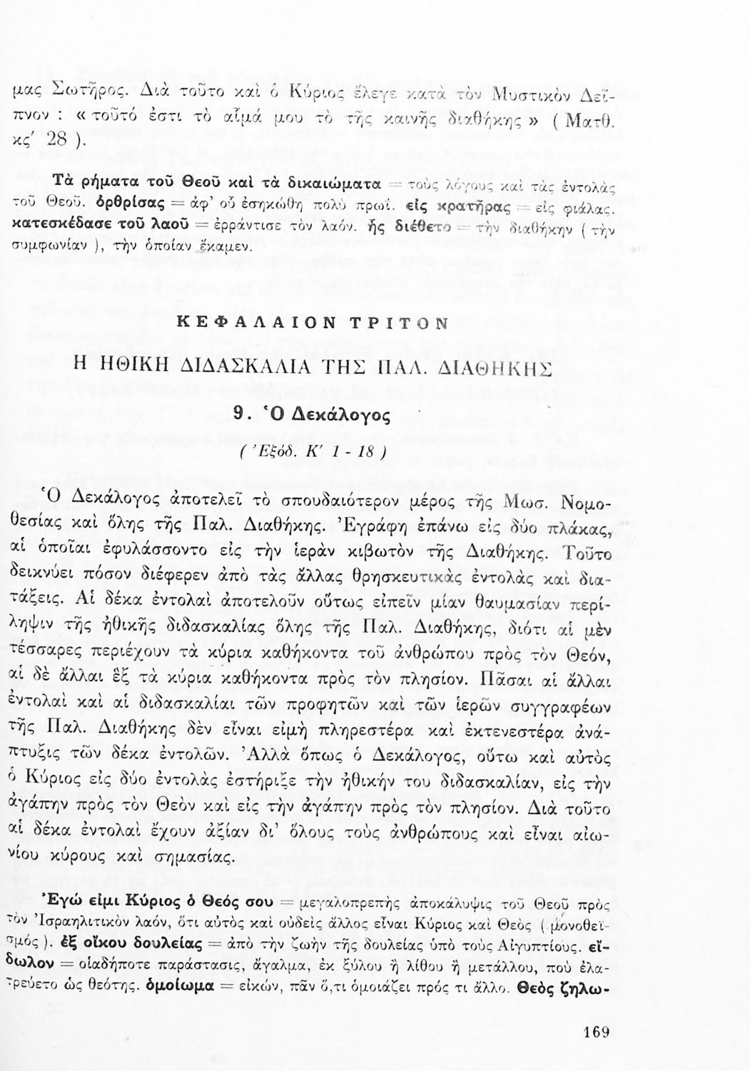 Σχολικό εγχειρίδιο Θρησκευτικών που περιλαμβάνει εισαγωγικά σχόλια στα βιβλία της Παλαιάς και Καινής Διαθήκης, περικοπές, ερμηνευτικές και πραγματολογικές σημειώσεις και πίνακα με τα κυριότερα ονόματα.
