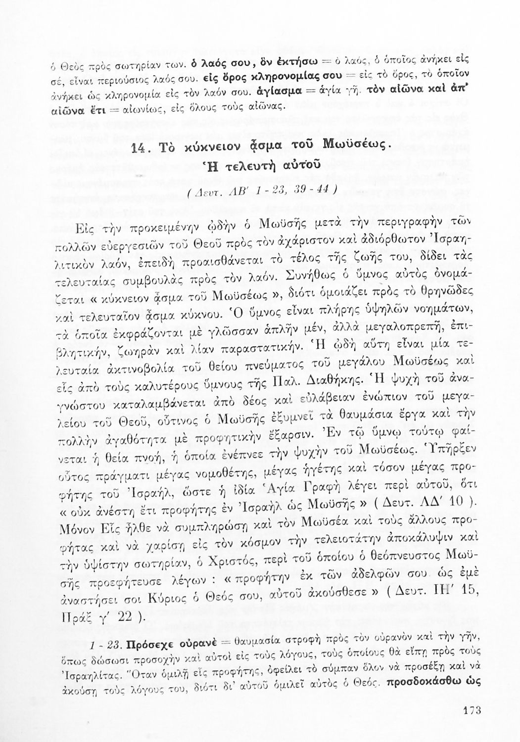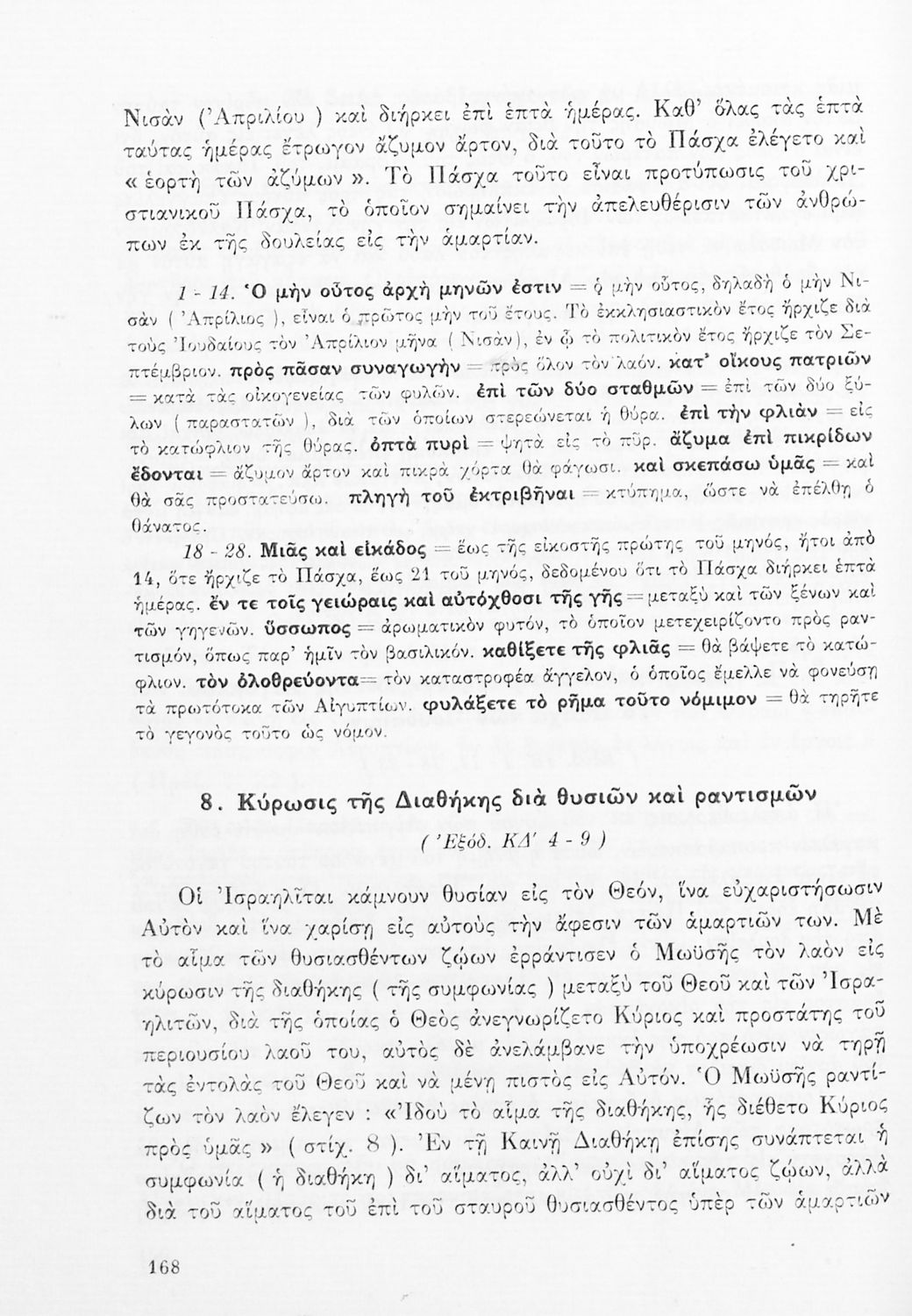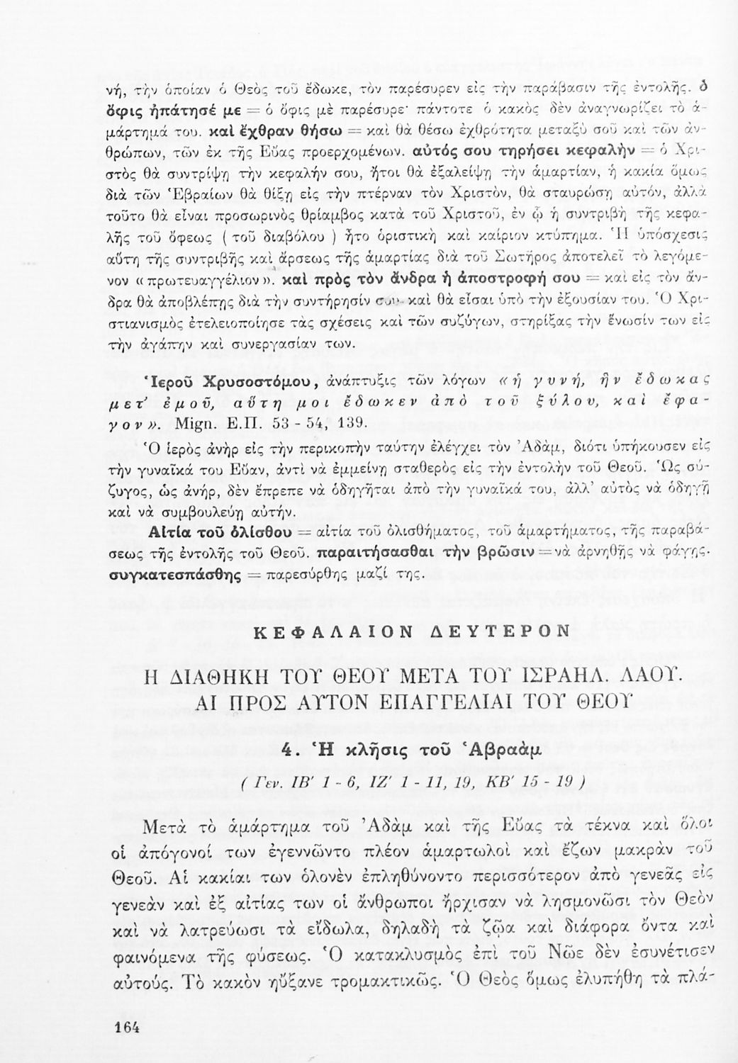 Σχολικό εγχειρίδιο Θρησκευτικών που περιλαμβάνει εισαγωγικά σχόλια στα βιβλία της Παλαιάς και Καινής Διαθήκης, περικοπές, ερμηνευτικές και πραγματολογικές σημειώσεις και πίνακα με τα κυριότερα ονόματα.