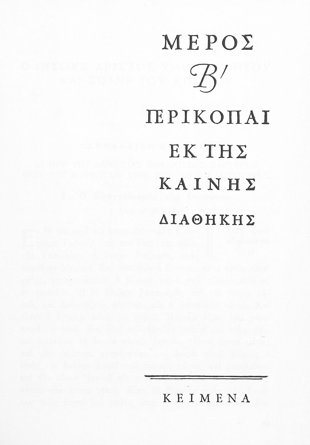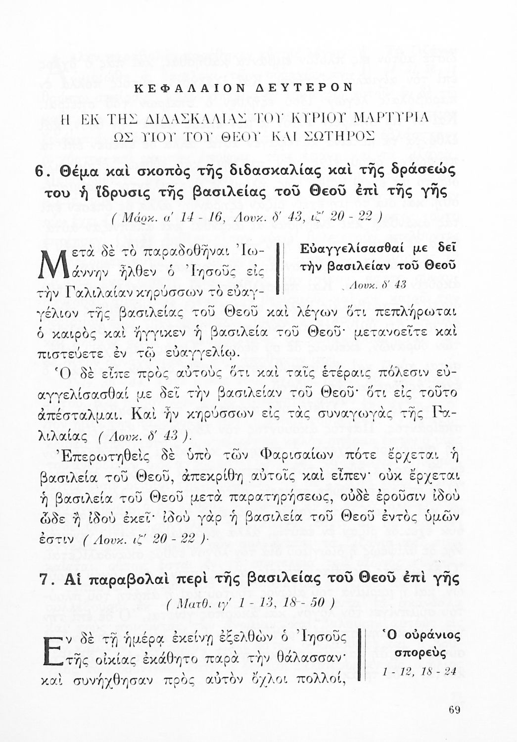 Σχολικό εγχειρίδιο Θρησκευτικών που περιλαμβάνει εισαγωγικά σχόλια στα βιβλία της Παλαιάς και Καινής Διαθήκης, περικοπές, ερμηνευτικές και πραγματολογικές σημειώσεις και πίνακα με τα κυριότερα ονόματα. Φέρει το σύμβολο της δικτατορίας.