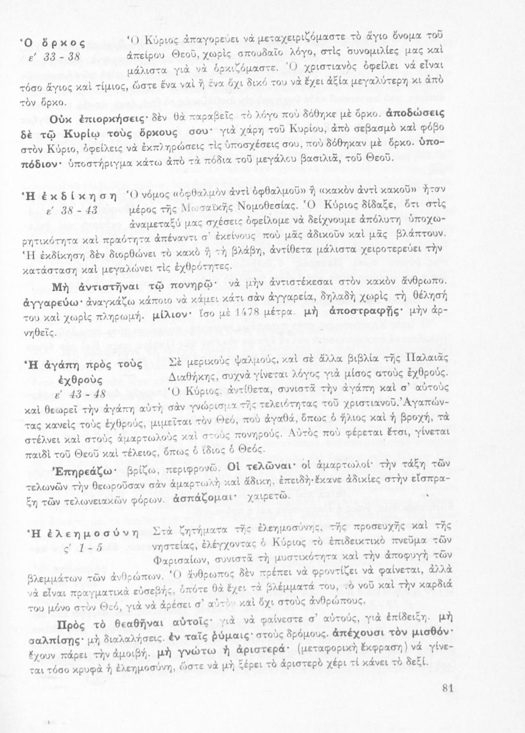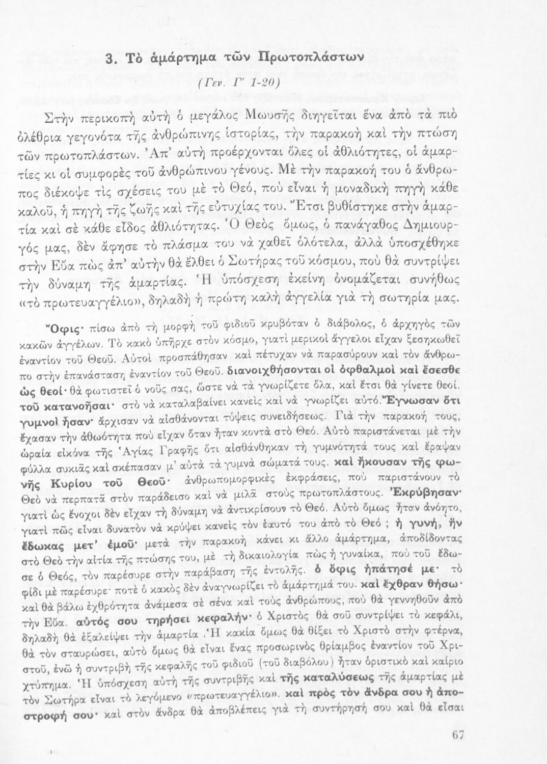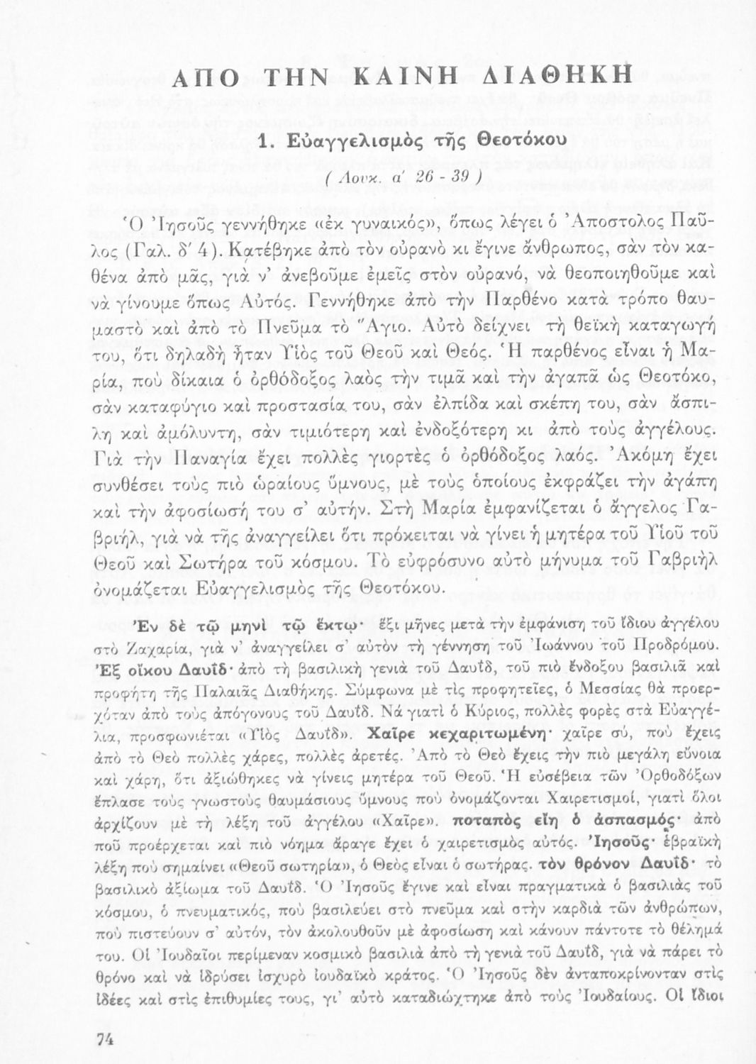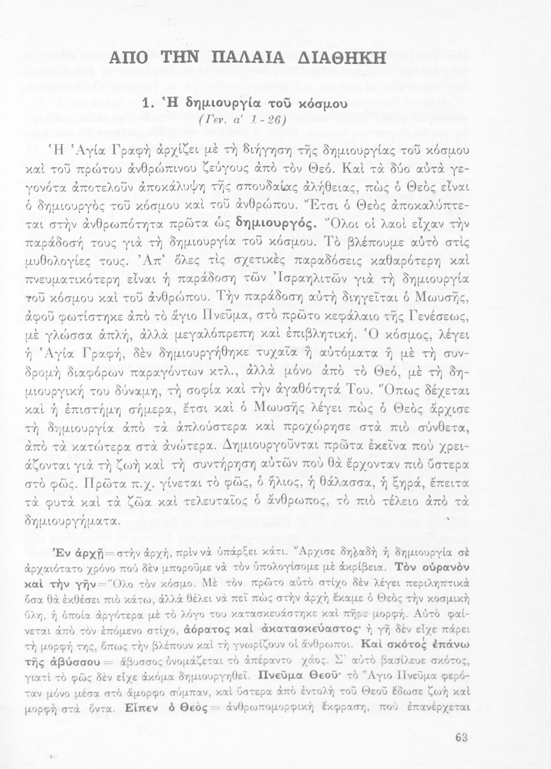Σχολικό εγχειρίδιο Θρησκευτικών που περιλαμβάνει εισαγωγικά σχόλια στα βιβλία της Παλαιάς και Καινής Διαθήκης, περικοπές, ερμηνευτικές και πραγματολογικές σημειώσεις και πίνακα με τα κυριότερα ονόματα.