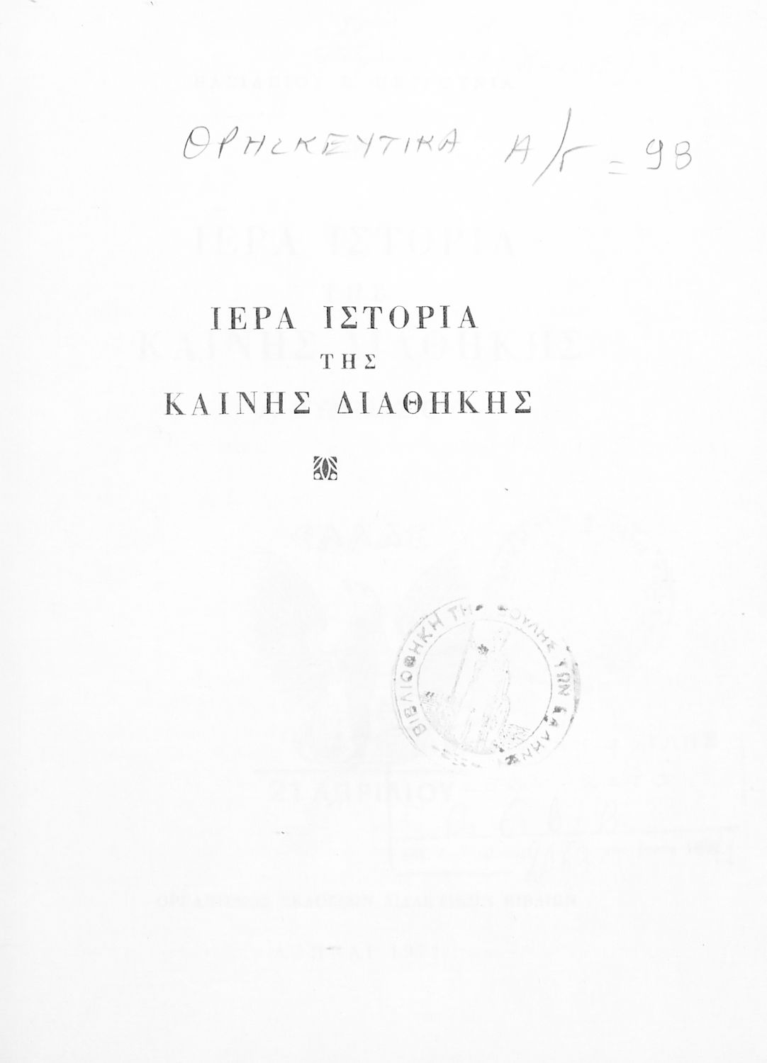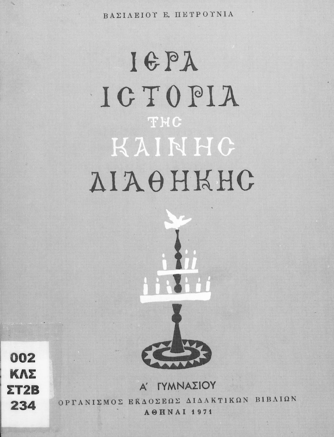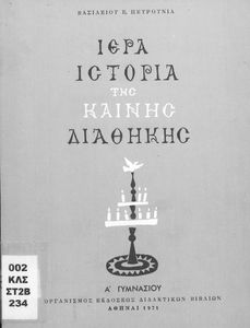 Βαθμίδα εκπαίδευσης: Δευτεροβάθμια Τάξη: Α' Γυμνασίου Μάθημα: Θρησκευτικά Γλώσσα: Καθαρεύουσα Παρουσίαση περιεχομένου: Σχολικό Εγχειρίδιο Θρησκευτικών της Α' Γυμνασίου που συνιστά μία εξιστόρηση της Καινής Διαθήκης από τη γέννηση της Θεοτόκου ως την ανάληψη του Χριστού. |