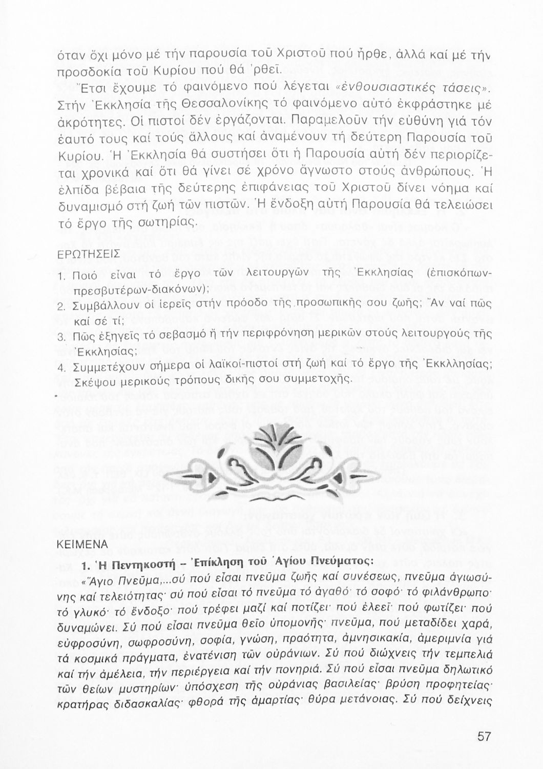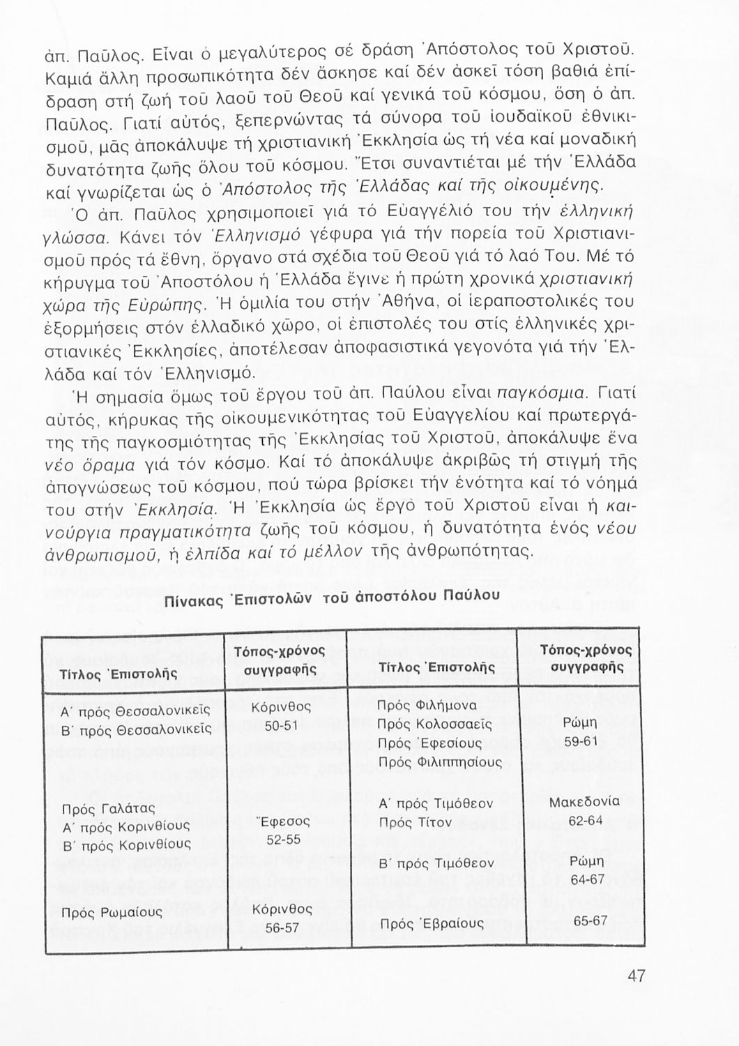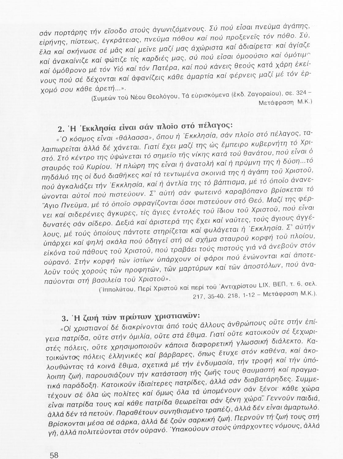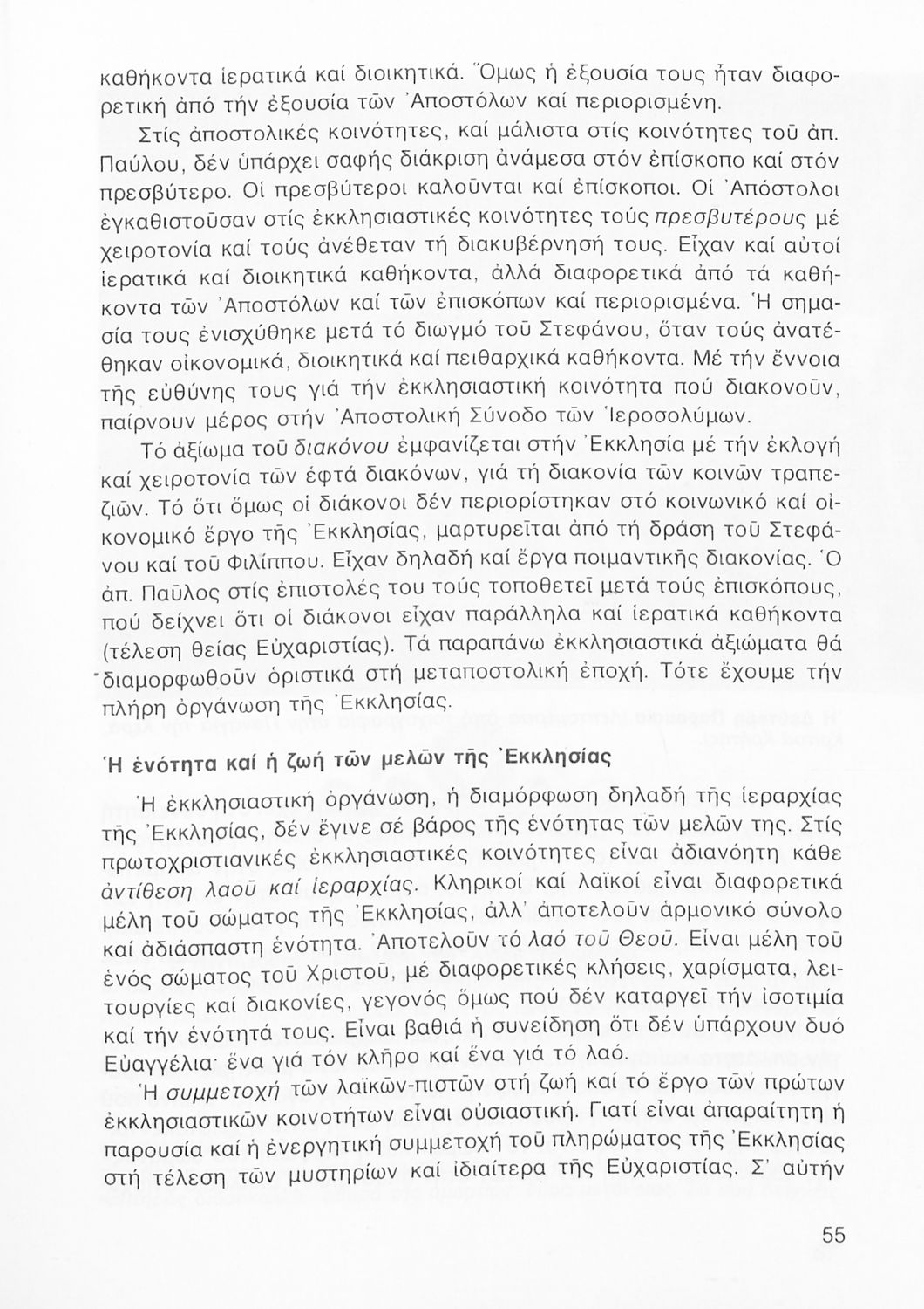 Σχολικό εγχειρίδιο Θρησκευτικών της Β' Γυμνασίου. Το βιβλίο περιγράφει την σύσταση και την εξάπλωση της χριστιανικής εκκλησίας από την πρώτη εκκλησιαστική κοινότητα των Ιεροσολύμων και το έργο των αποστόλων για την εδραίωσή της. Στη συνέχεια περιγράφει τη μορφή της κατά τα ρωμαϊκά χρόνια και το Βυζάντιο και αναλύει το σχίσμα και τη μεταρρύθμιση. Τέλος εστιάζει στη εκκλησία της Ελλάδος και το ρόλο της στους αγώνες του ελληνικού έθνους για απελευθέρωση.