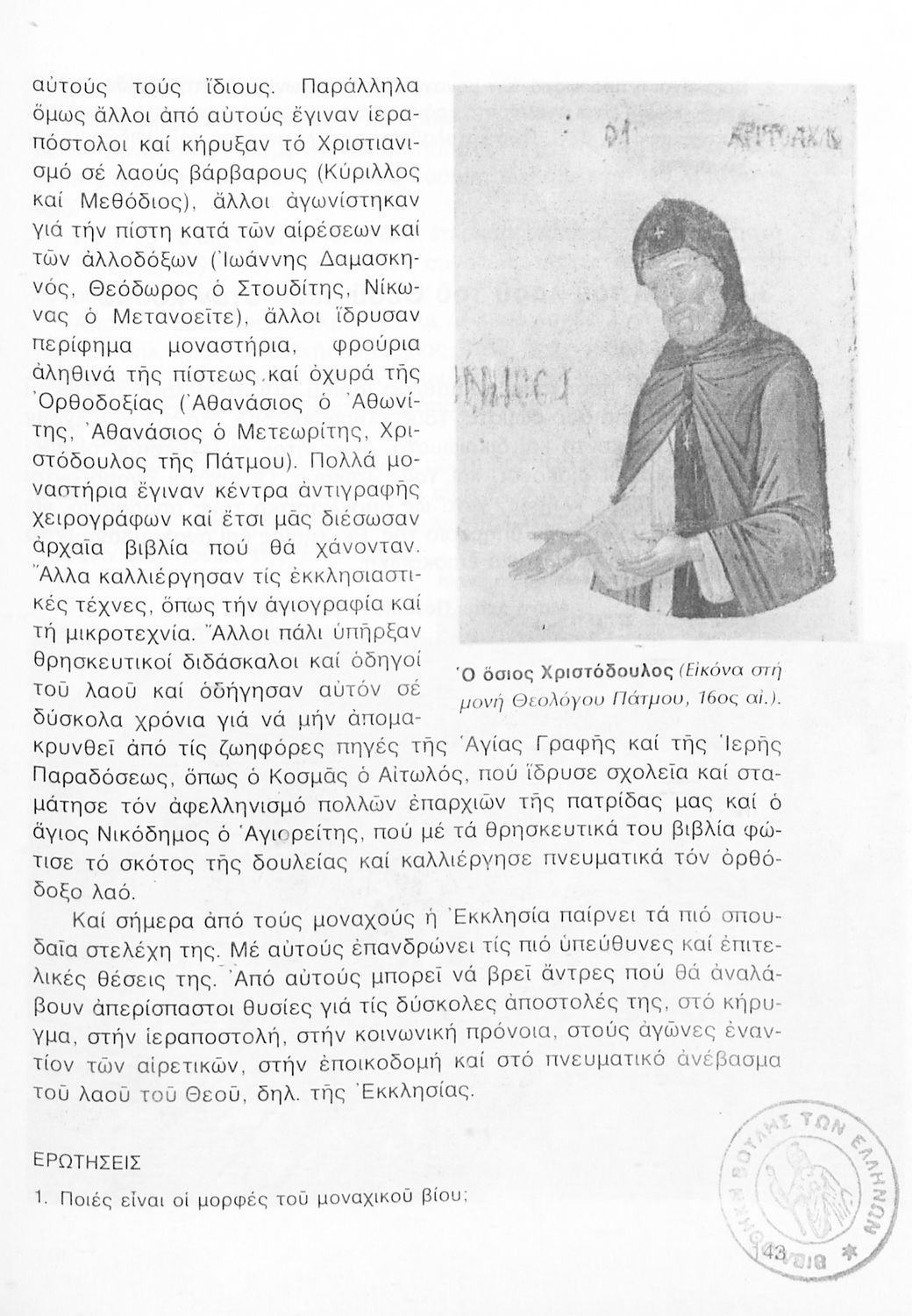 Βαθμίδα εκπαίδευσης: Δευτεροβάθμια Τάξη: Β' Γυμνασίου Μάθημα: Θρησκευτικά Γλώσσα: Δημοτική Παρουσίαση περιεχομένου: Σχολικό εγχειρίδιο για την Β΄ Γυμνασίου για το μάθημα των Θρησκευτικών. Το εγχειρίδιο περιλαμβάνει γενικές πληροφορίες για την εκκλησιαστική ιστορία, την εκκλησία των Αποστόλων, των μαρτύρων, των Συνόδων, την ενότητα της εκκλησίας, την ιστορία της ορθόδοξης ανατολικής εκκλησίας από το Σχίσμα και μετά την απελευθέρωση. |