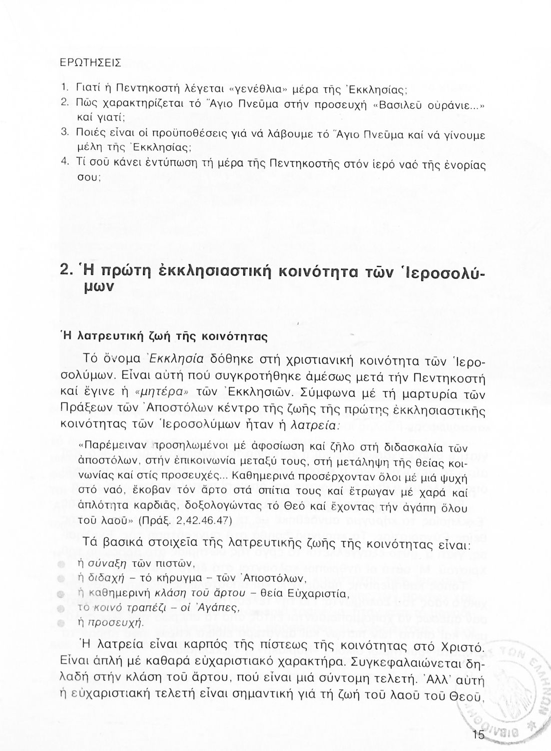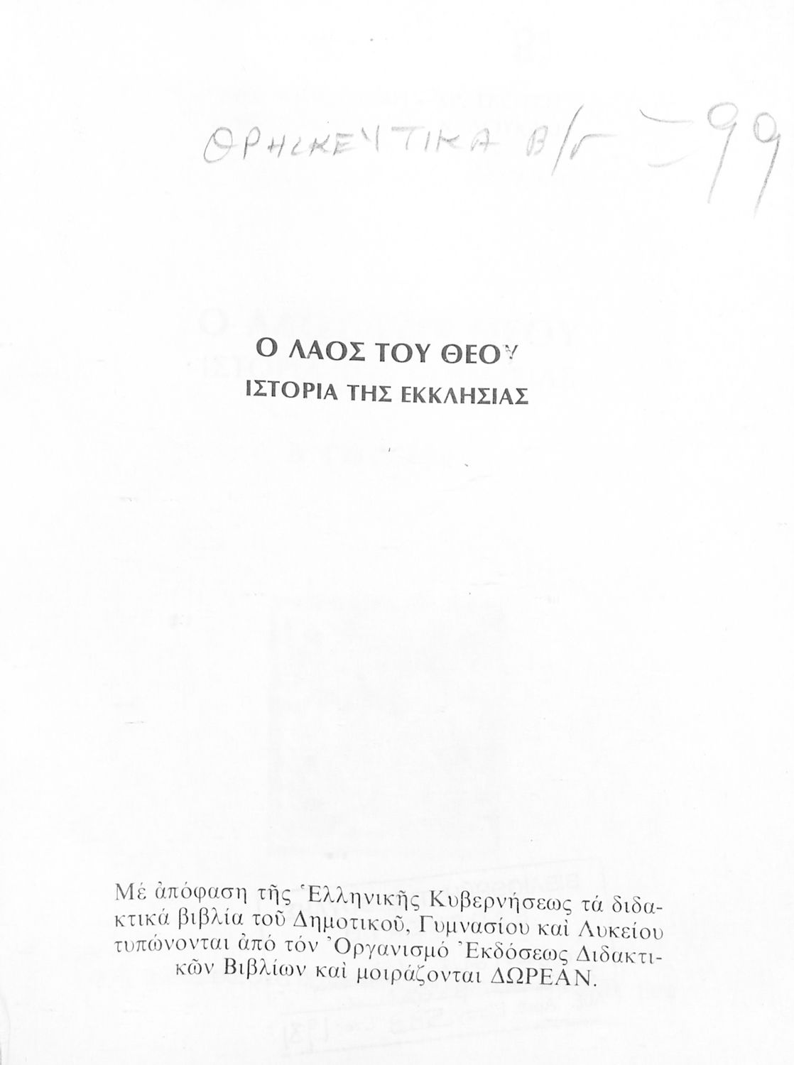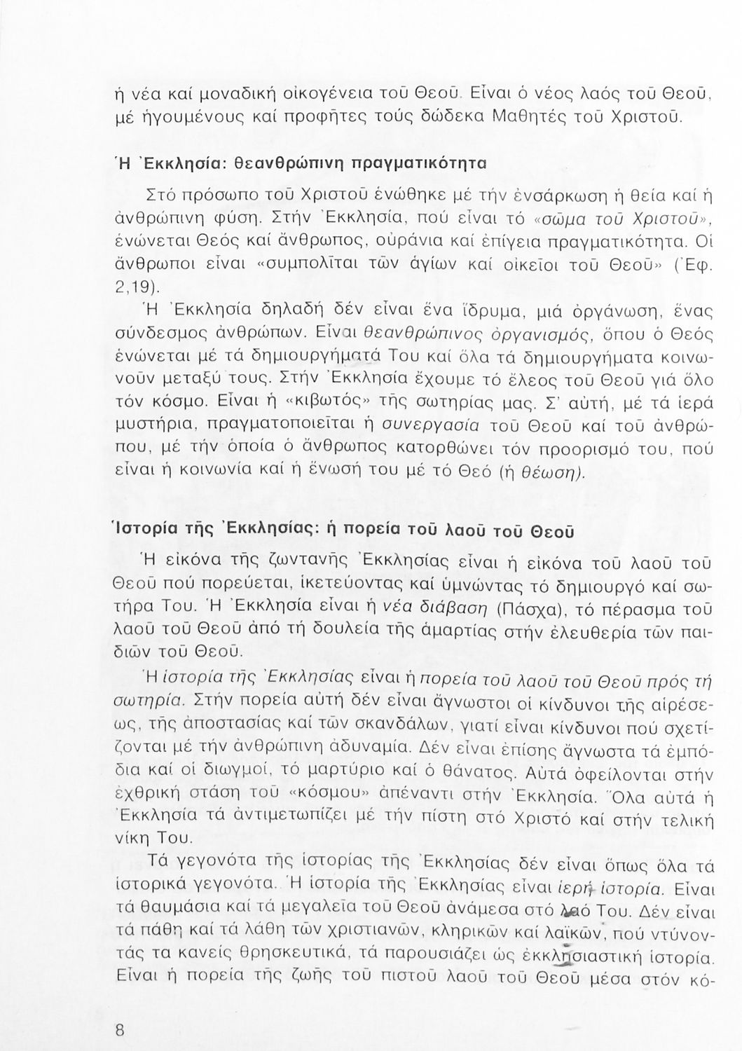 Σχολικό εγχειρίδιο για την Β΄ Γυμνασίου για το μάθημα των Θρησκευτικών. Το εγχειρίδιο περιλαμβάνει γενικές πληροφορίες για την εκκλησιαστική ιστορία, την εκκλησία των Αποστόλων, των μαρτύρων, των Συνόδων, την ενότητα της εκκλησίας, την ιστορία της ορθόδοξης ανατολικής εκκλησίας από το Σχίσμα και μετά την απελευθέρωση.