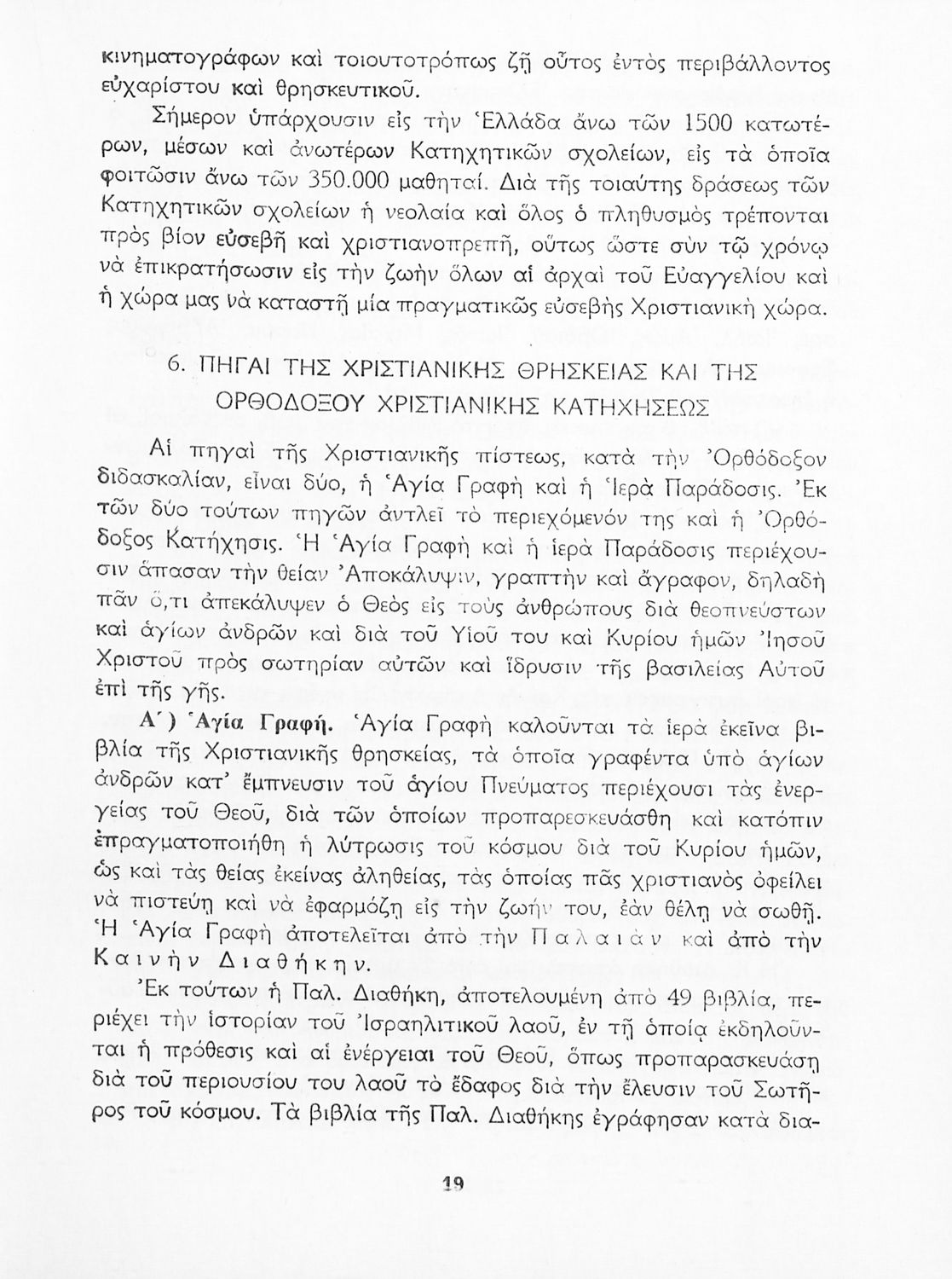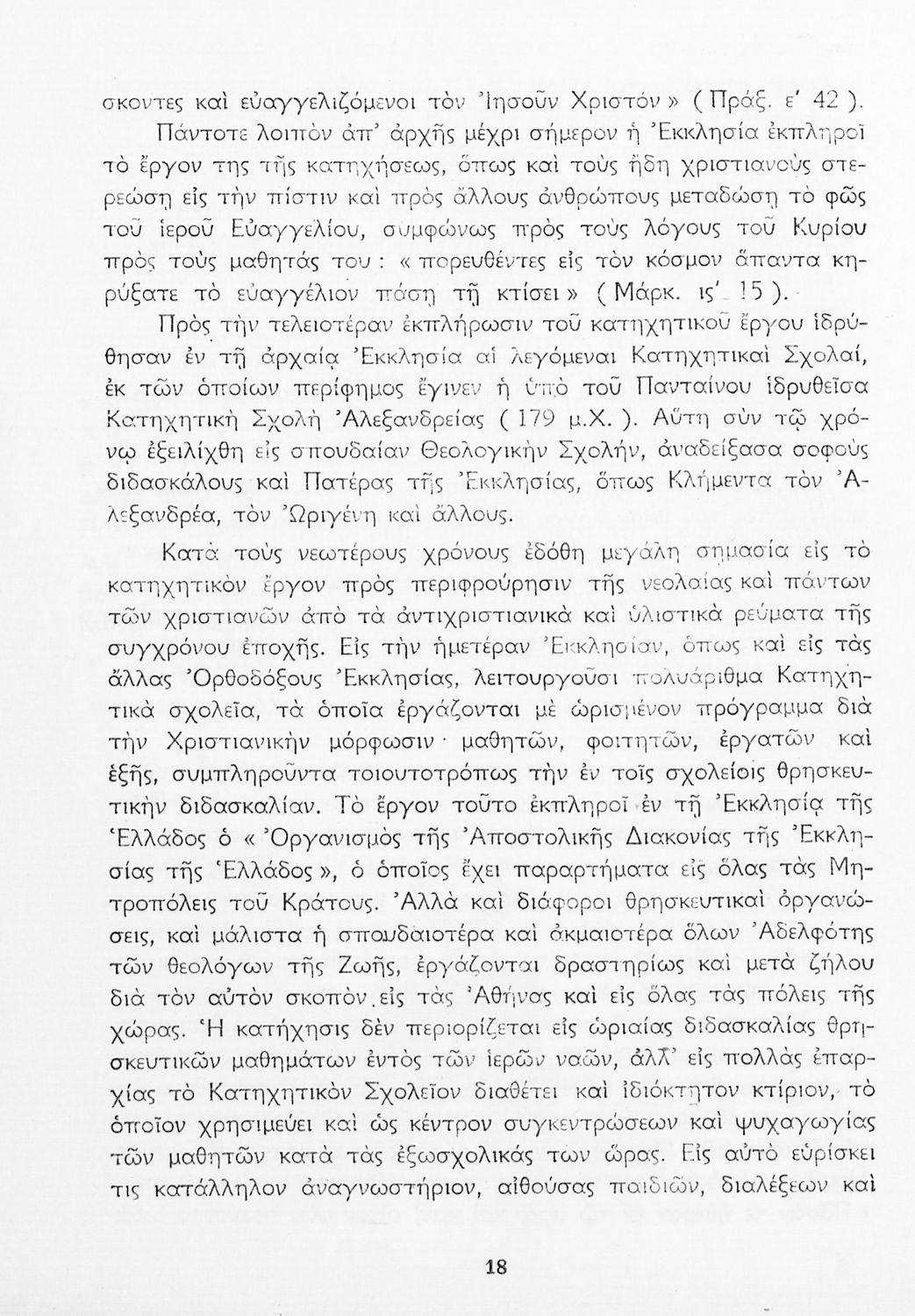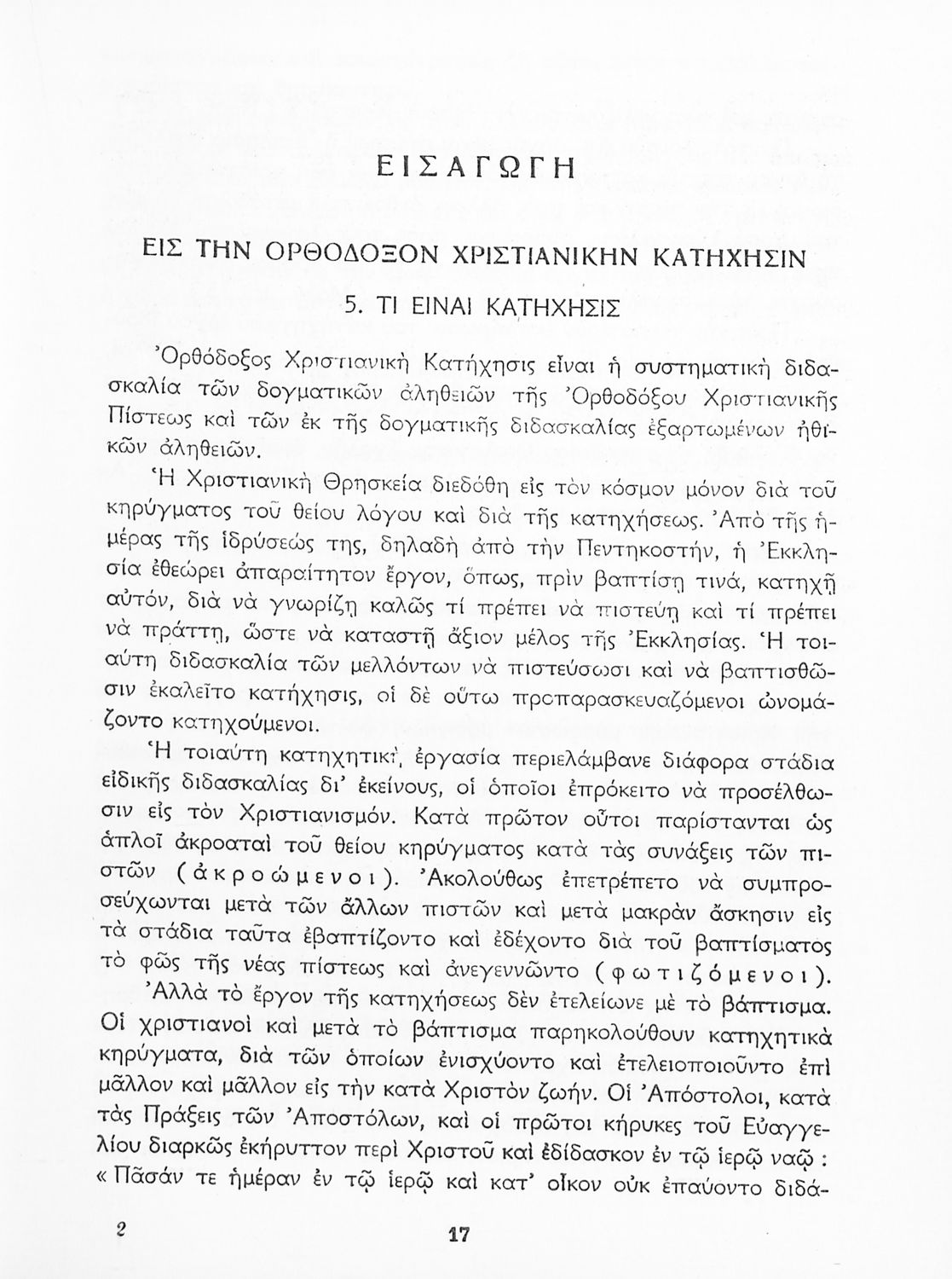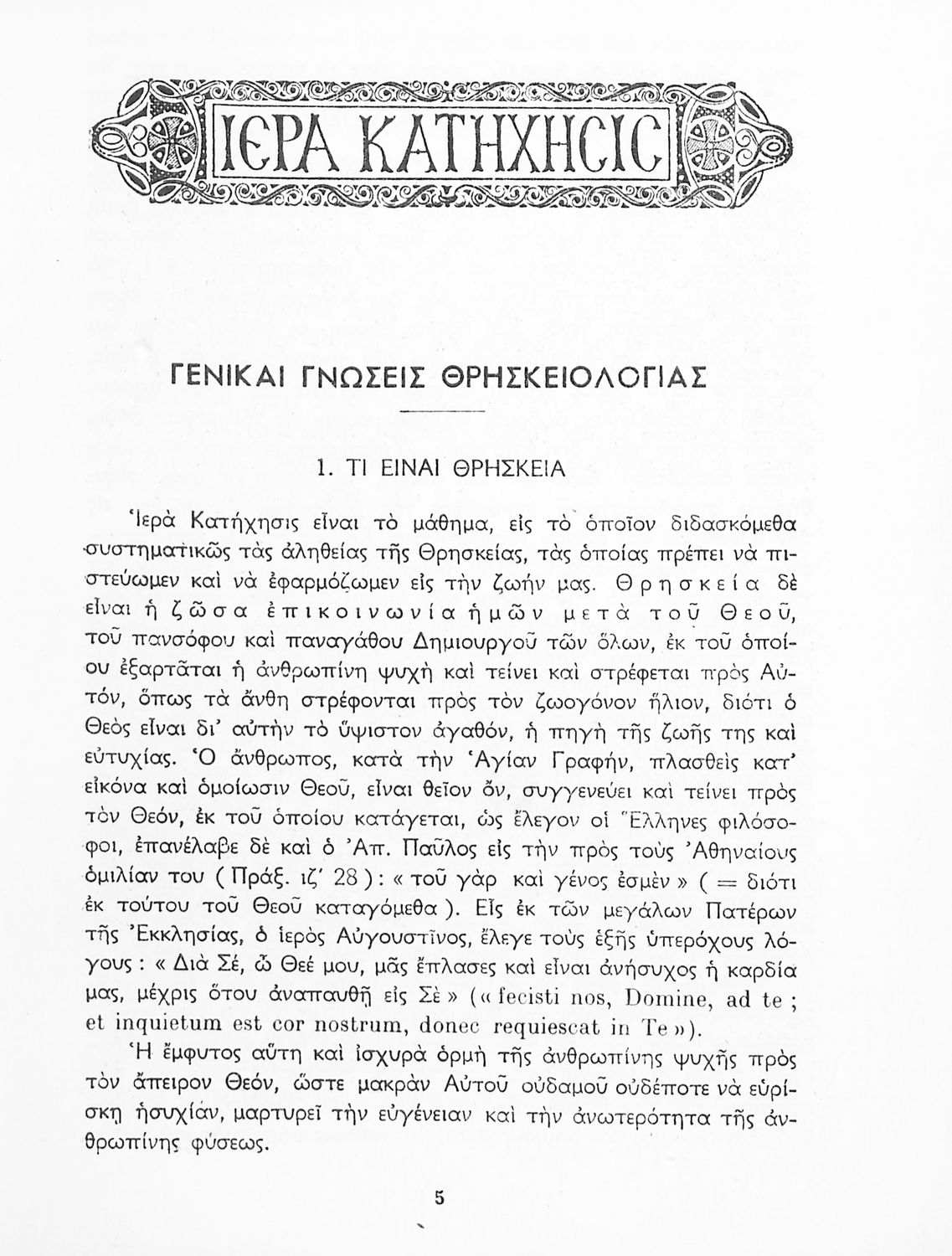 Σχολικό εγχειρίδιο Θρησκευτικών Ε' Γυμνασίου που αναλύει την έννοια της κατήχησης στις διάφορες θρησκείες με έμφαση στο ορθόδοξο χριστιανικό δόγμα, το οποίο εξετάζει από δογματική και ηθική σκοπιά. Περιλαμβάνει και στοιχεία λειτουργικής της Ορθόδοξης Εκκλησίας. Περιέχονται εκκλησιαστικοί ύμνοι και προσευχές. Φέρει το σύμβολο της δικτατορίας.