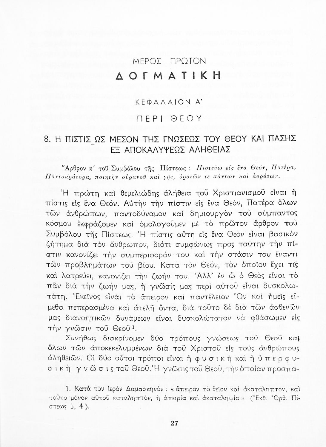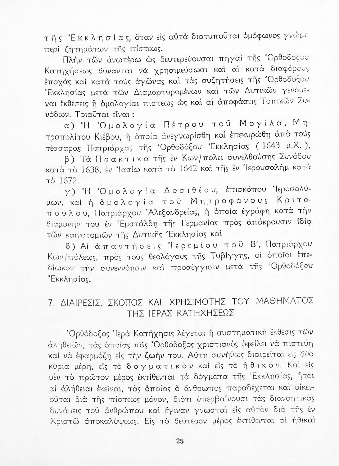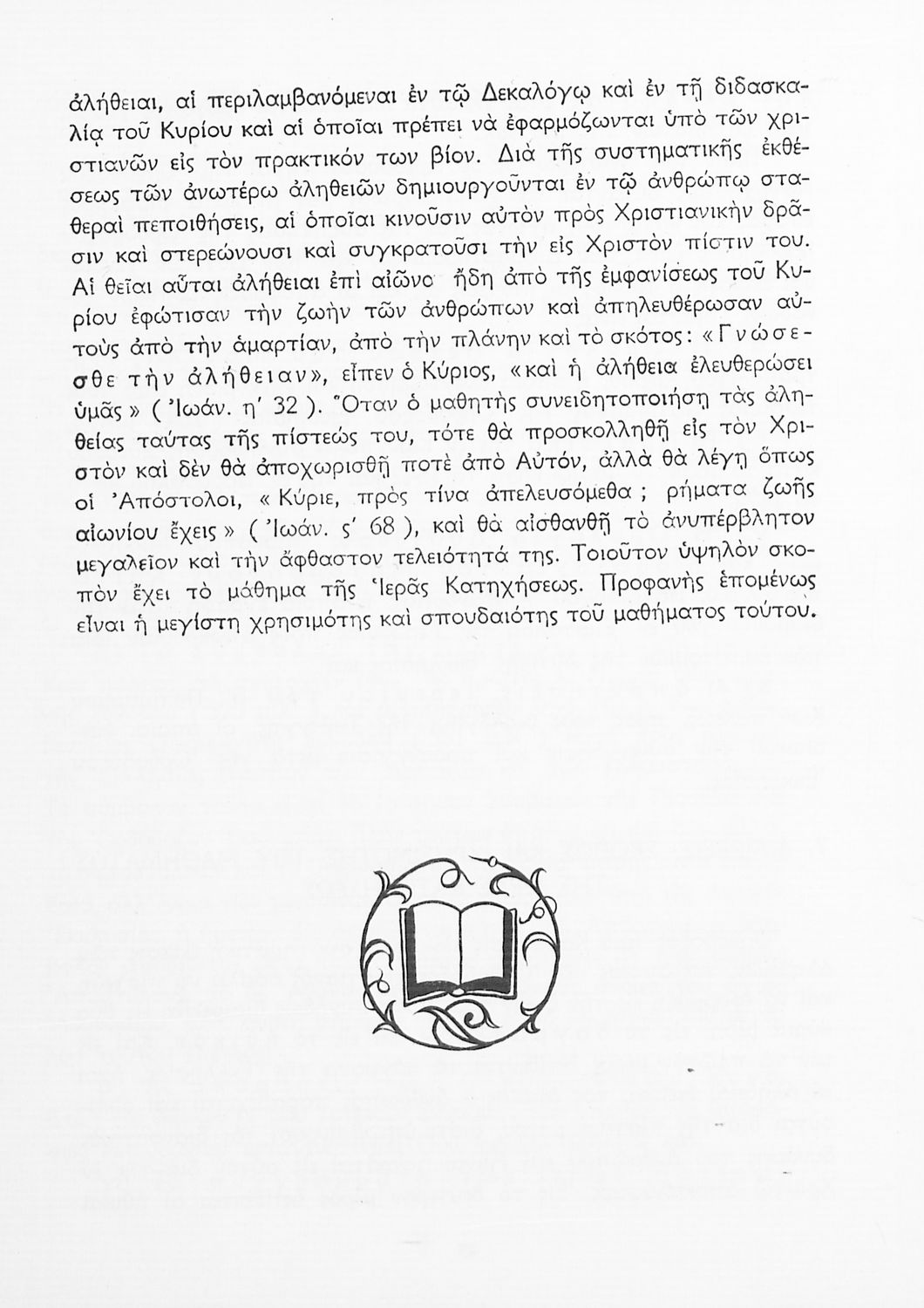 Σχολικό εγχειρίδιο Θρησκευτικών που αναλύει την έννοια της κατήχησης στις διάφορες θρησκείες με έμφαση στο ορθόδοξο χριστιανικό δόγμα, το οποίο εξετάσει από δογματική και ηθική σκοπιά. Περιλαμβάνει και στοιχεία λειτουργικής της Ορθόδοξης Εκκλησίας. Περιέχονται εκκλησιαστικοί ύμνοι και προσευχές. Φέρει το σύμβολο της δικτατορίας.